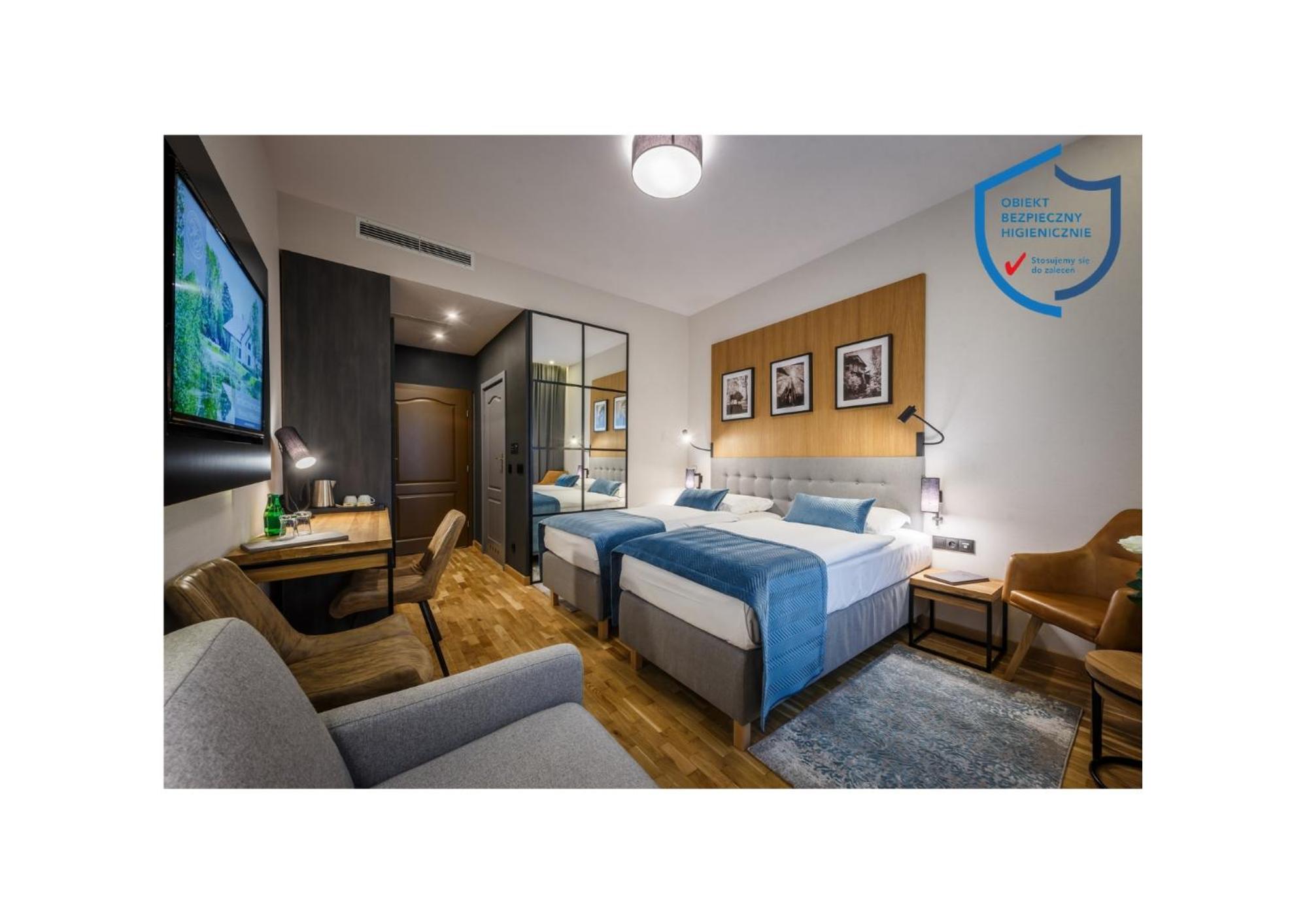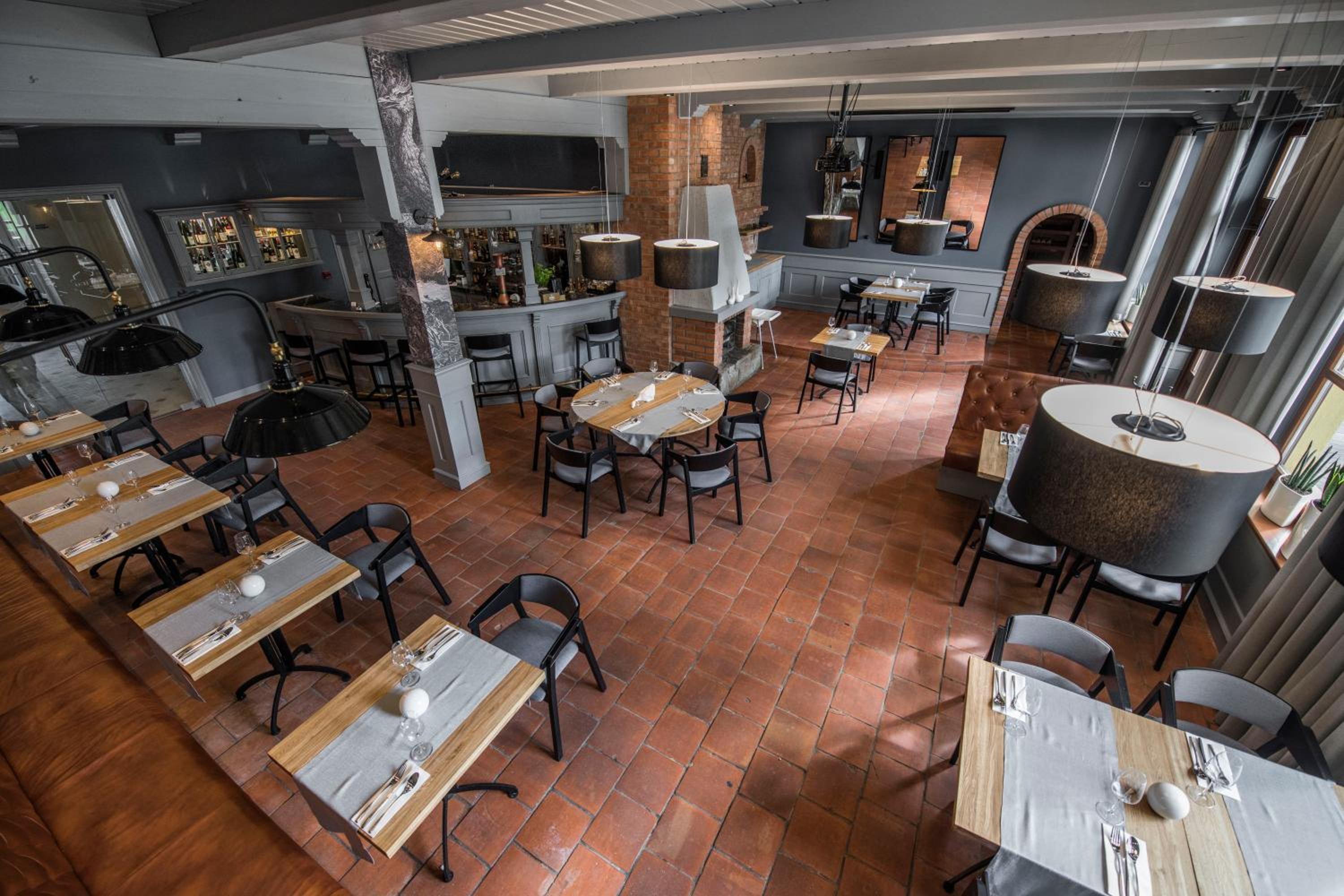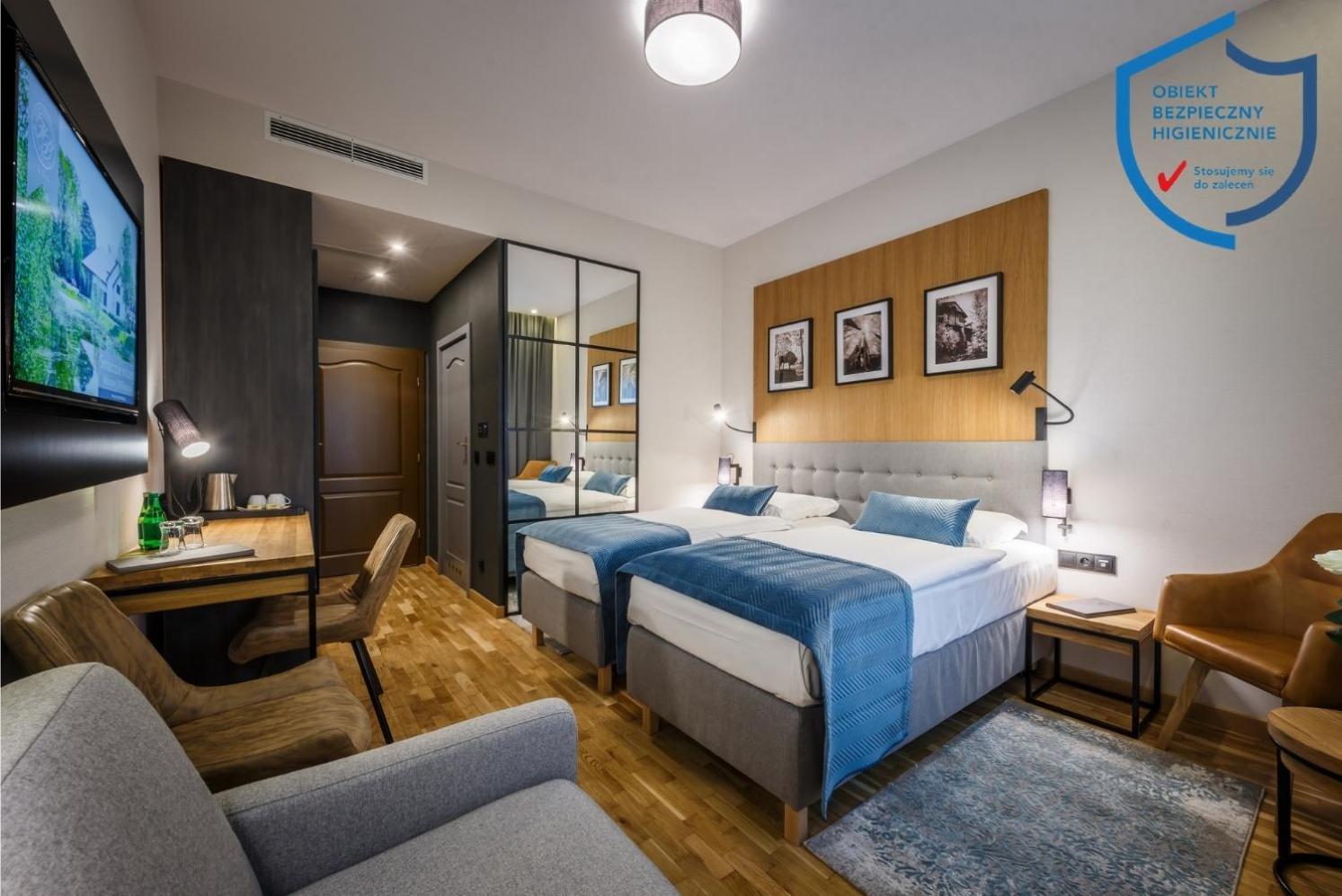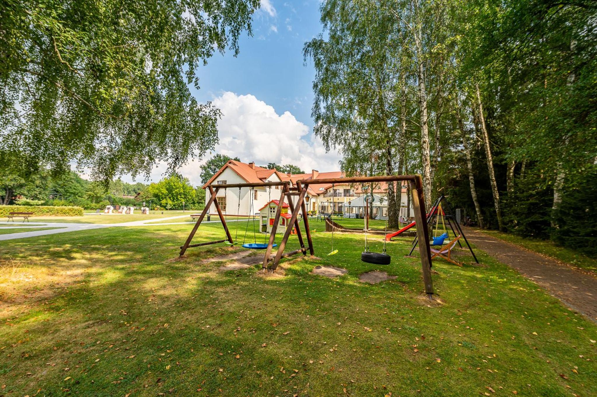 Indulge in relaxation at the hotel's fitness center, equipped with a sauna and offering rejuvenating massage services. Unwind in the tranquil garden area with a charming pond or on the inviting terrace. For dining options, savor delectable Polish and international dishes at the modern restaurant, known for its smoked specialties prepared in-house. The cozy hotel bar is perfect for enjoying a fine selection of wines by the fireplace.