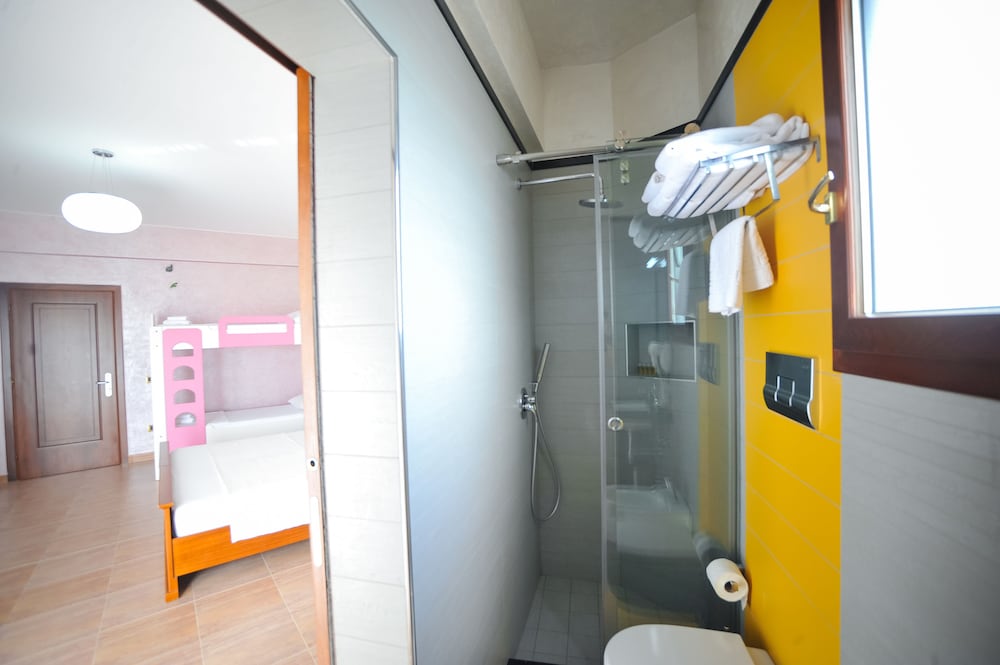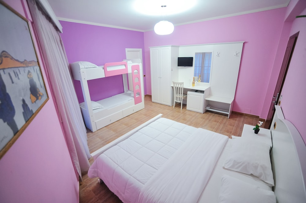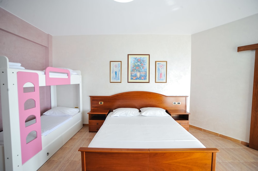 The hotel was very clean and brilliantly run. We had a family room which was very spacious with balcony and a nice big bunk bed. It has it’s own space on the beach and the gentleman was always very helpful to find us a nice spot. Linda at reception was amazing and arranged taxis and printed documents for us. We had wonderful service from Afrim, Leonard and Bayame at the restaurant and cafe. Food was delicious and good value for money. The sea is shallow and Sandy great for young kids. Really recommend for safe, clean and family friendly stay.