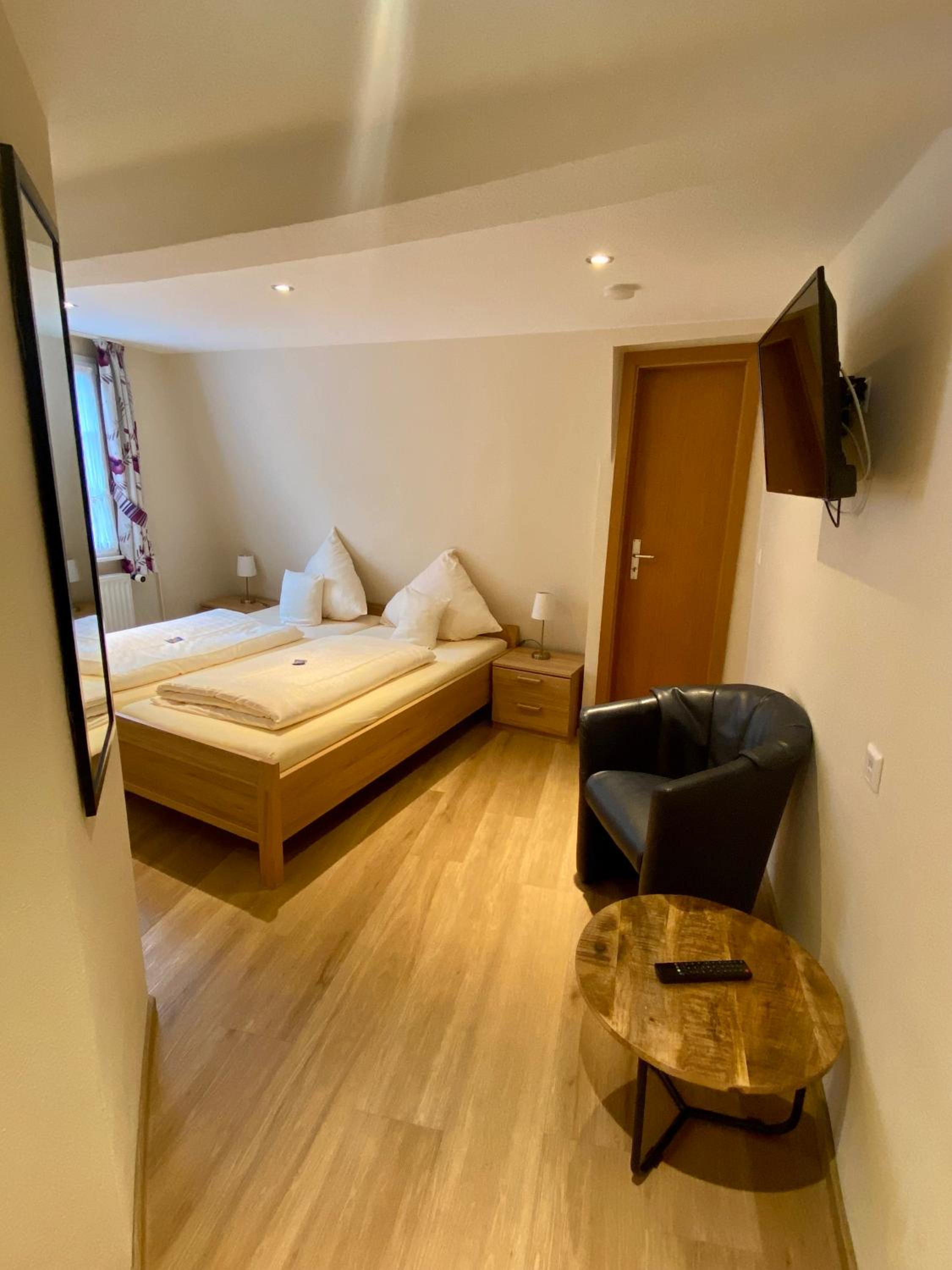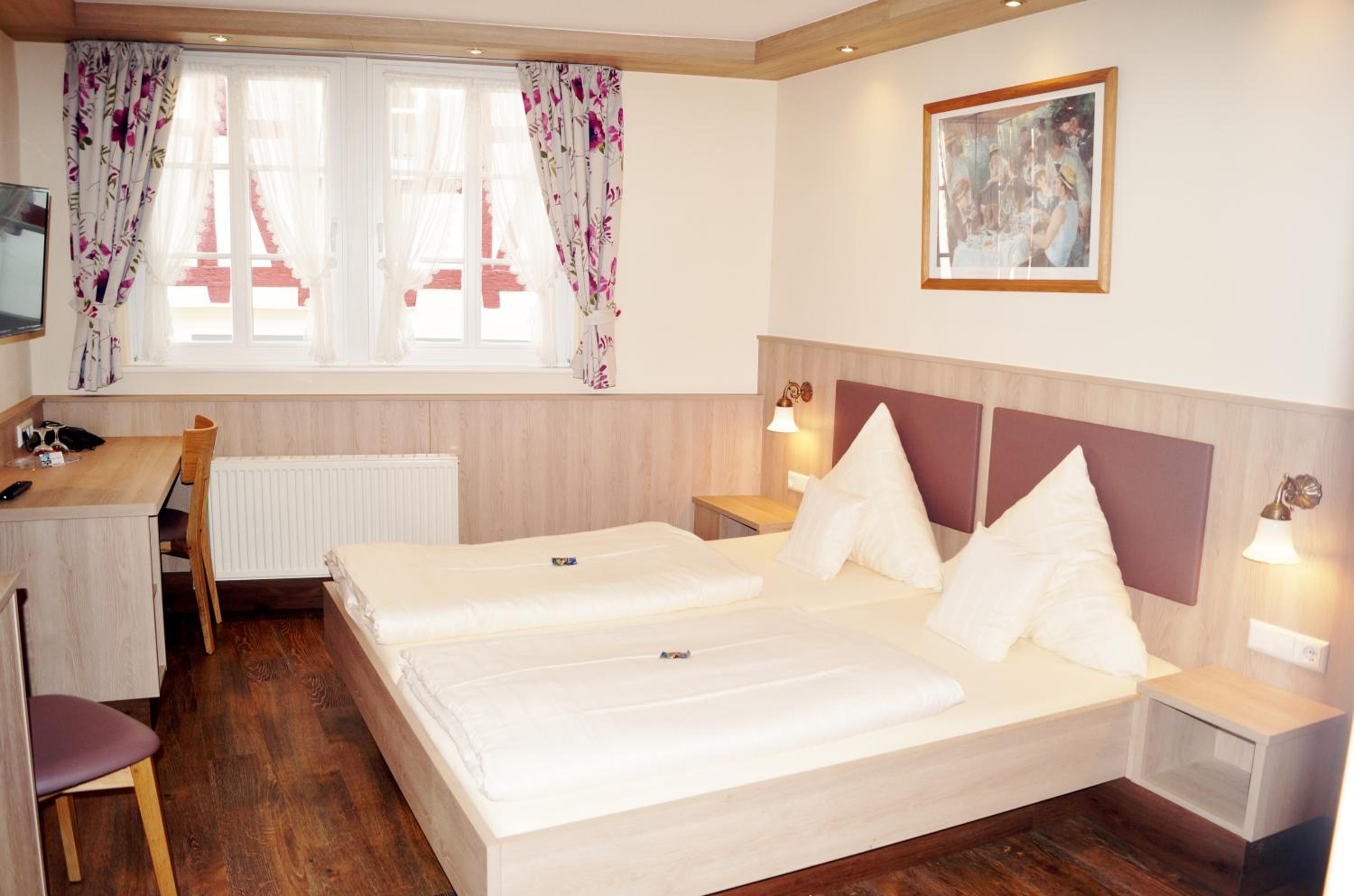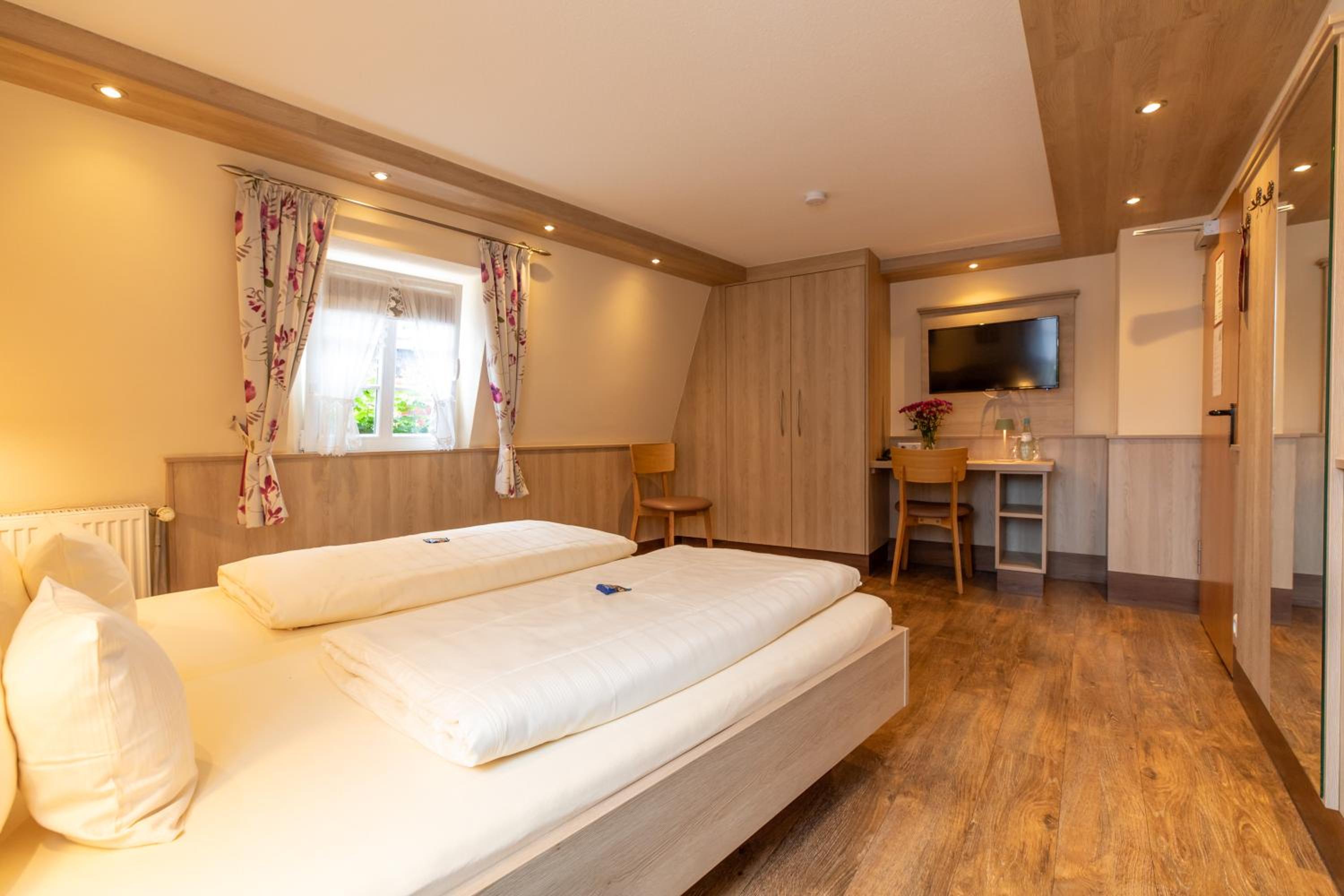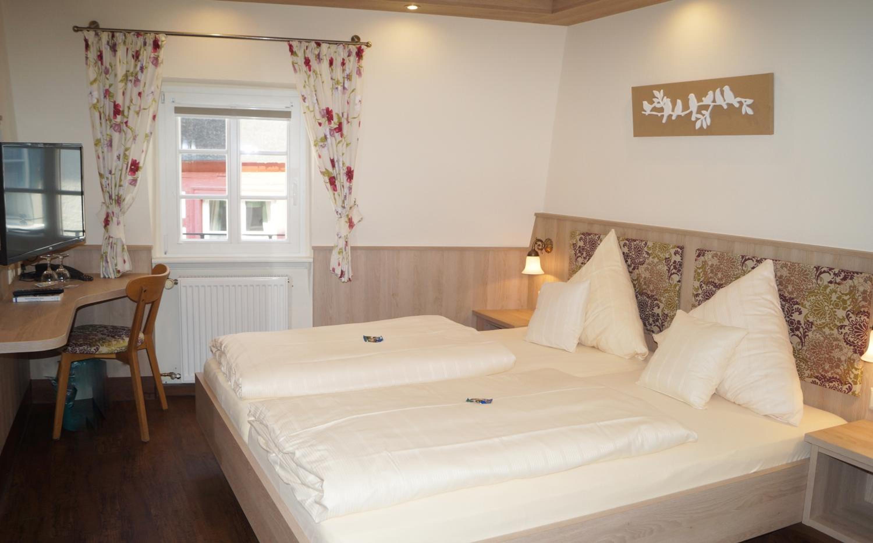 Rooms at Gute Quelle feature bright decor and comfortable wooden furniture, offering a cozy retreat. Enjoy entertainment with satellite TV and convenience with a private bathroom equipped with a hairdryer.