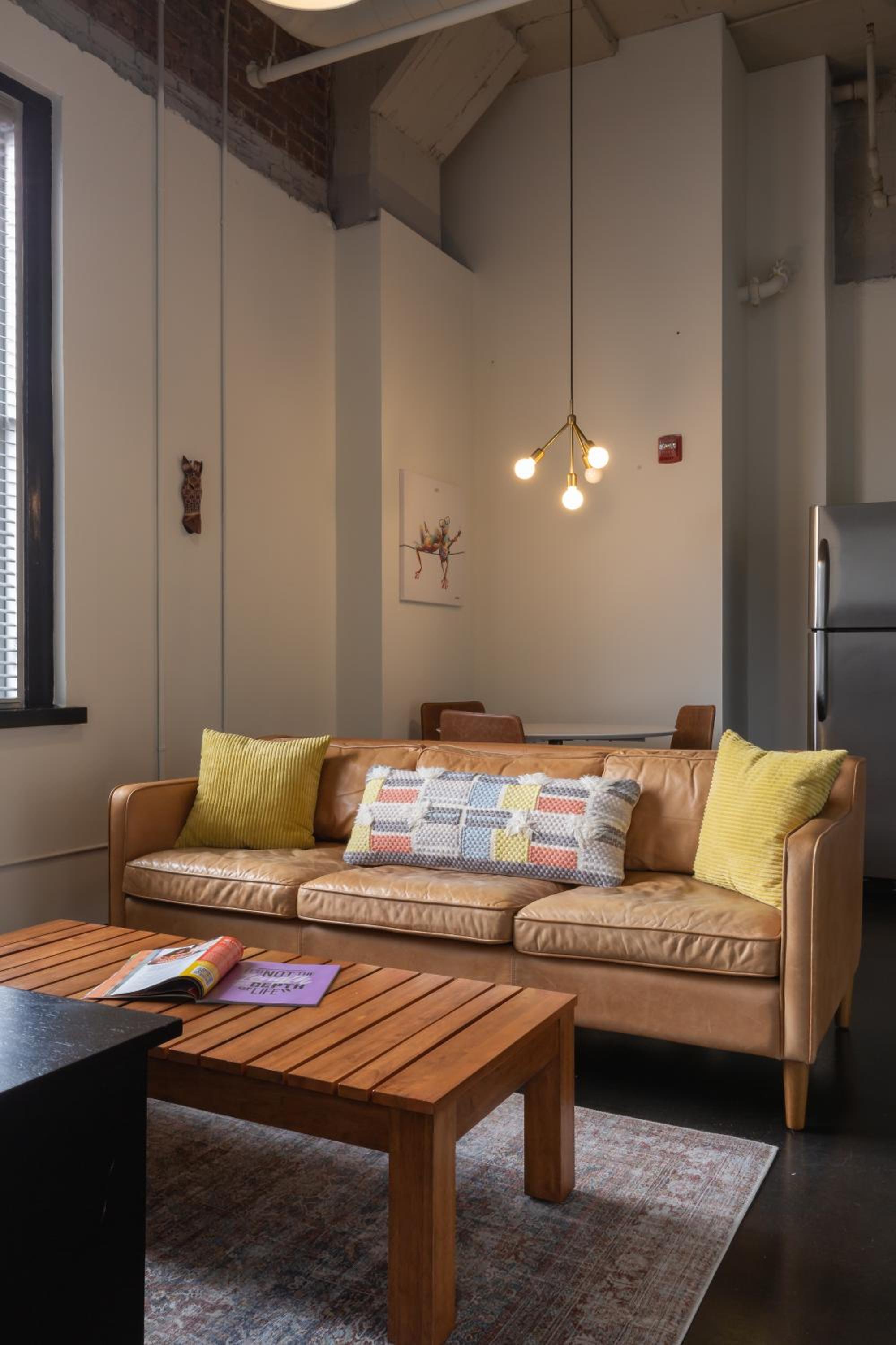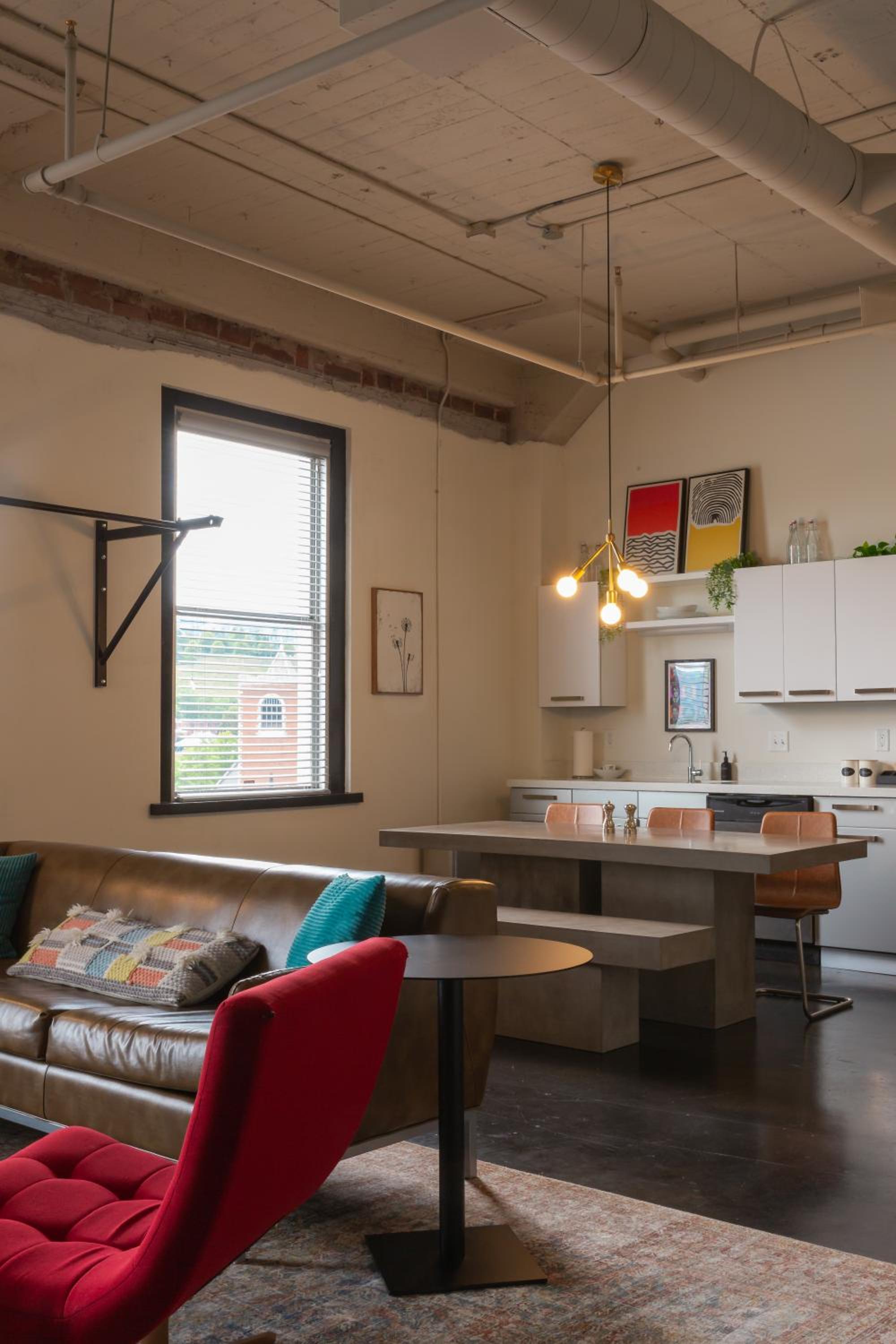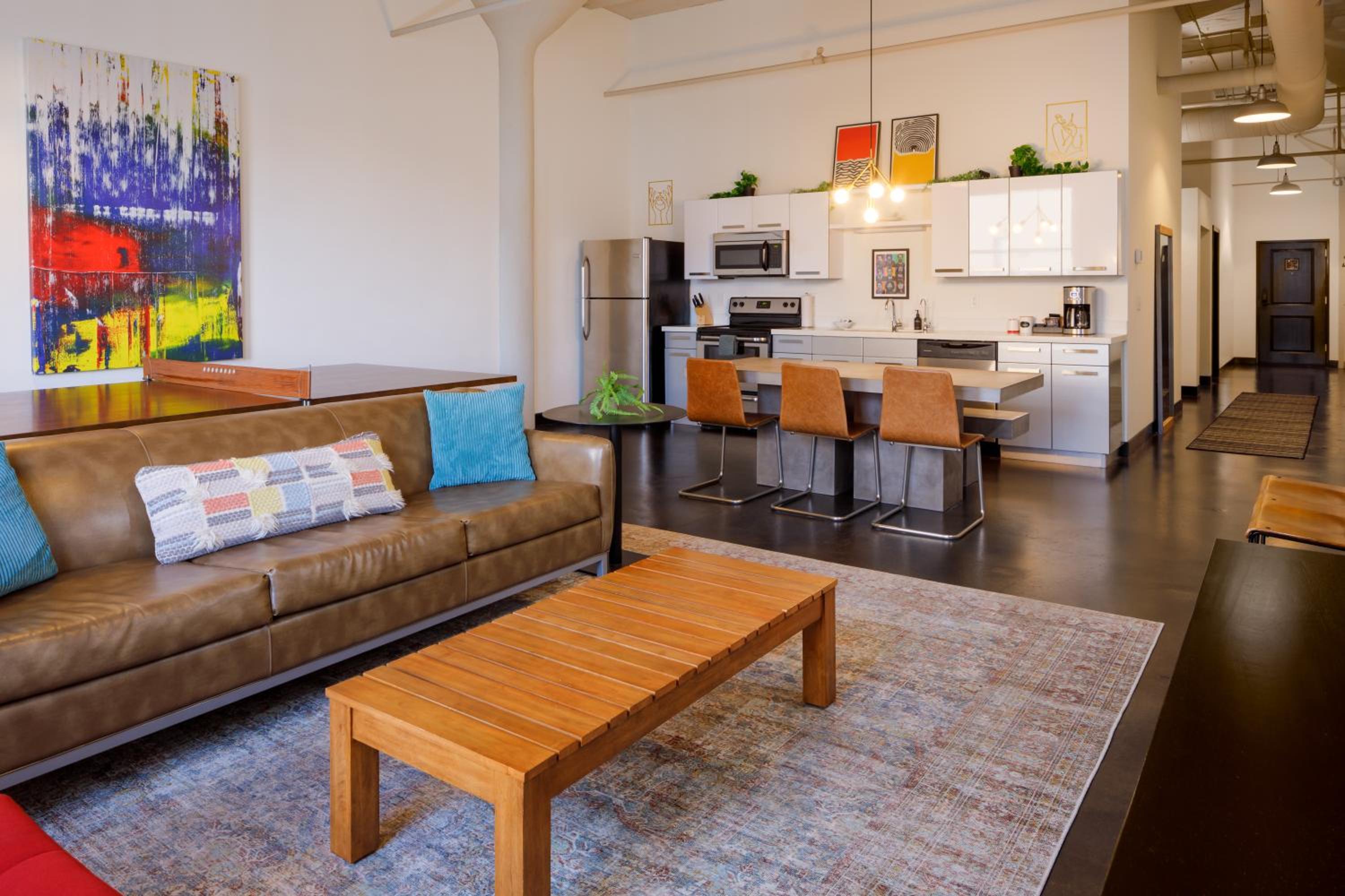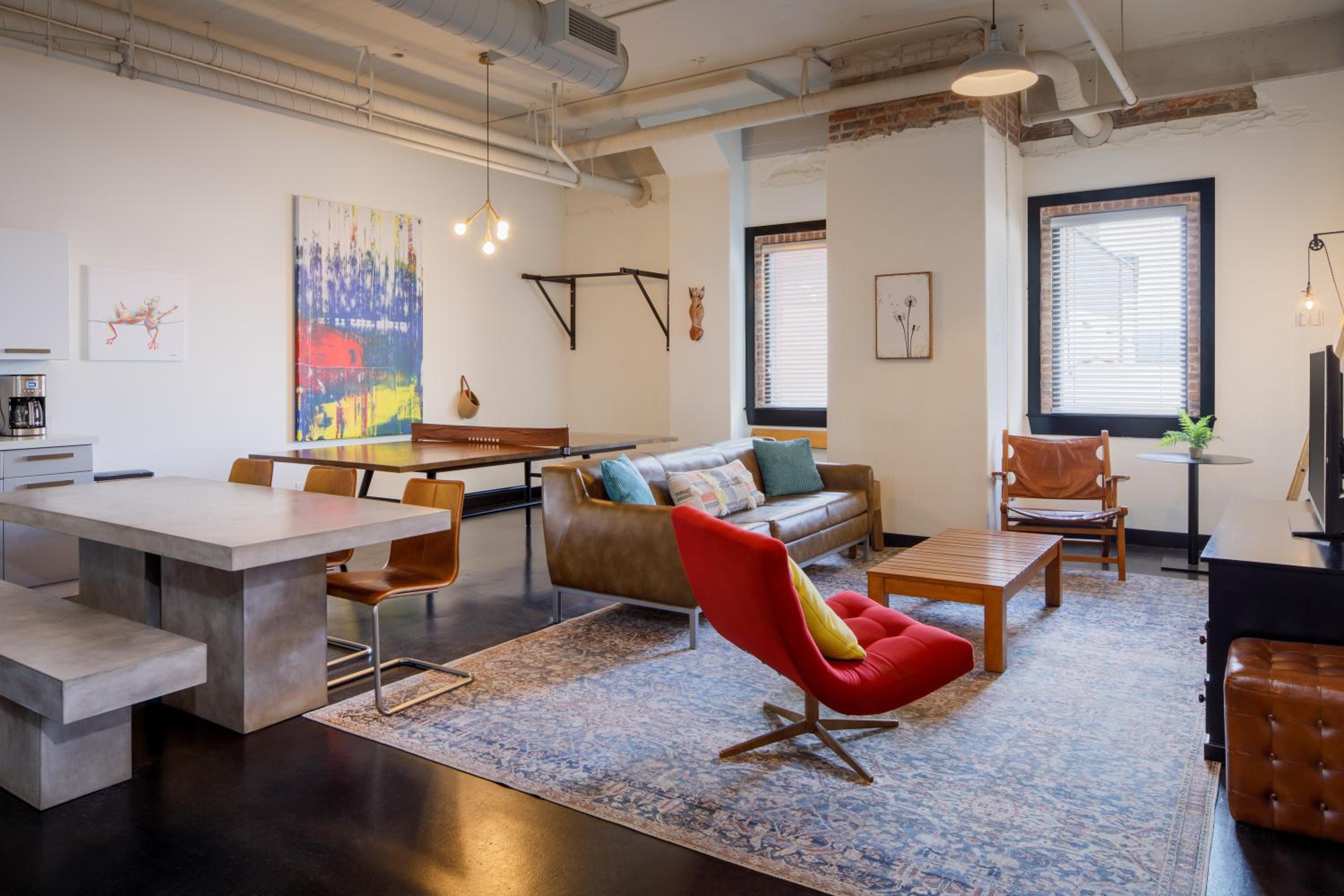 The vibe of the place was awesome. It was gigantic. Literally an ENTIRE apartment! Everything looked like NYC, modern industrial. It's amazing. Full kitchen with giant table with benches. There are dishes and pans and everything you need if you're staying there and want to eat home or have people over for dinner. There are super cool games, giant beds, just everything was amazing. Plus it was half a block from the memorial service I came for. Just perfect.