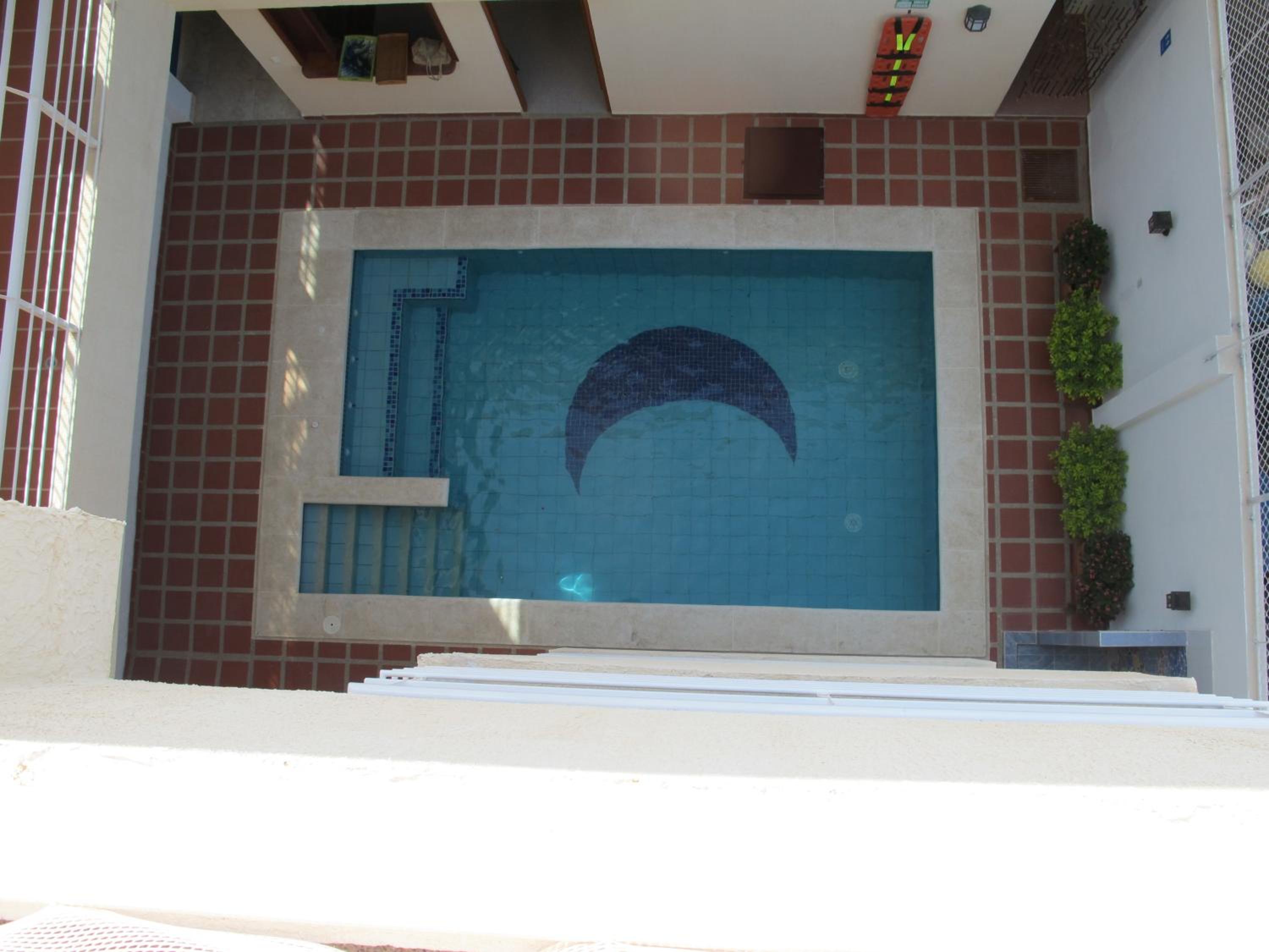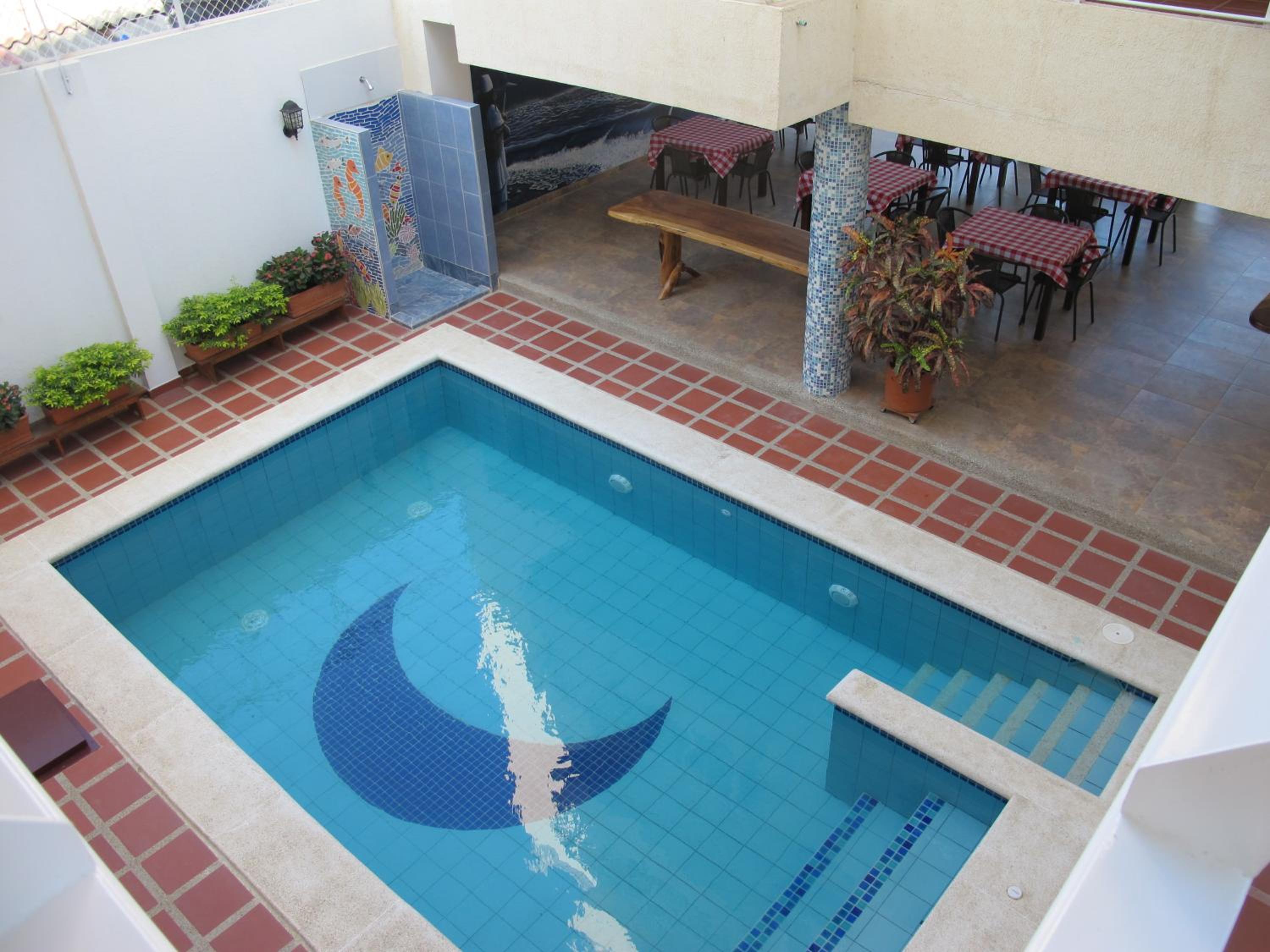 Casa Luna Hotel in Taganga boasts an inviting outdoor swimming pool surrounded by lush gardens, perfect for relaxation under the sun.