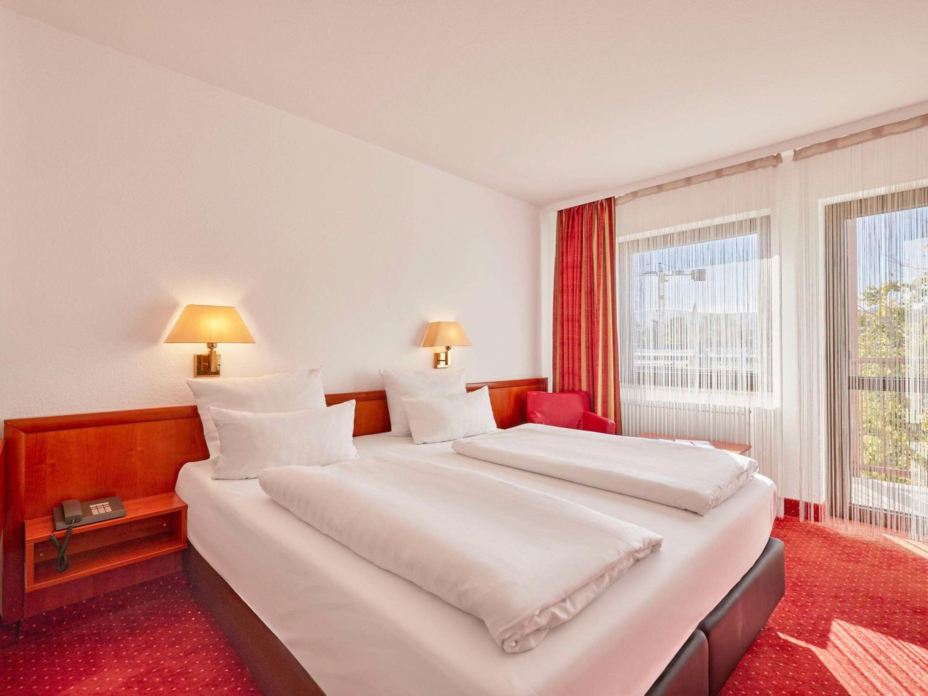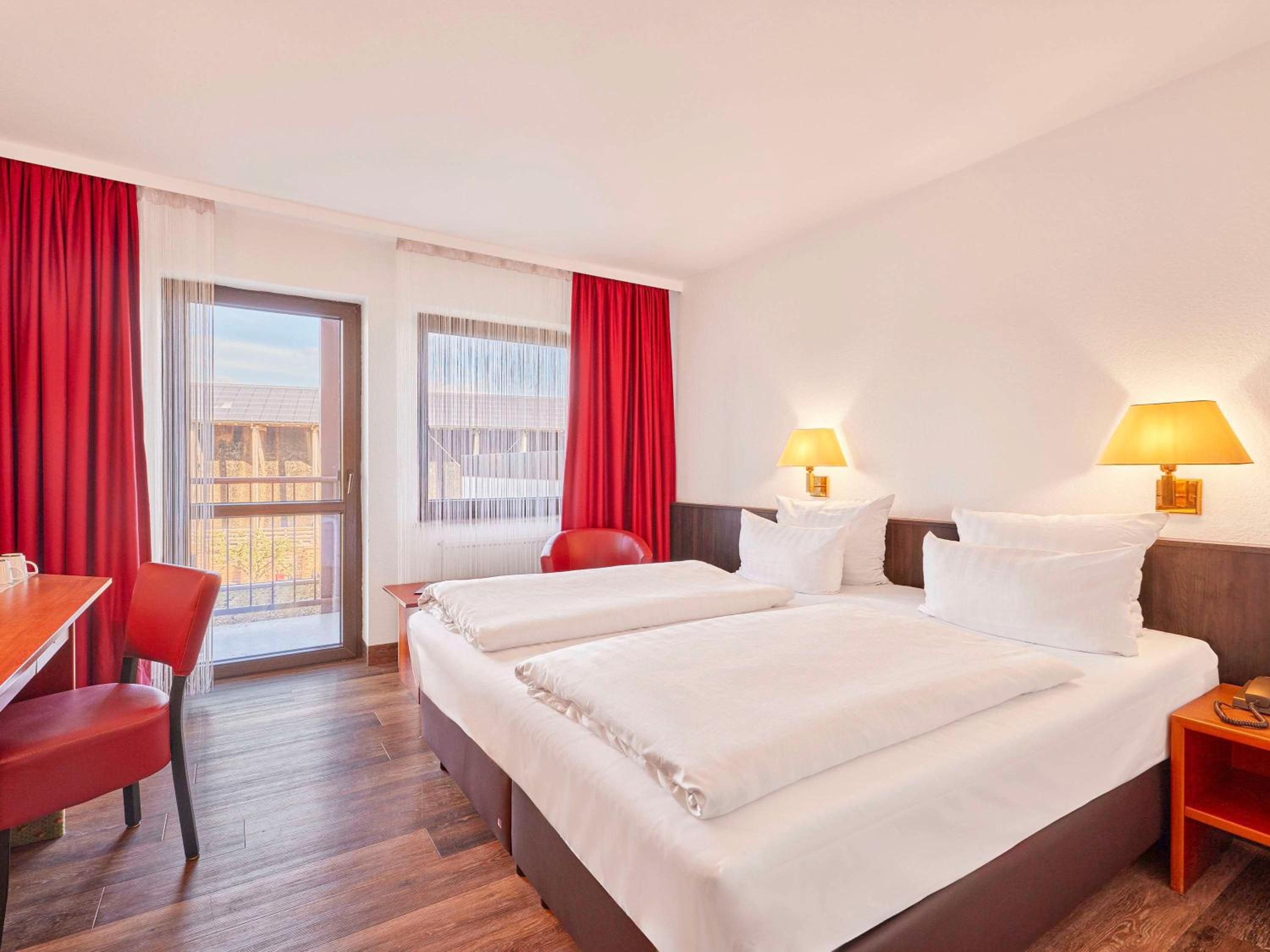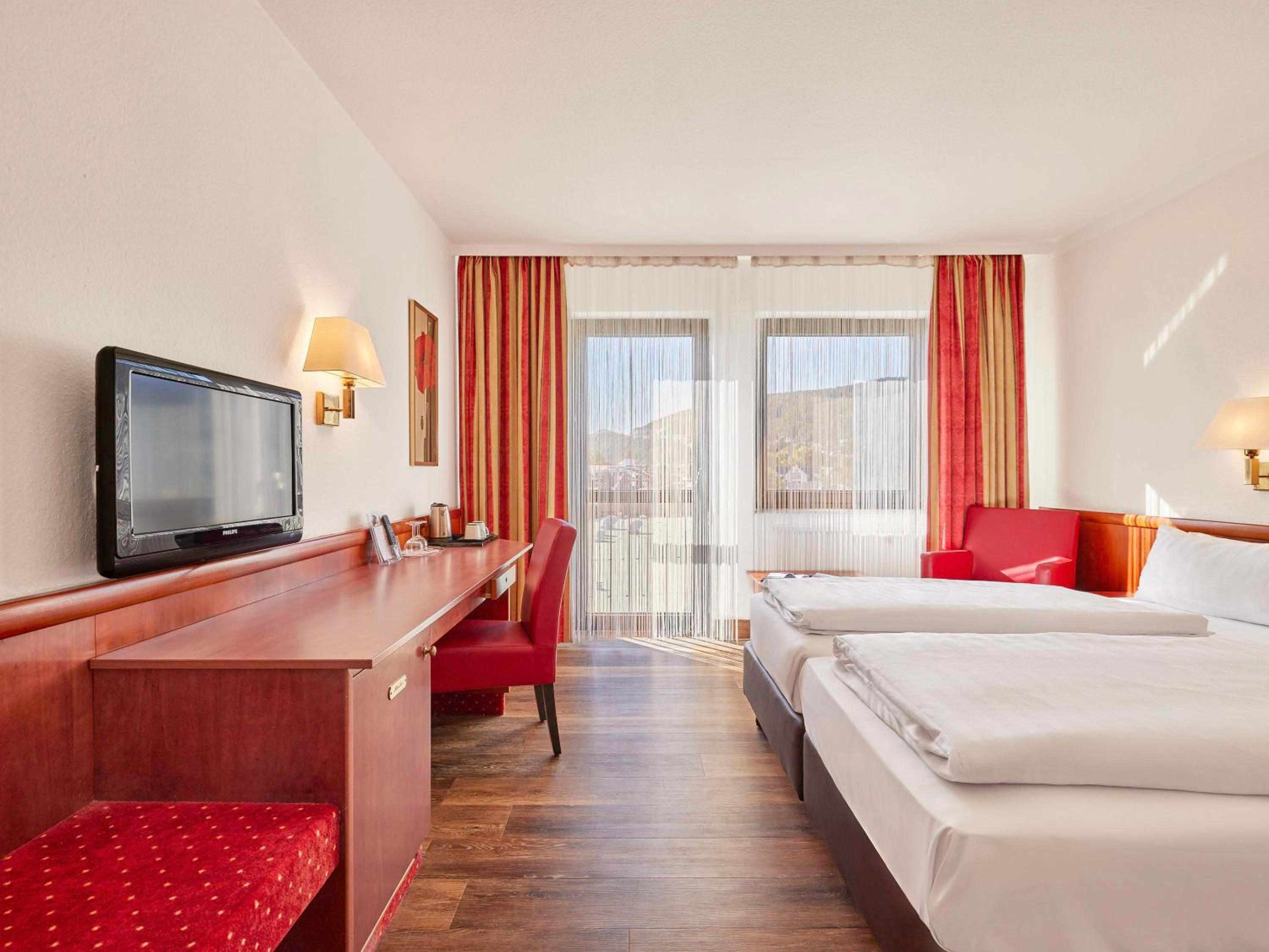Comfortable Accommodation: Each room at Mercure Hotel Bad Duerkheim an den Salinen is equipped with modern amenities including satellite TV, WiFi, and a sleek bathroom ensuring a comfortable stay for every guest.