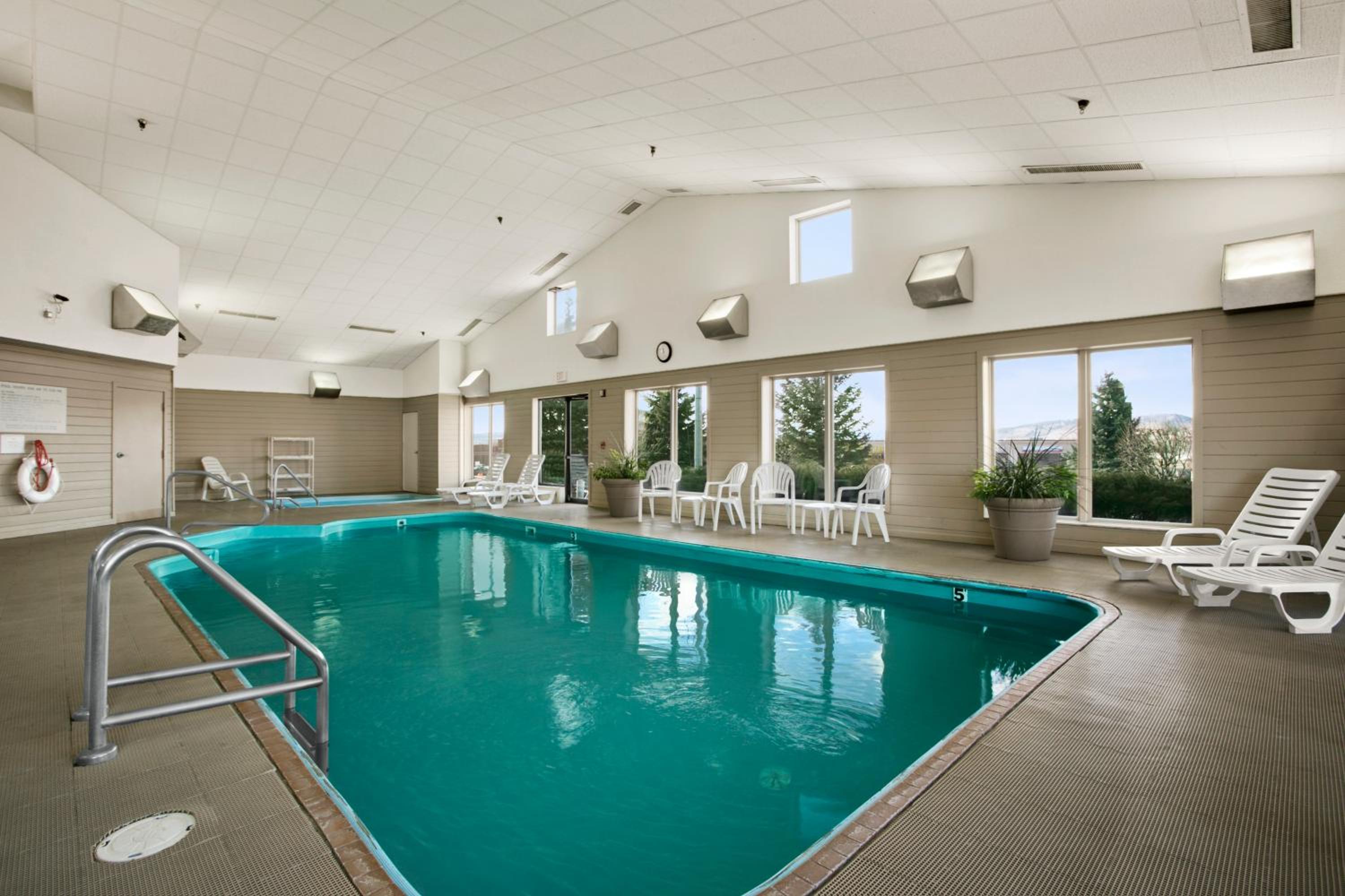 Guests can unwind in the indoor pool and hot tub after a day of exploring. The rooms are equipped with modern amenities including free Wi-Fi, a coffee maker, and a flat-screen TV.