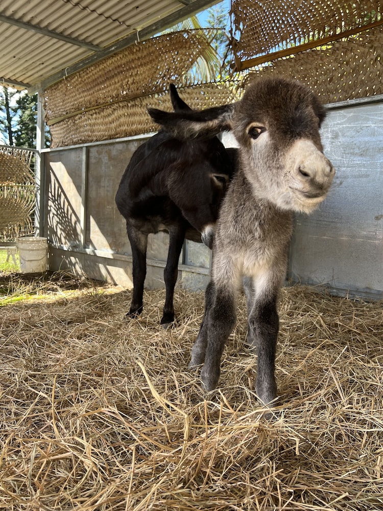 Having a lovely sunny breakfast with donkey grassing the lawn around the pool !