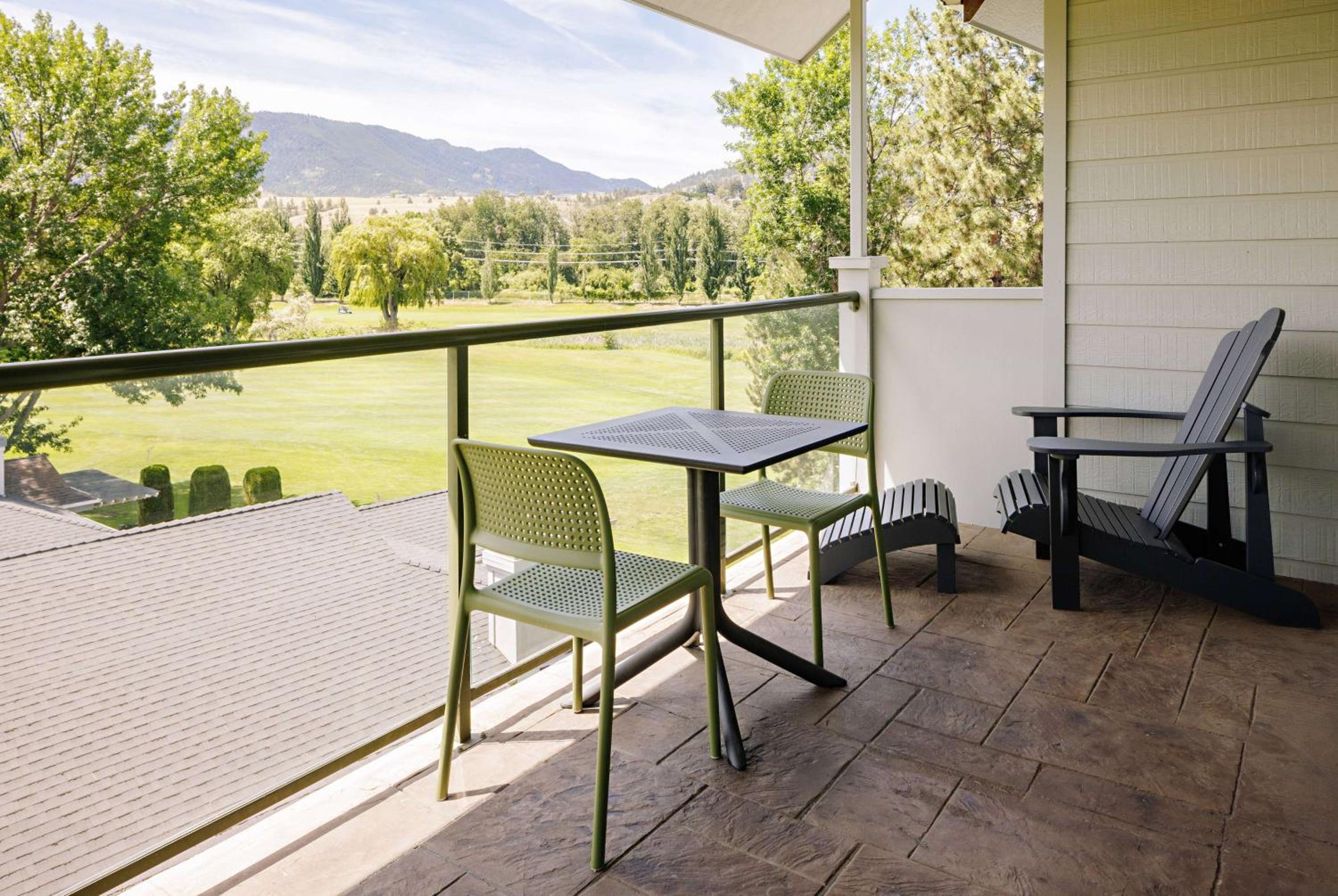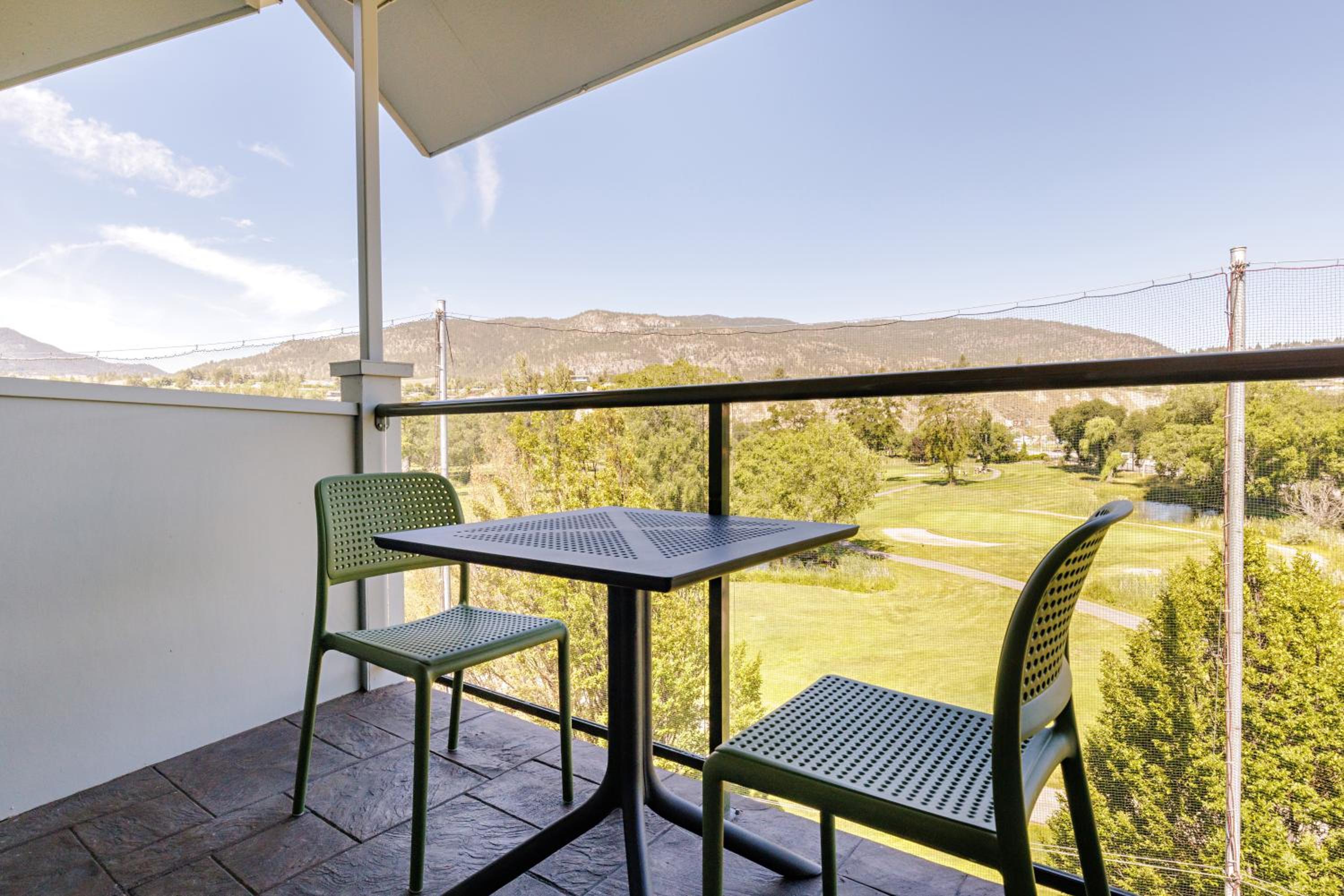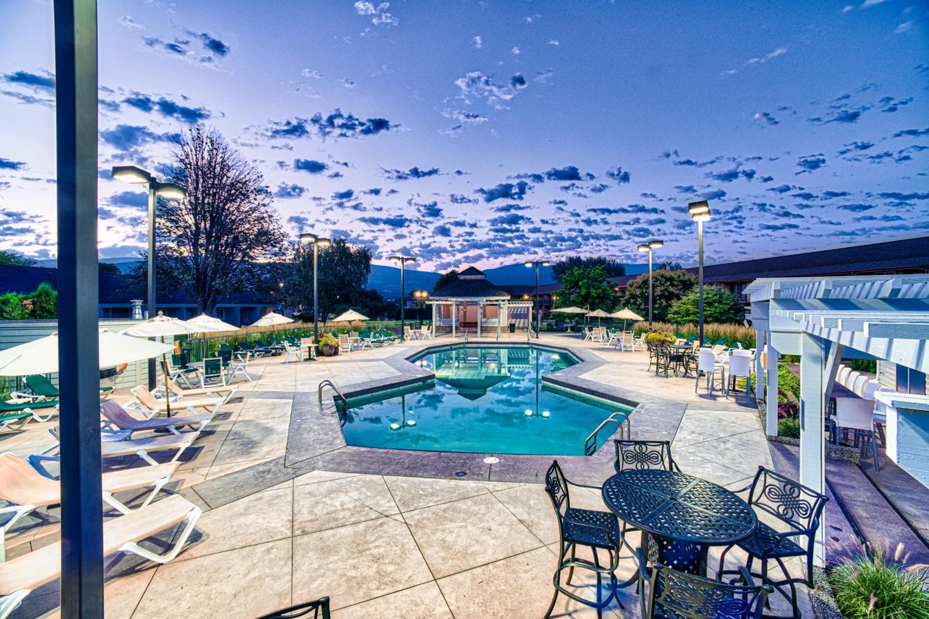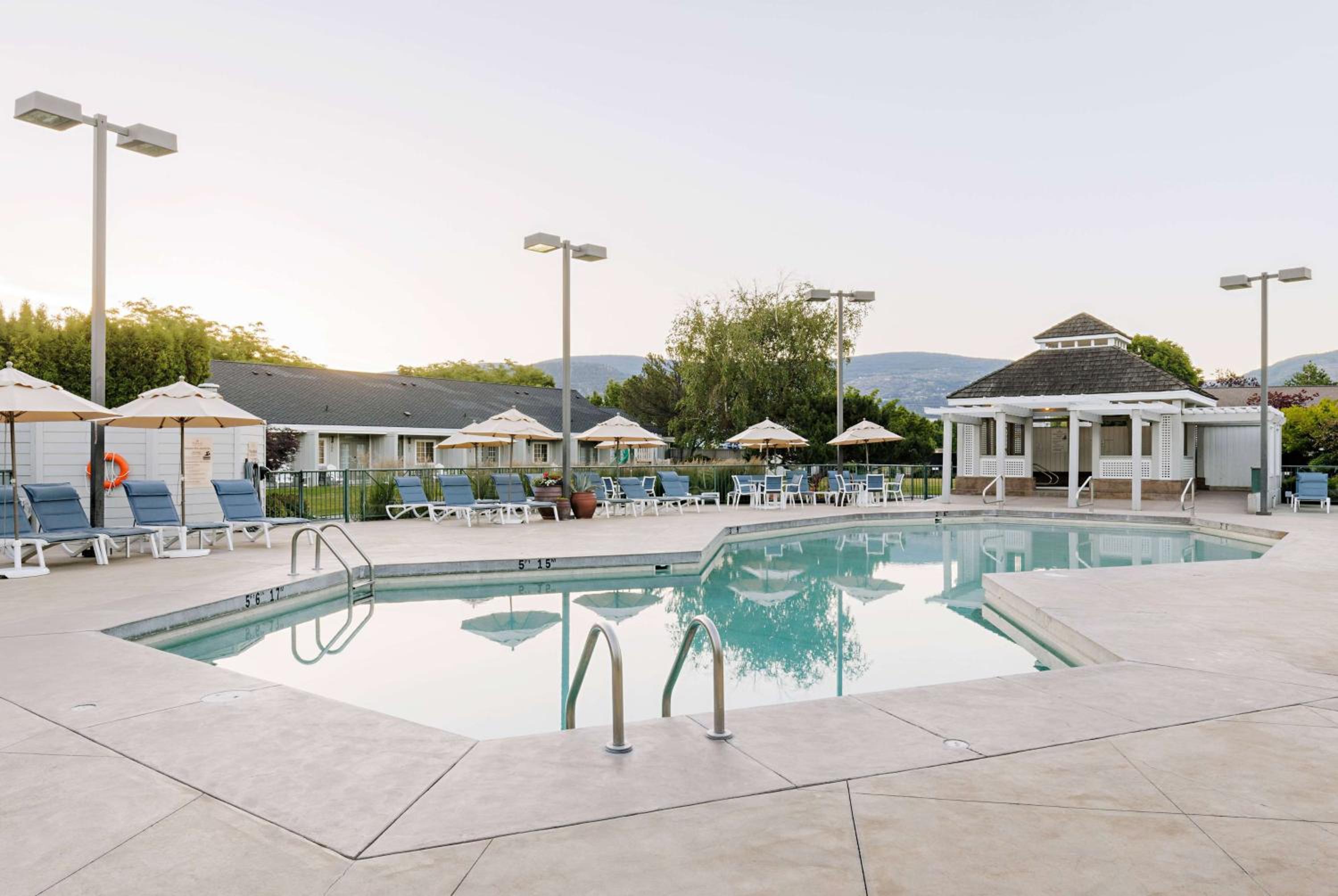 Enjoy stunning mountain skyline views from the outdoor pool and relax in rooms with private garden patios, offering a serene escape in the Okanagan Valley.