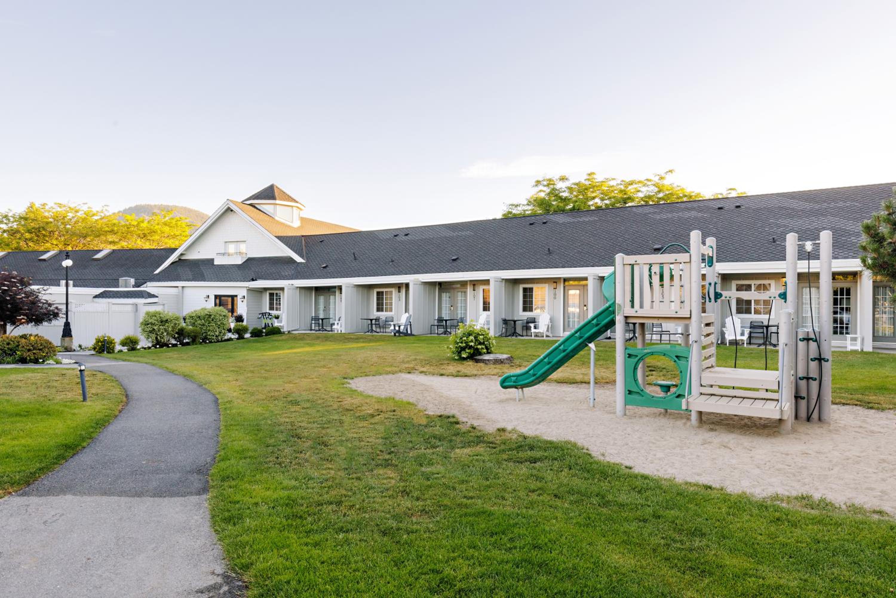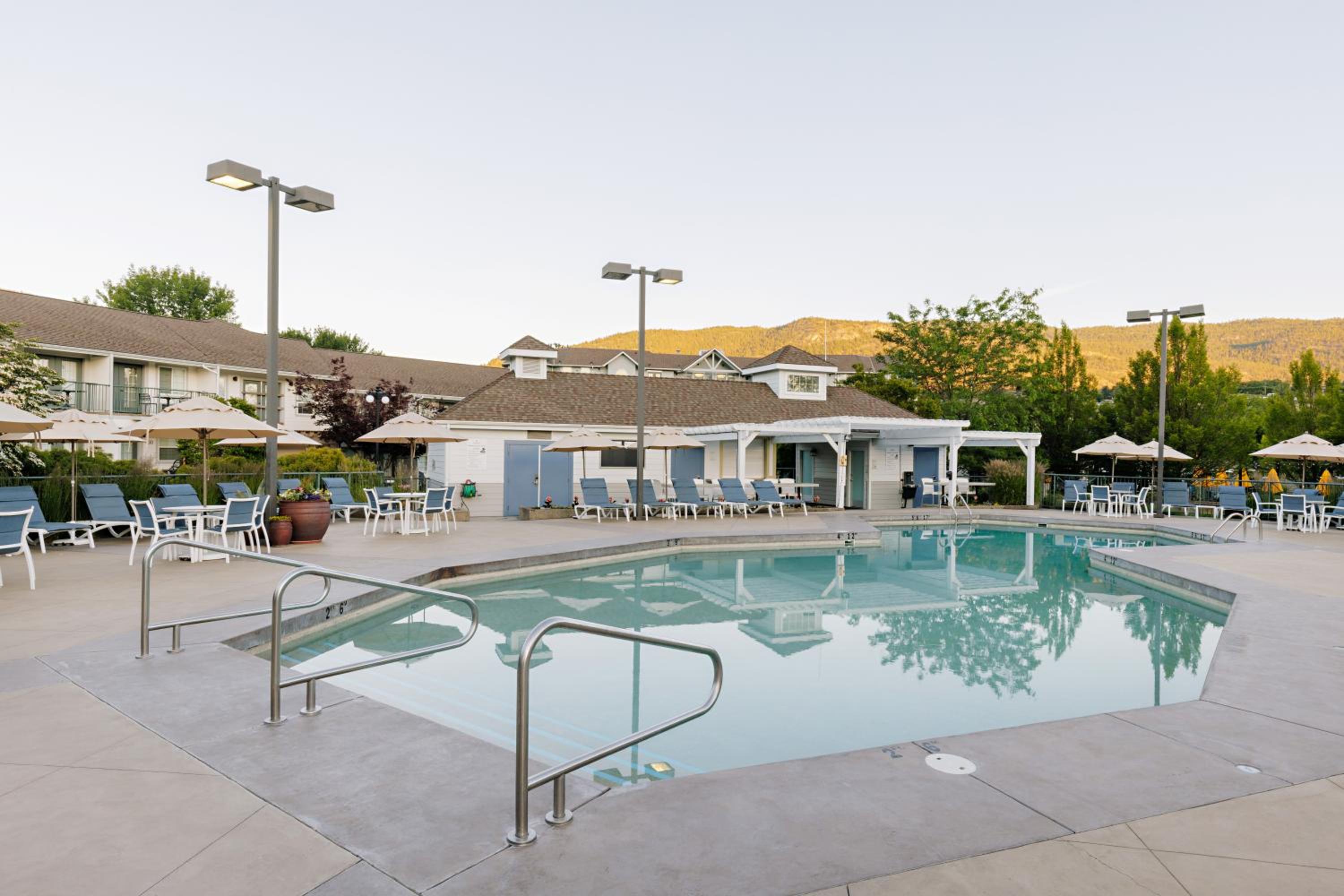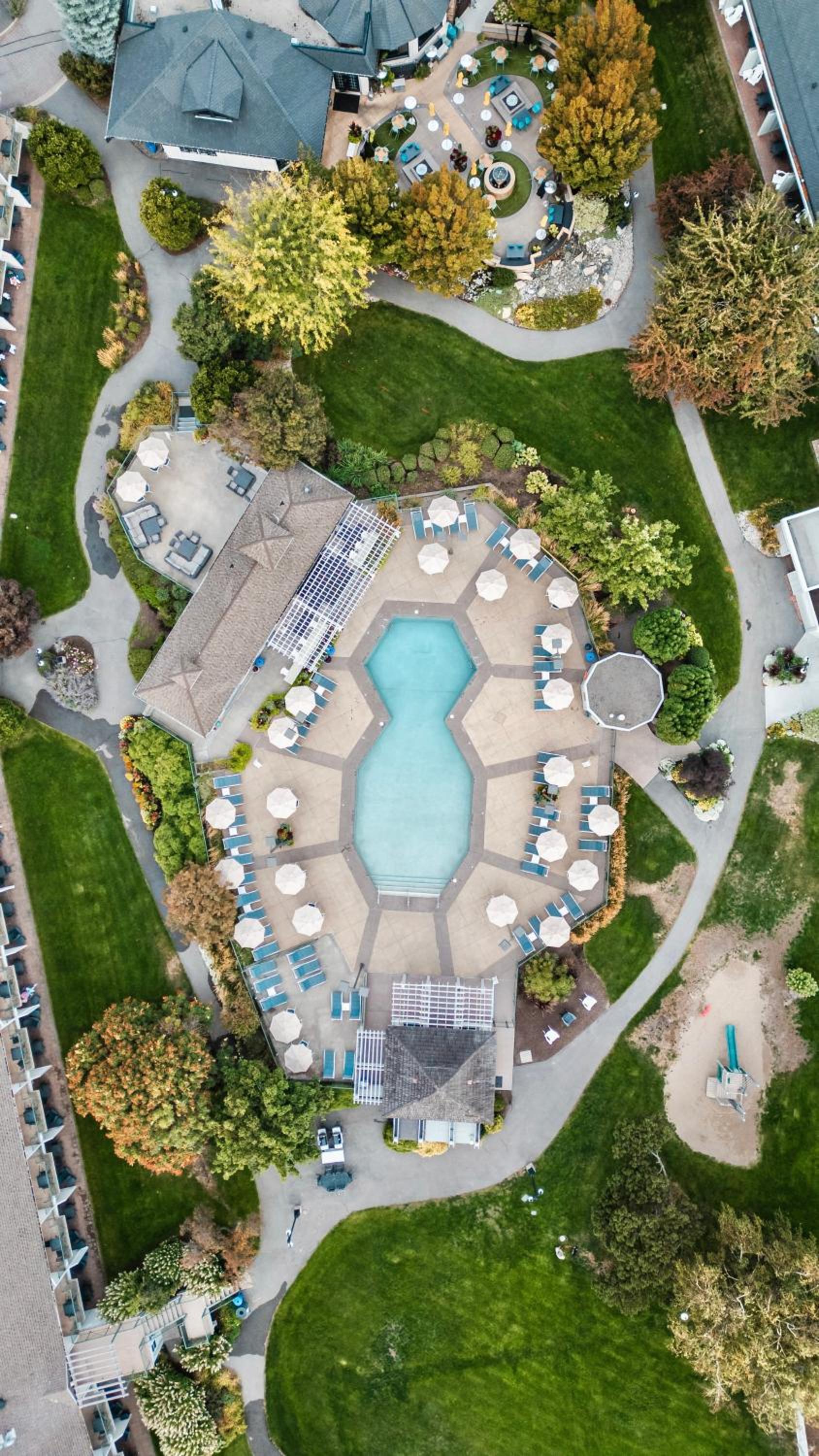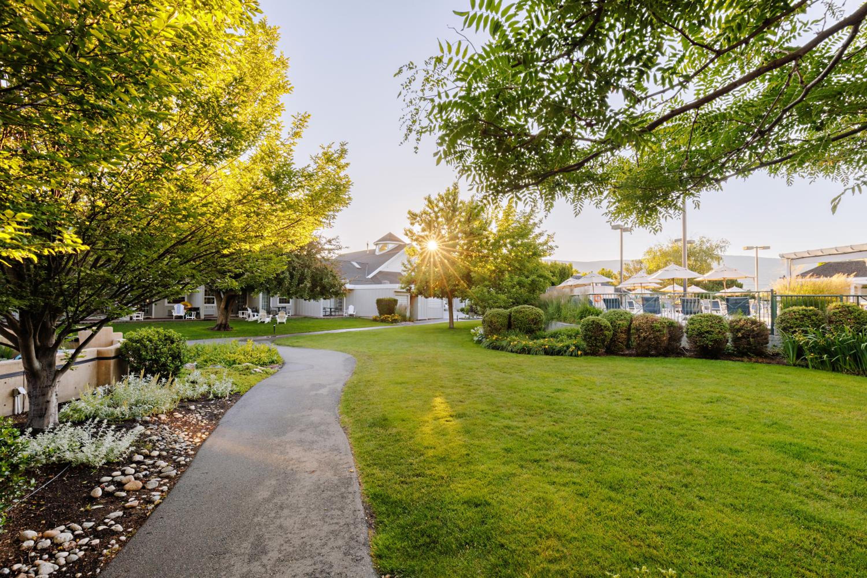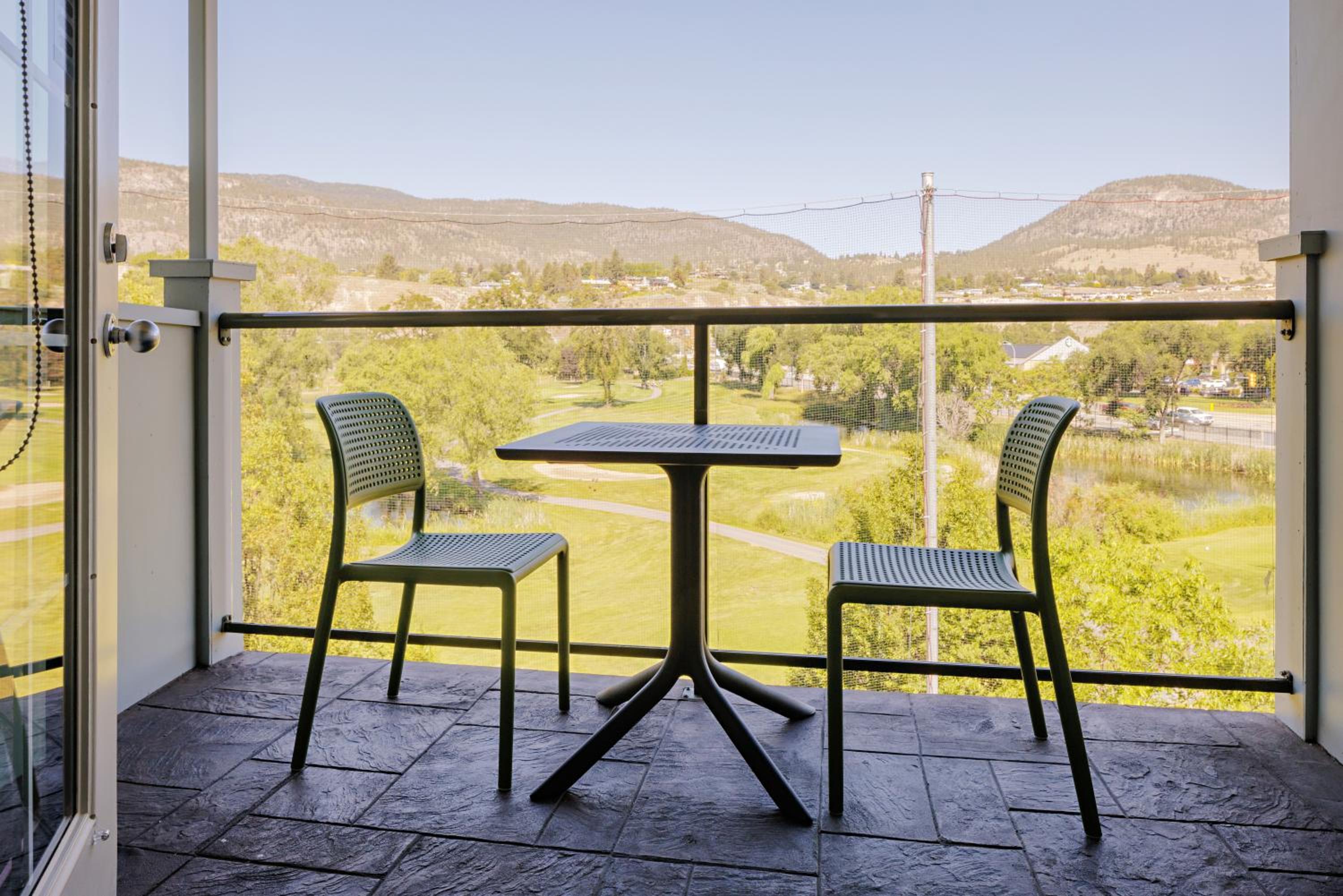 Enjoy stunning mountain skyline views from the outdoor pool and relax in rooms with private garden patios, offering a serene escape in the Okanagan Valley.