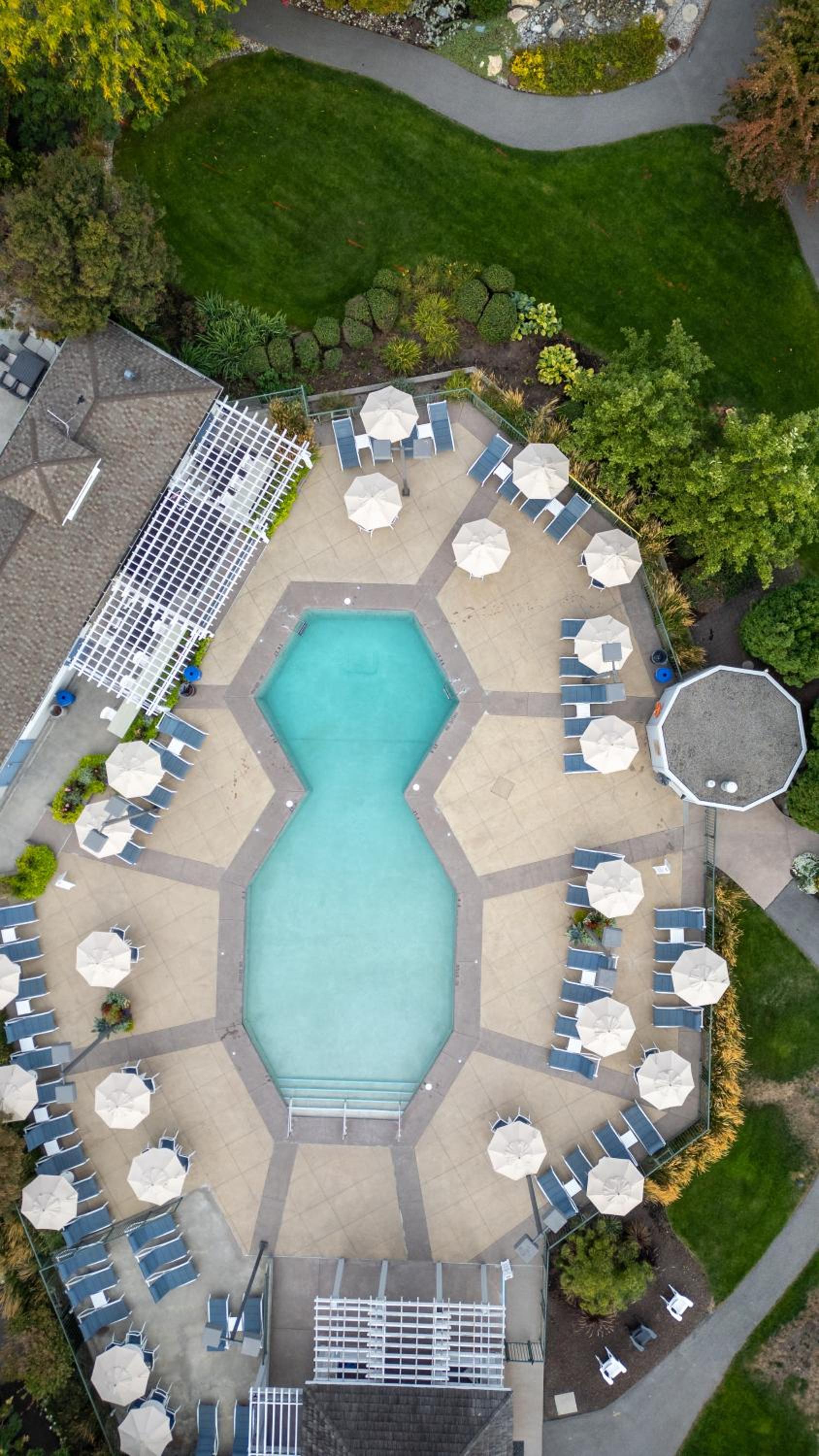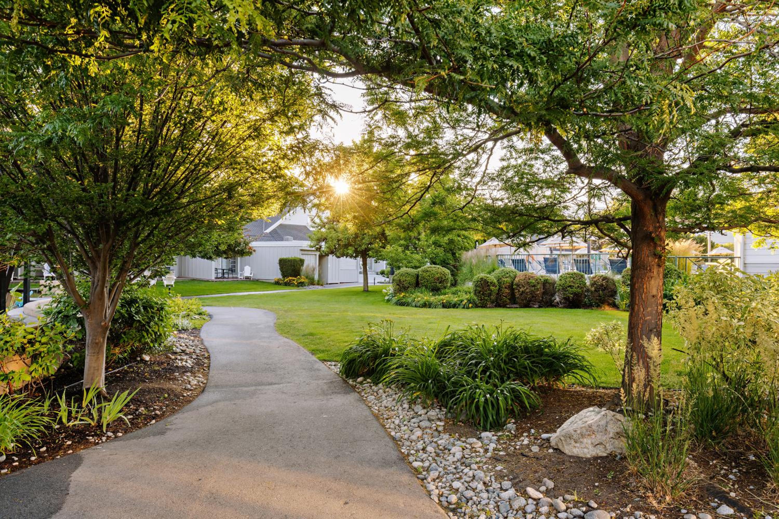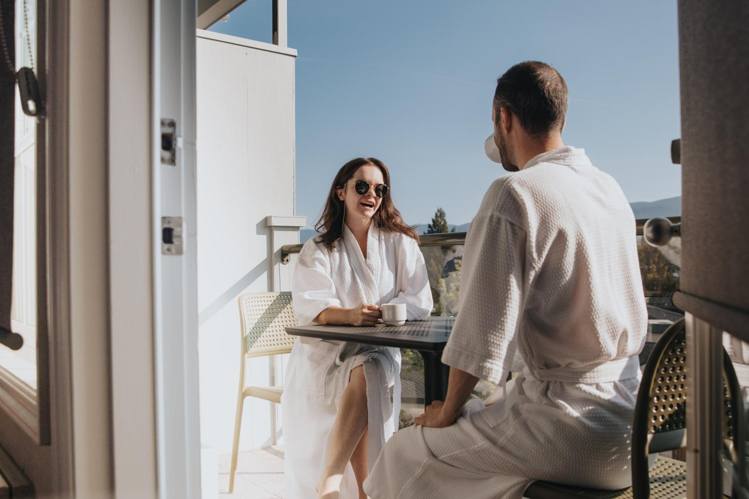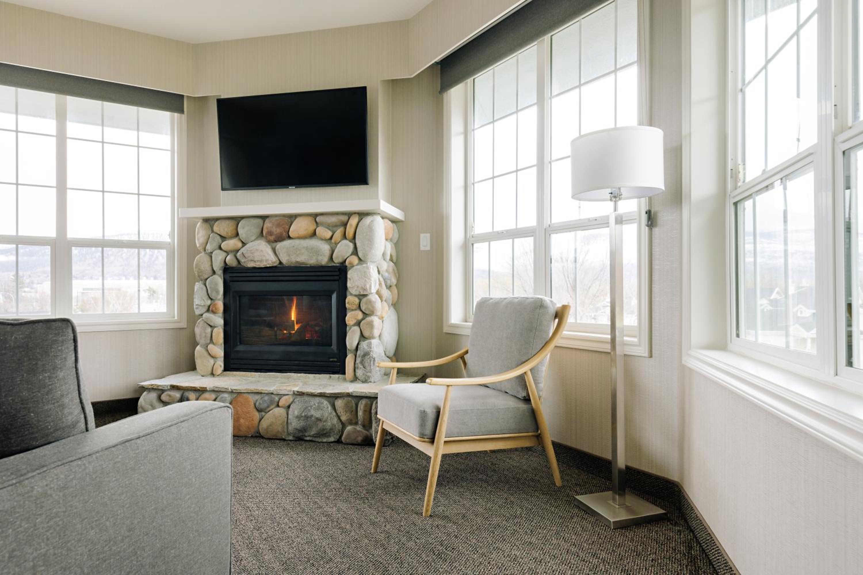 Enjoy stunning mountain skyline views from the outdoor pool and relax in rooms with private garden patios, offering a serene escape in the Okanagan Valley.