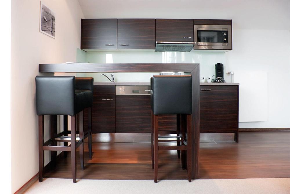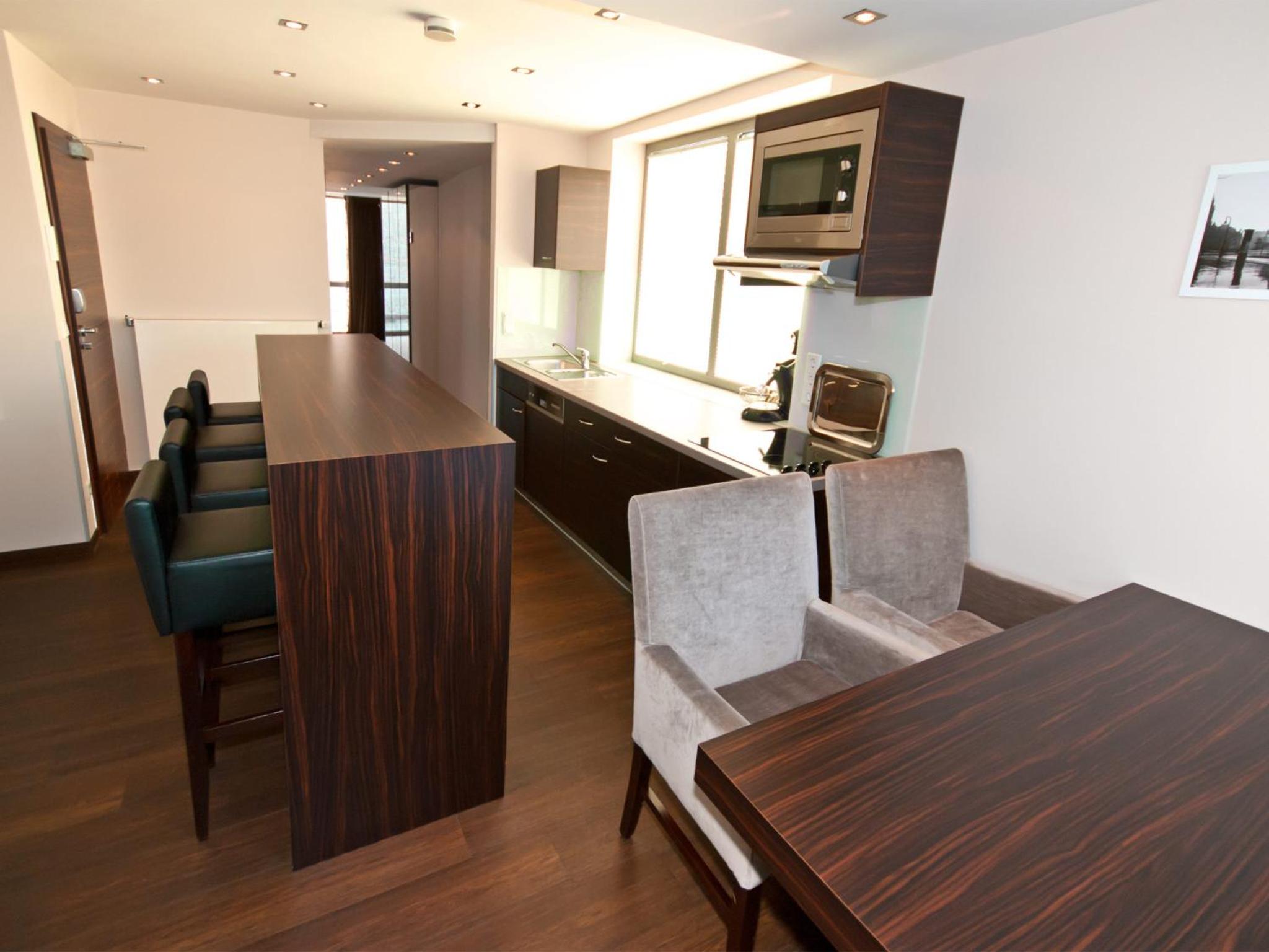 Experience the convenience of our modern apartments featuring contemporary wooden furniture, flat-screen TVs, and well-equipped kitchens. Each apartment offers a comfortable seating area and a private bathroom, ensuring a relaxing stay.