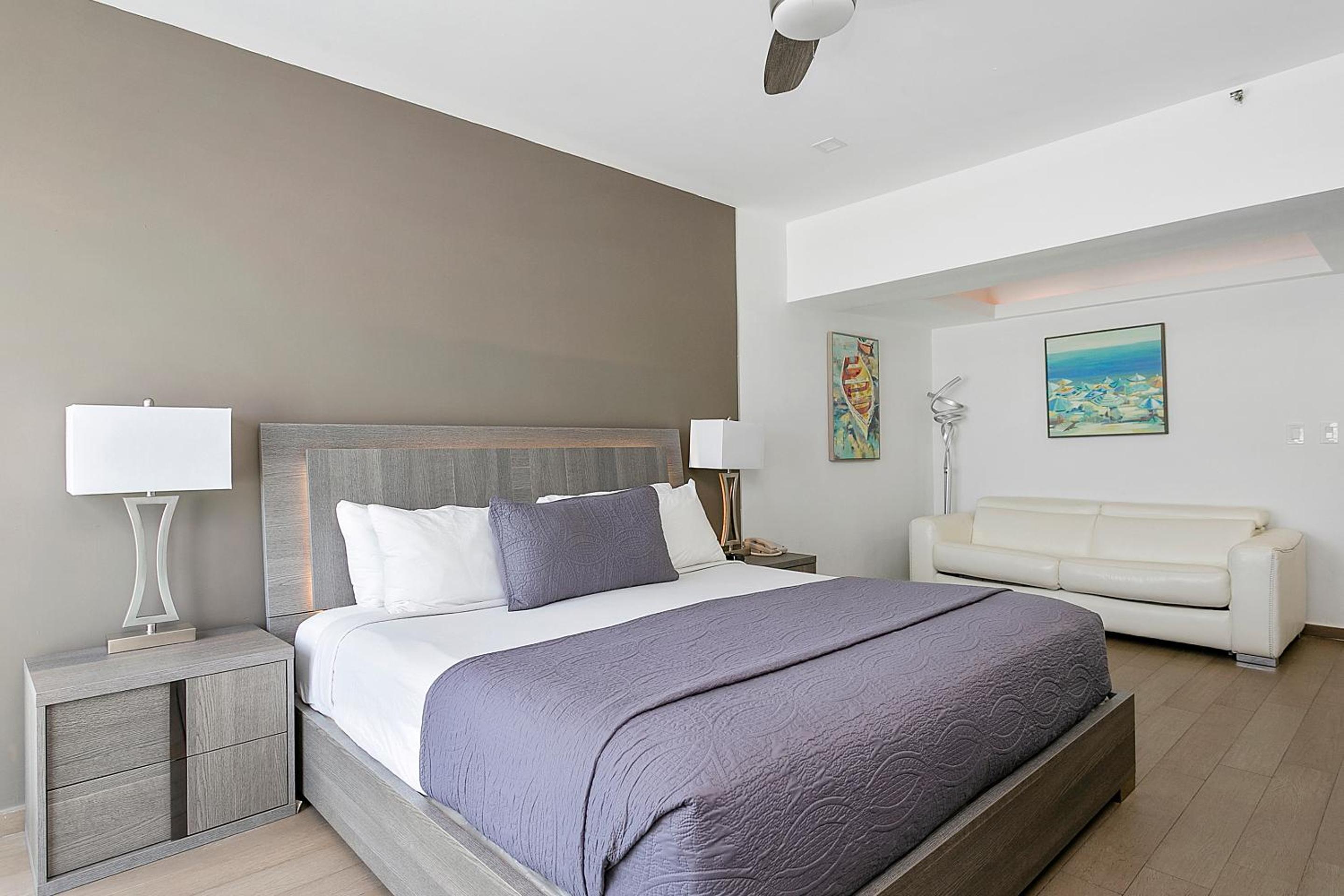 In ocean front rooms, windows didn’t open at all so couldn’t hear or smell the ocean. Rooms were antiseptic- all white walls, no art on walls, harsh lighting. Bathroom sink area has very little counter space. Room had odd smell.