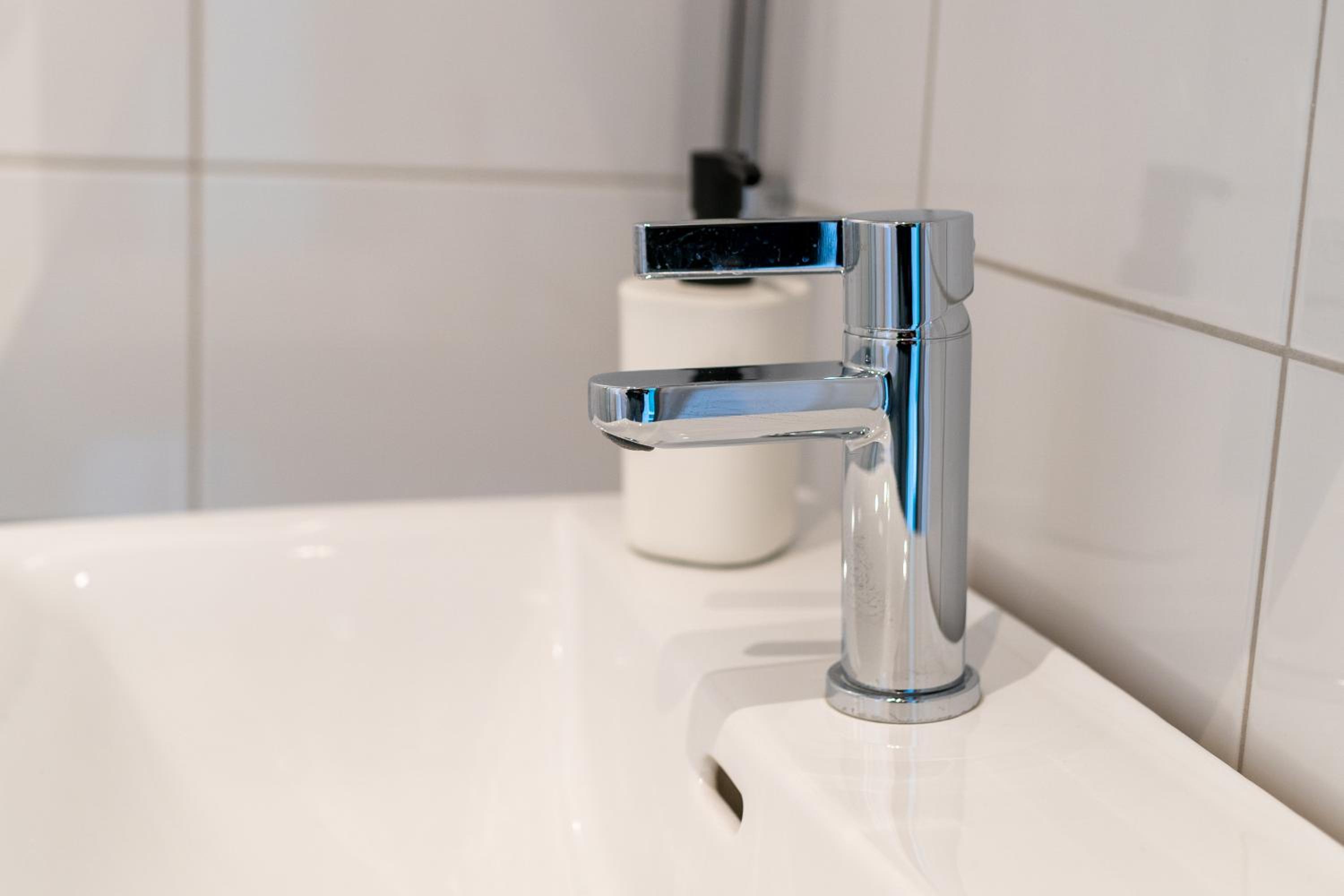 Lagat handfat som saknar propp och har stopp i avloppet.