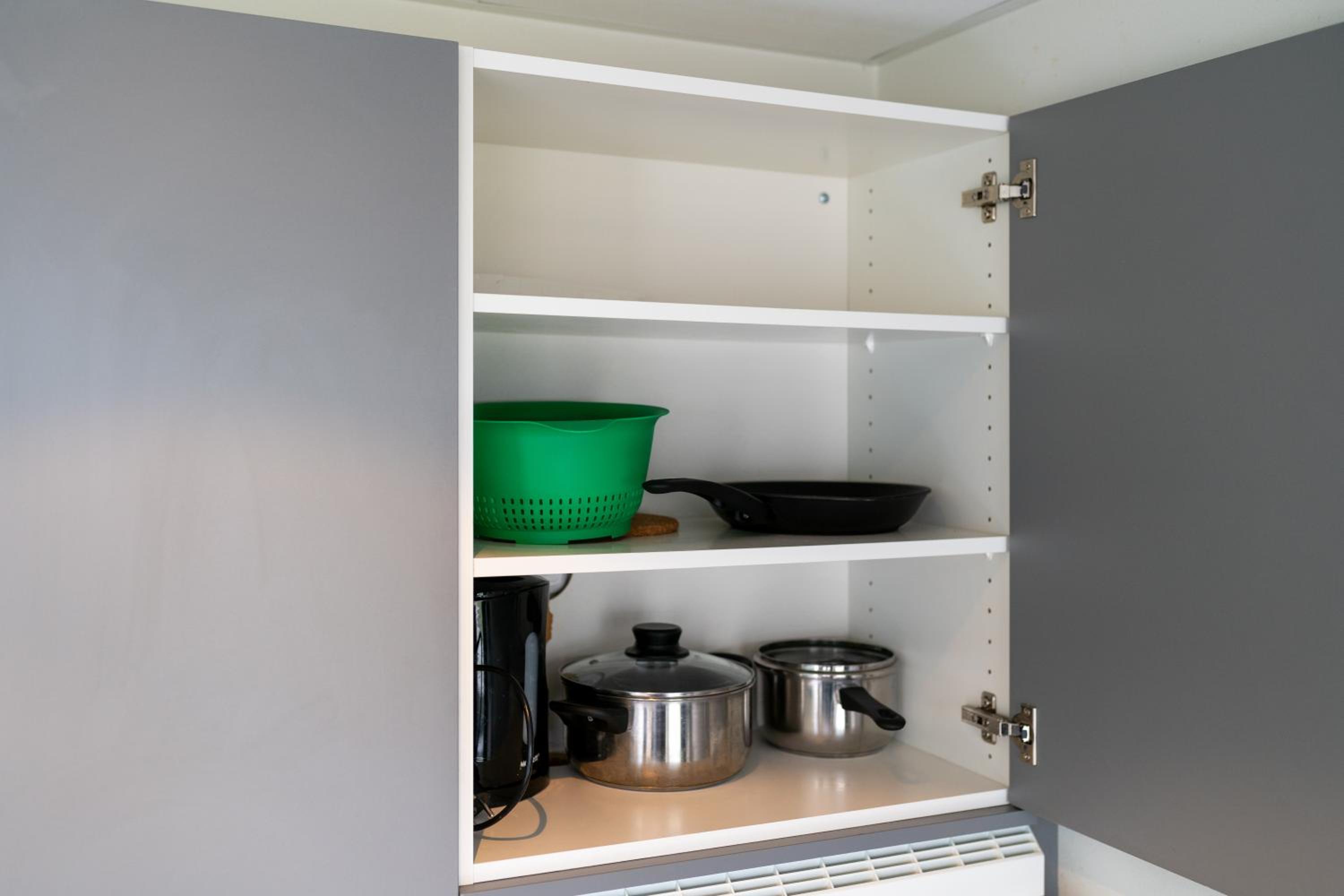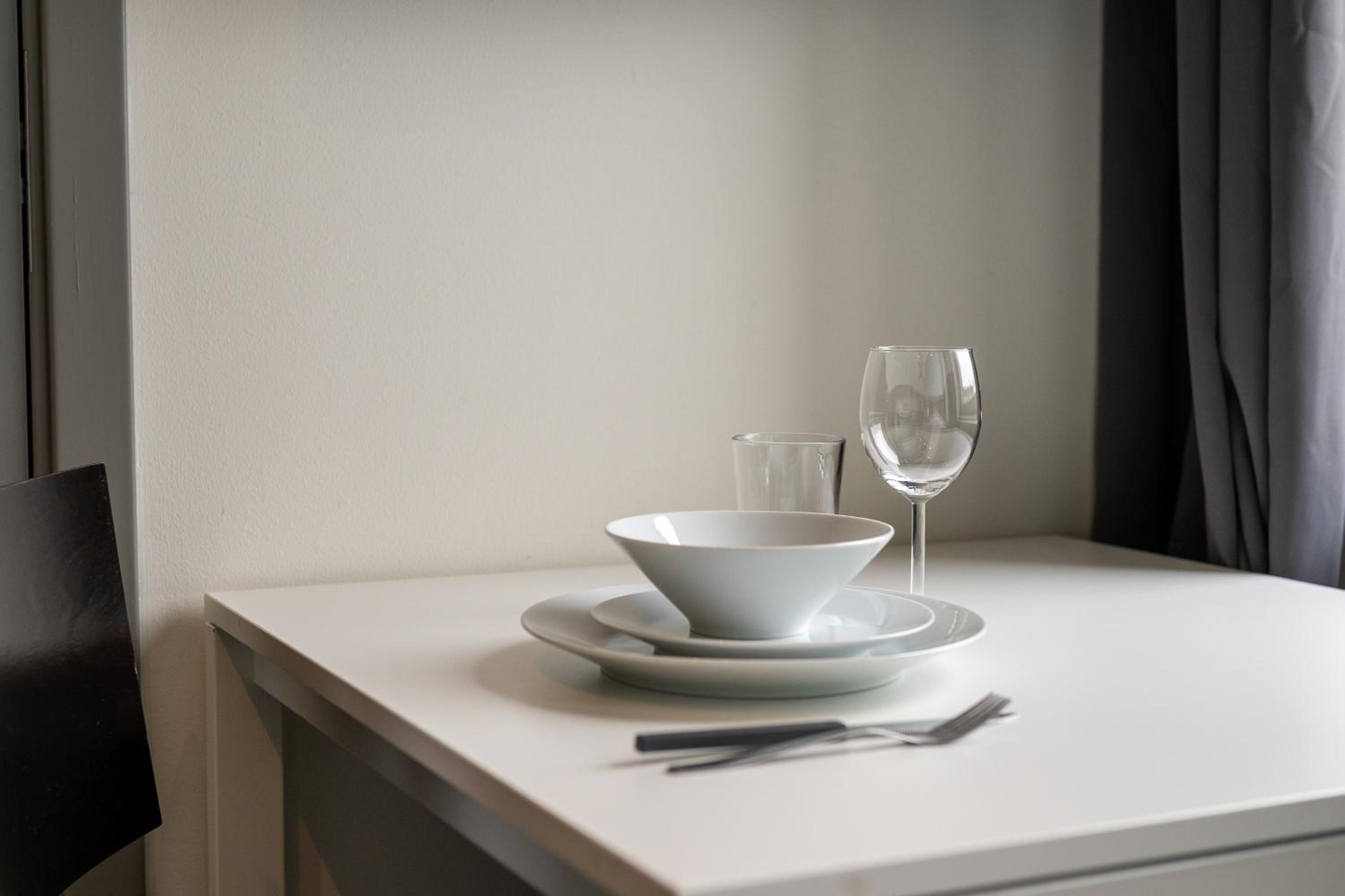 Köksutrustningen är minimal med bara två av varje grej. Dock alla med olika storlekar och utförande. Låg kvalitet på besticken. Ser ut som om inhandlad på loppis. Saknar bunke, sax, brödkniv och propp i diskhon.
