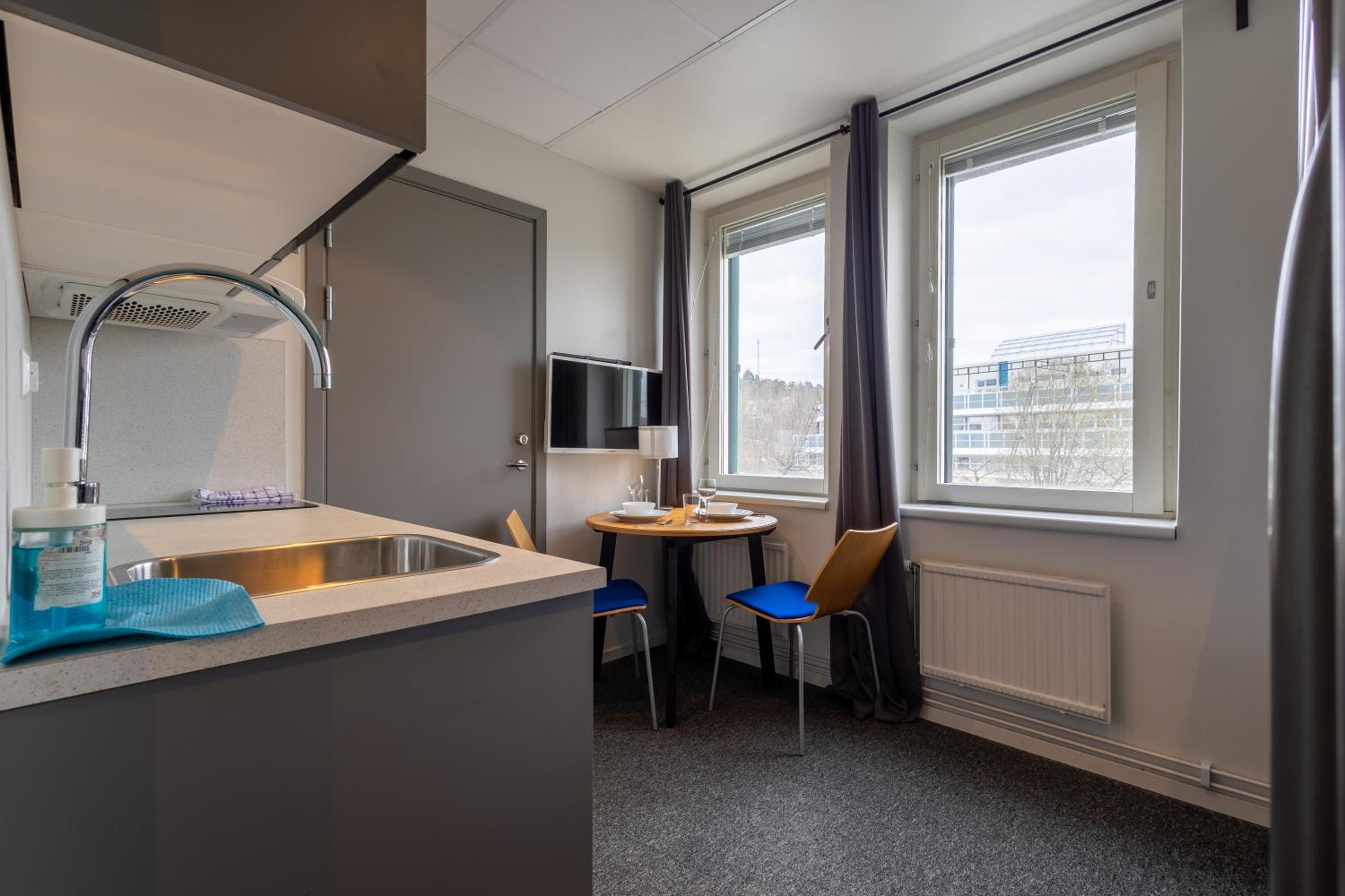 Bra boende med fina rum/lägenheter. Mycket företag som bor/övernattar här. Lägenheten behöver renoveras/uppfräschning. Städning kan bli bättre, ej 100% rent efter tidigare hyresgäster. En byggnad med mycket potential men tyvärr ganska tråkigt idag. Saknas lobby. Receptionen är öppen från klockan 14 som tidigast. Nära till LIDL mataffären, till busshållplats som tar dig till Sollentuna centrum på någon minut. Även promenad avstånd till Sollentuna centrum. För att komma till boendet tar du bussen 607 mot Danderyds sjukhus från Sollentuna Centrum hoppar av på Djupdalsvägen. Du ser byggnaden Sollentuna Apartments från busshållplatsen, knappt 50 meter bort. Överlag bra vistelse men det kan bli mycket bättre med lite mer engagemang från dem ansvariga. Trevlig personal i receptionen den dagen jag checkade in, tjejen var jätte trevlig och tillmötesgående.
