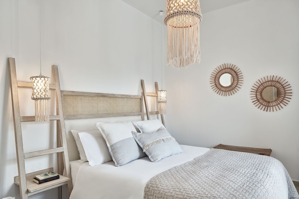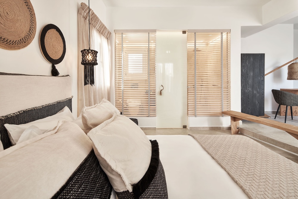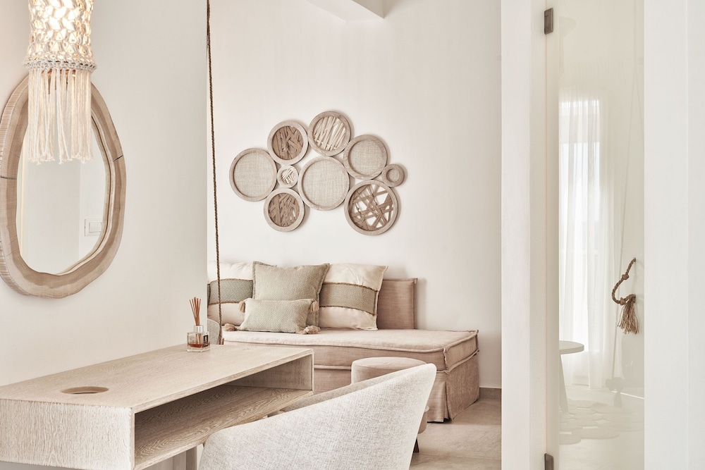 in the room. There are 4 restaurants within walking distance and located on the beach, one of which is a part of this hotel and was quite good. While other beaches and attractions are at least 1-2 miles away, the location here is quiet and less touristy than areas like Pollonia or Plaka. The balcony and hot tub were fantastic. The hotel supplied a beach bag, towels, and water. The room was comfortable and bright and the bathroom was well stocked and a good size. USB outlets by both beds, a full-length mirror, a table to enjoy breakfast or drinks outside... pretty perfect overall.