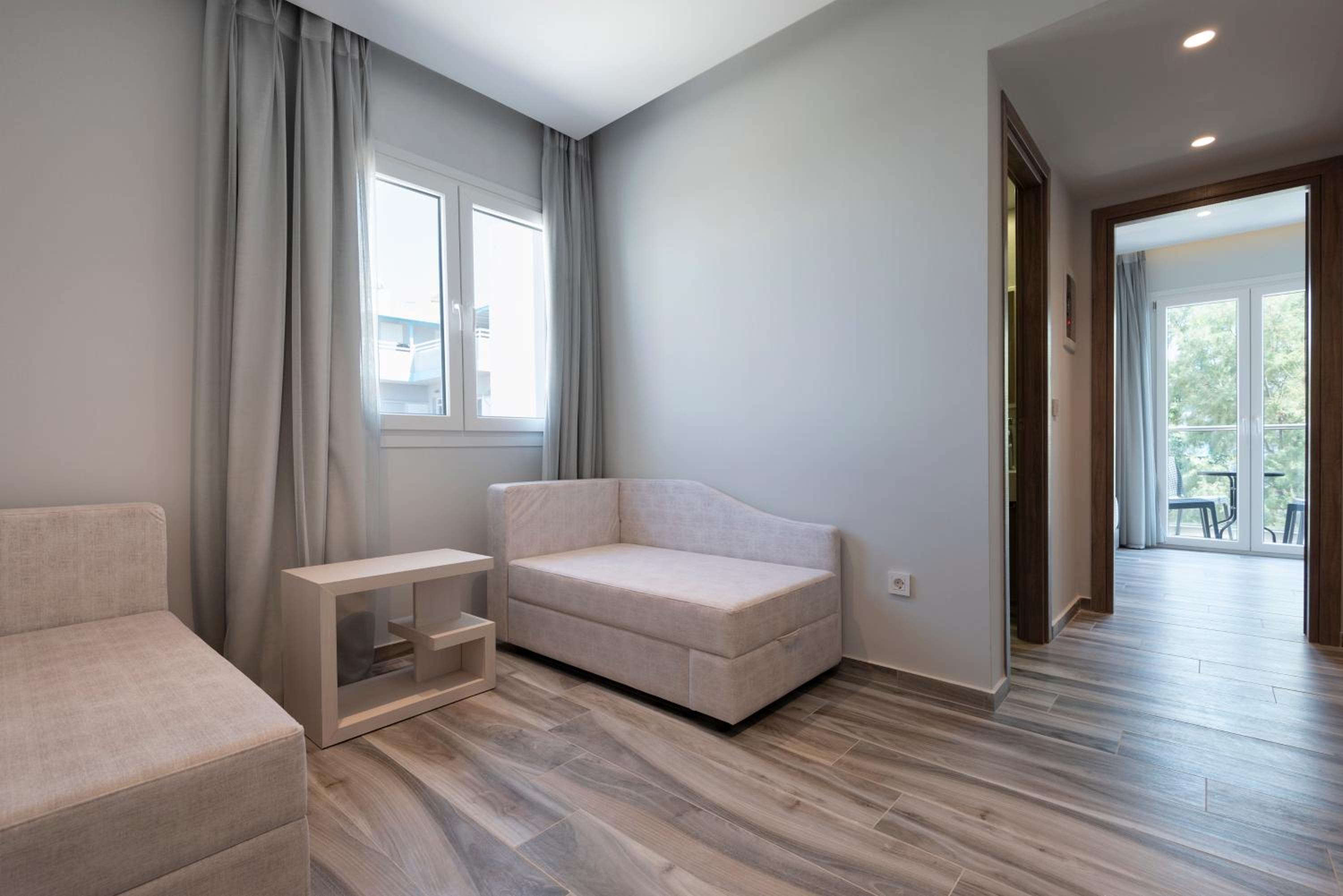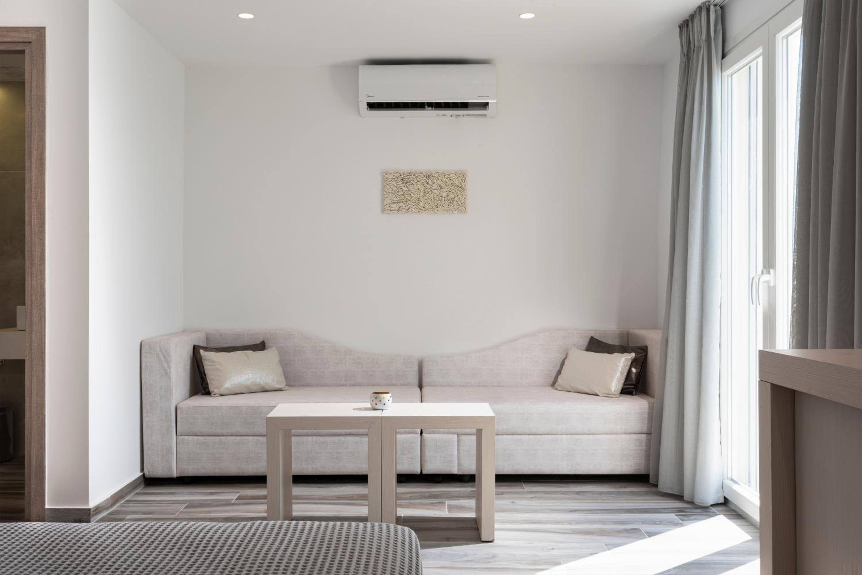 Kyma Rooms & Suites is located right next to the beach, yet very close to the town center, so you can walk to all the restaurants and shops. When we stayed there at end of September, there were always enough sunbeds available at the beach. There is also a great restaurant that belongs to the hotel, where you can have breakfast, lunch and dinner (has to be paid separately). They even serve food & drinks at the sunbeds. We had a room with sea view from the side (we would have preferred full sea view but the rooms were booked out), which was rather small, but very clean and included everything we needed. The staff was extremely friendly and helpful - we lost our headphones at the end of the vacation and they were so helpful in sending them to our home country as we had already left.