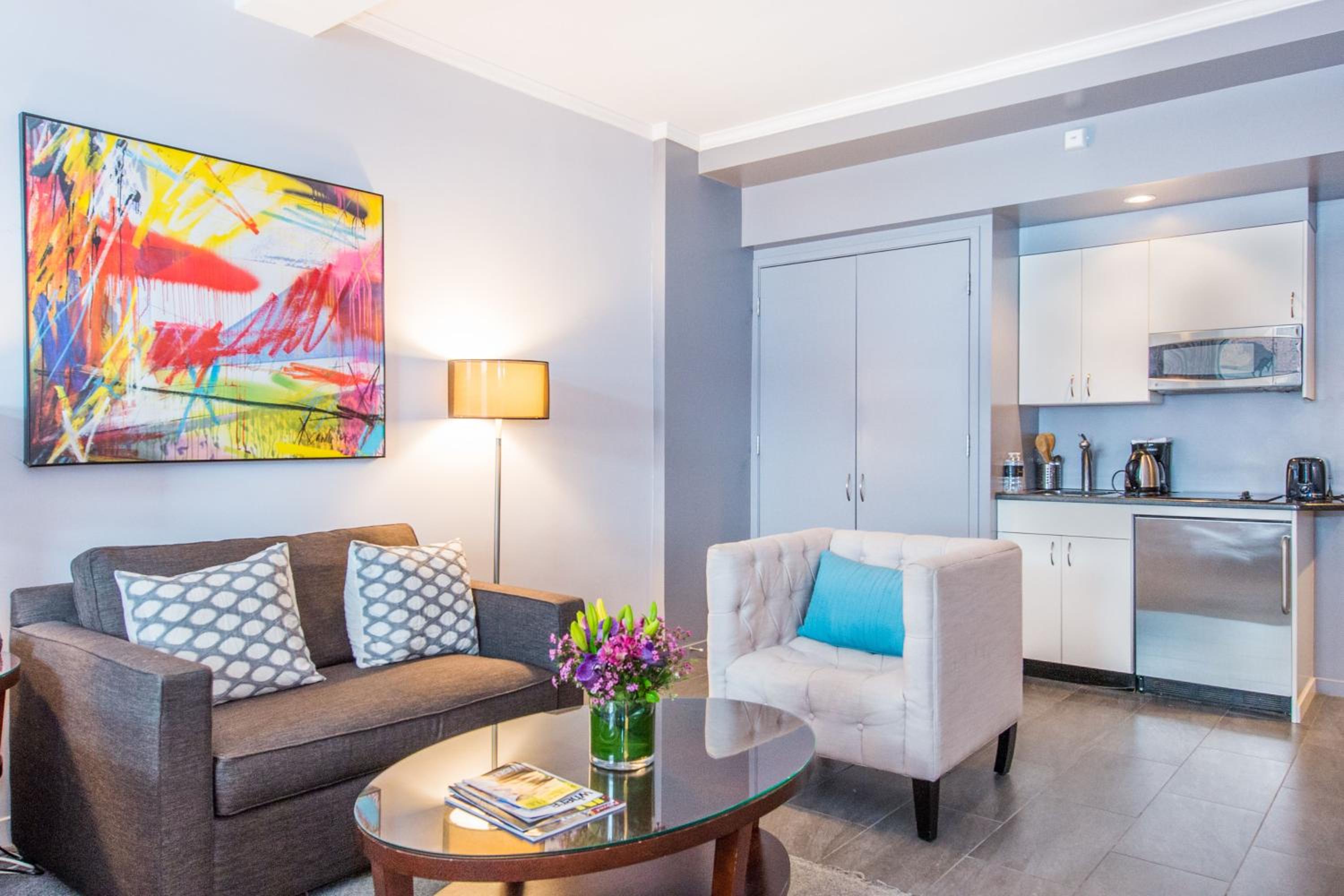 Indulge in the sophisticated charm of the Lombardy Hotel's elegant rooms, equipped with luxurious features such as flat-screen TVs, plush bathrobes, and Gilchrist & Soames toiletries. Enjoy the convenience of a coffee maker, ironing facilities, and a kitchenette in every room for a comfortable stay.