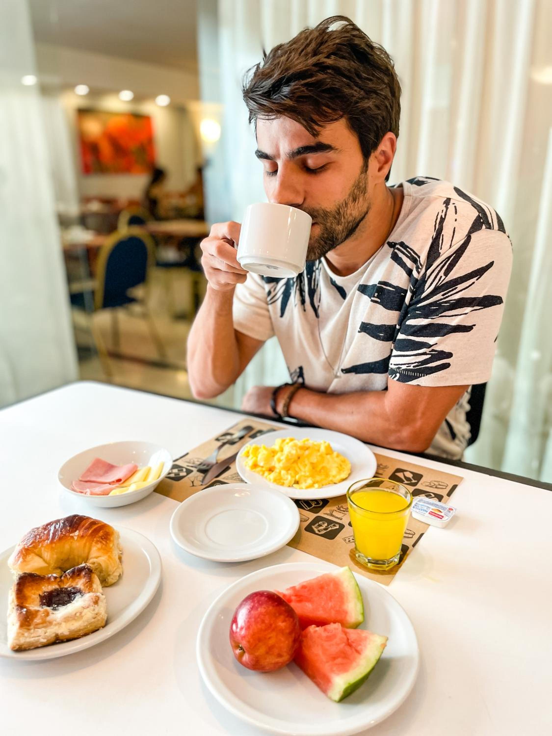 O café da manhã demoravam a repor os itens, quando fui tomar café às 09h30 não tinha mais ovos, pão falaram que saíram para comprar. Foi reposto mas demorou.