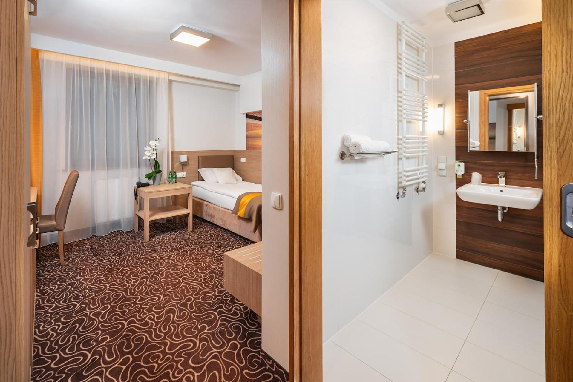 Hotel ładnie położony, na obrzeżach Parku Zdrojowego, ładna trasa spacerowa. Pokój spełnił oczekiwania, czyściutko i przytulnie. Dostępny parking w ramach rezerwacji.