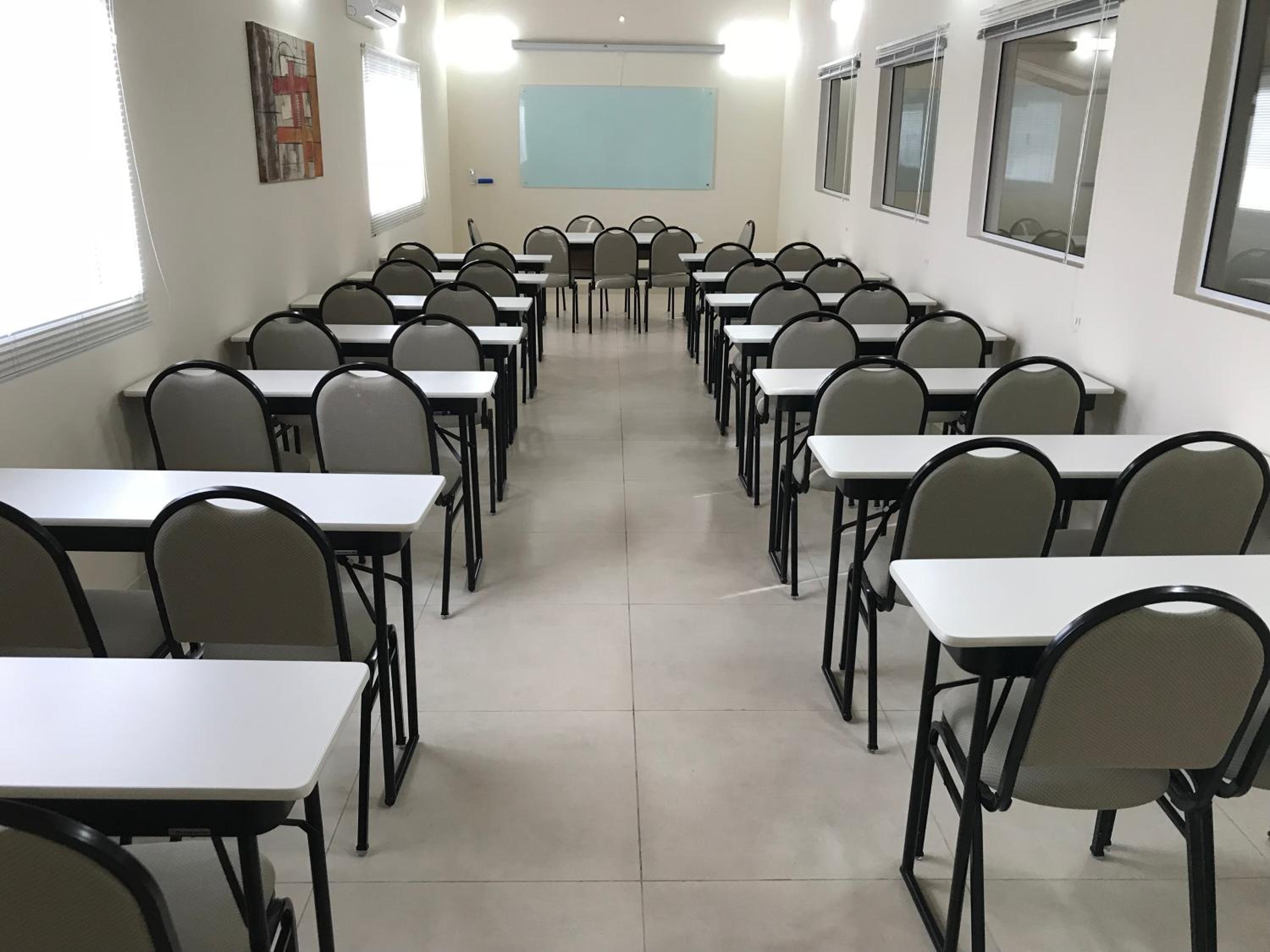 Na mesinha existem dois branquinhos bem desconfortáveis, tanto para alimentação quanto para trabalho.