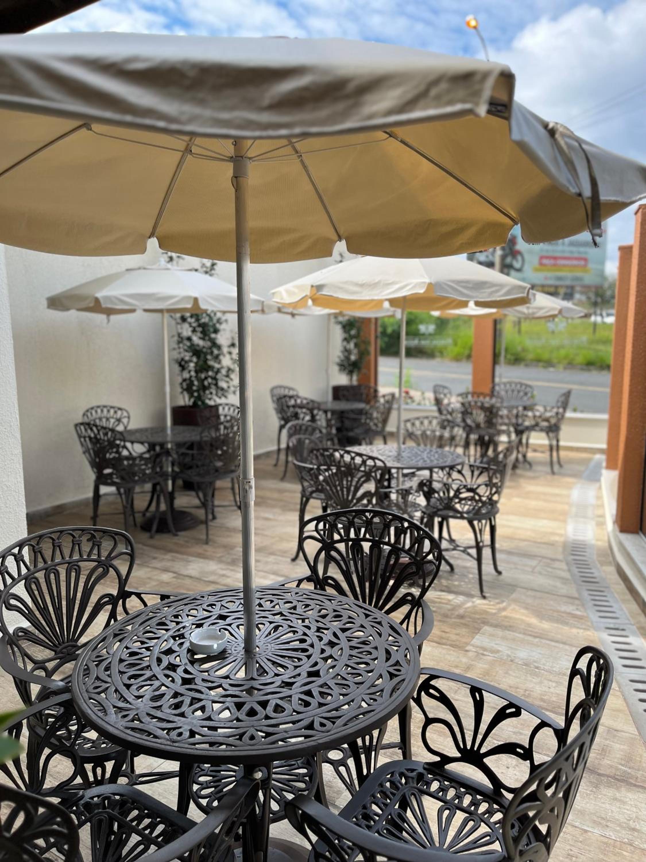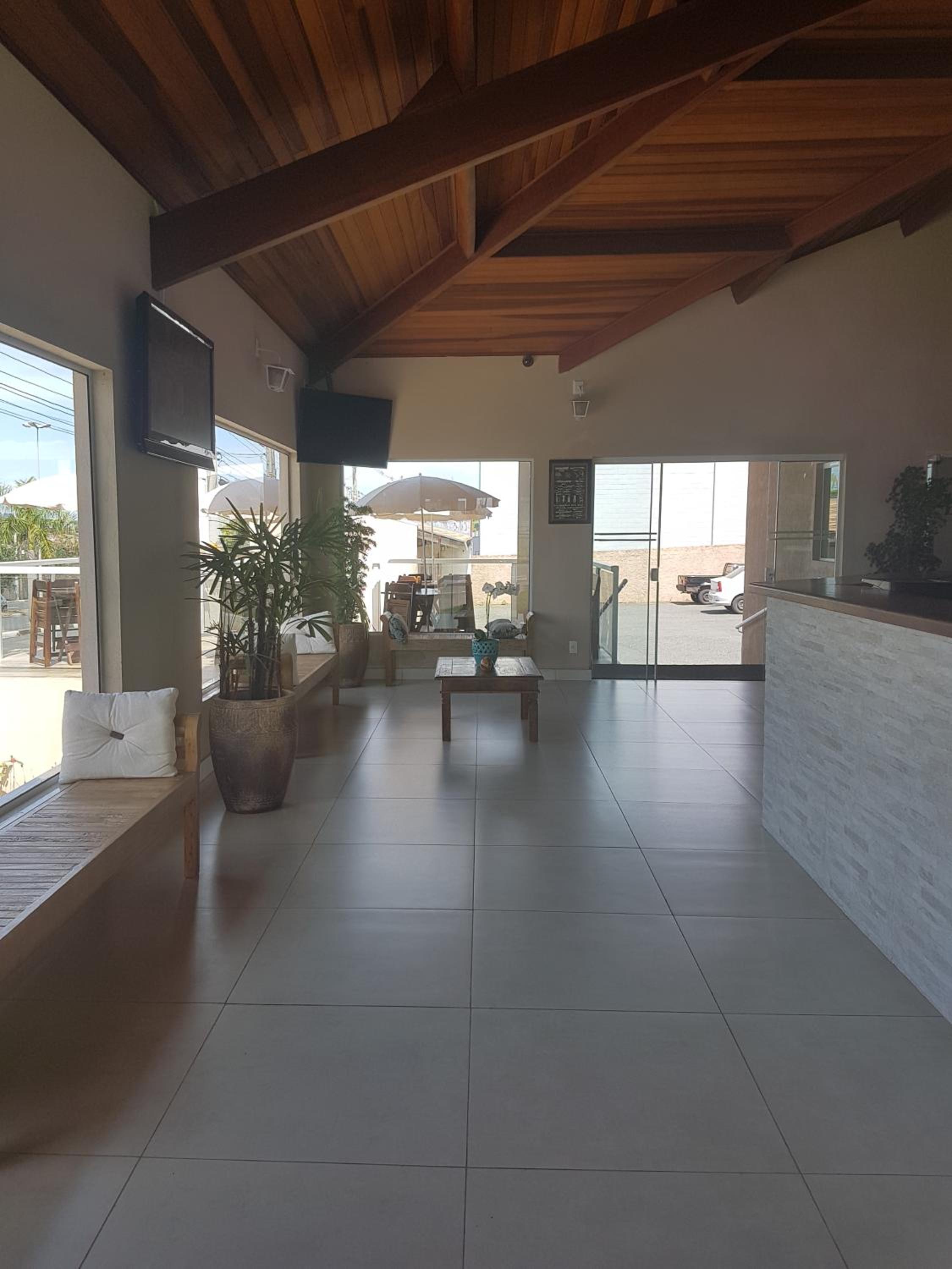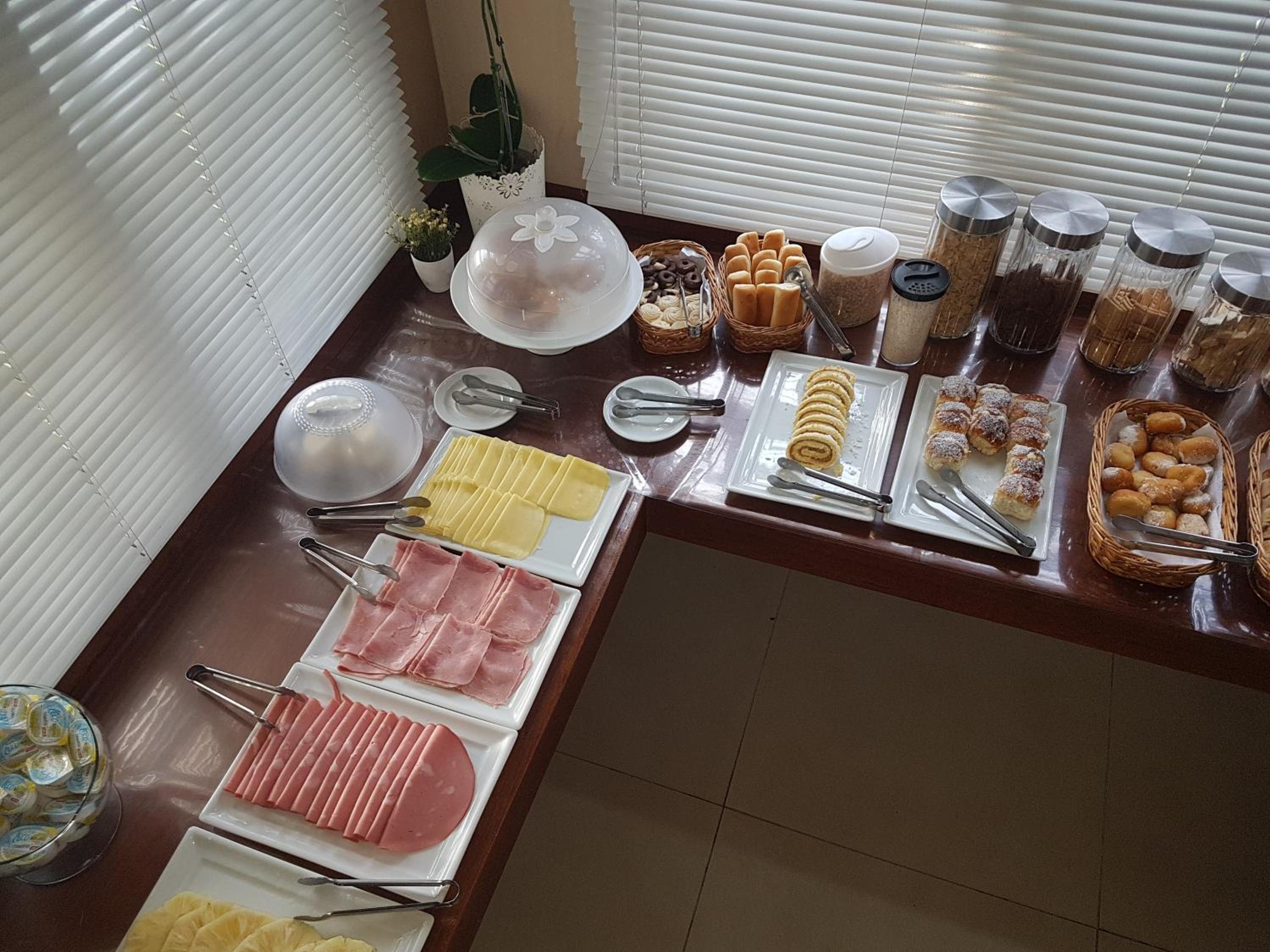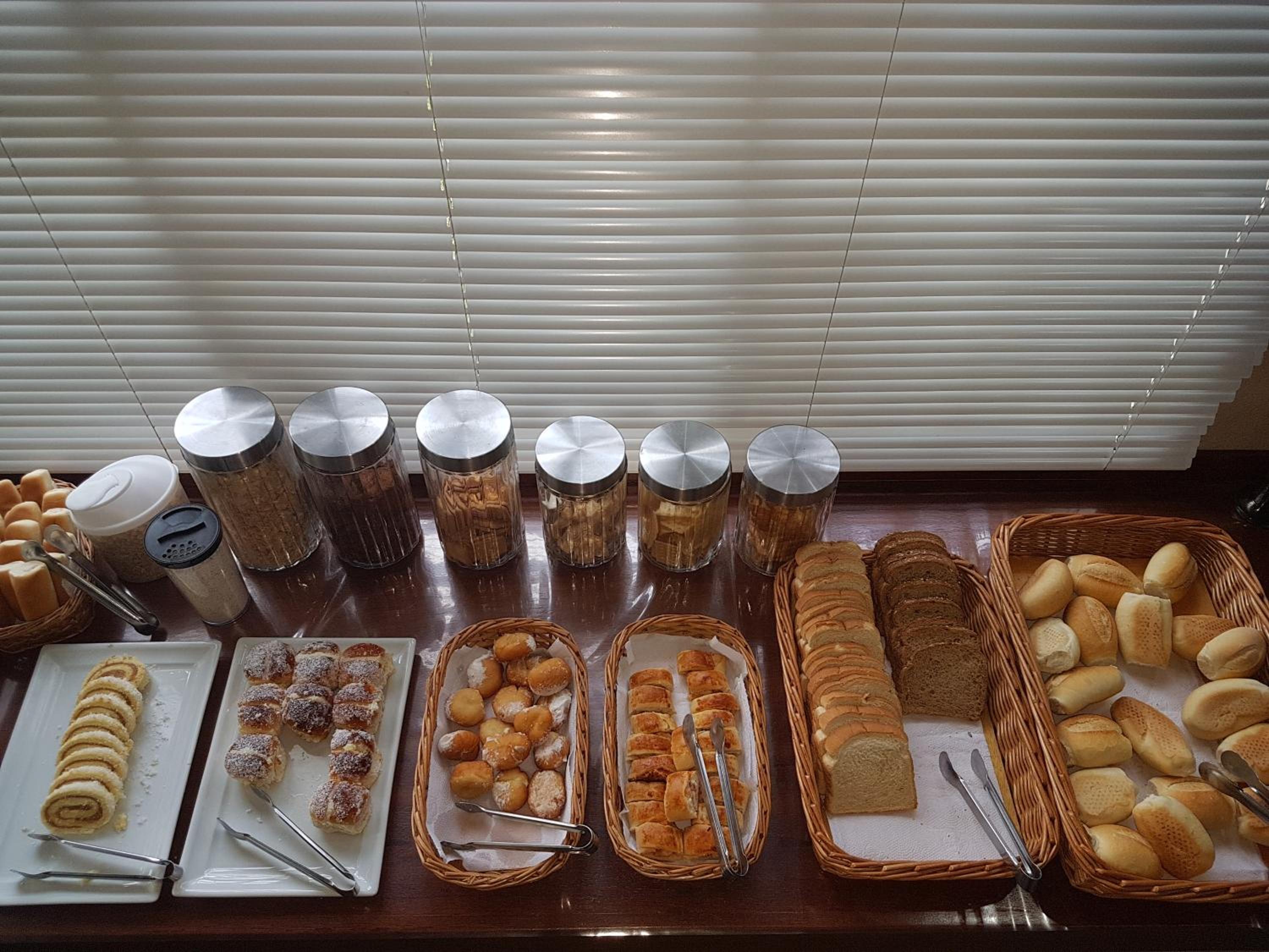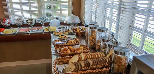Café da manhã com boas variedades, estacionamento, localização.