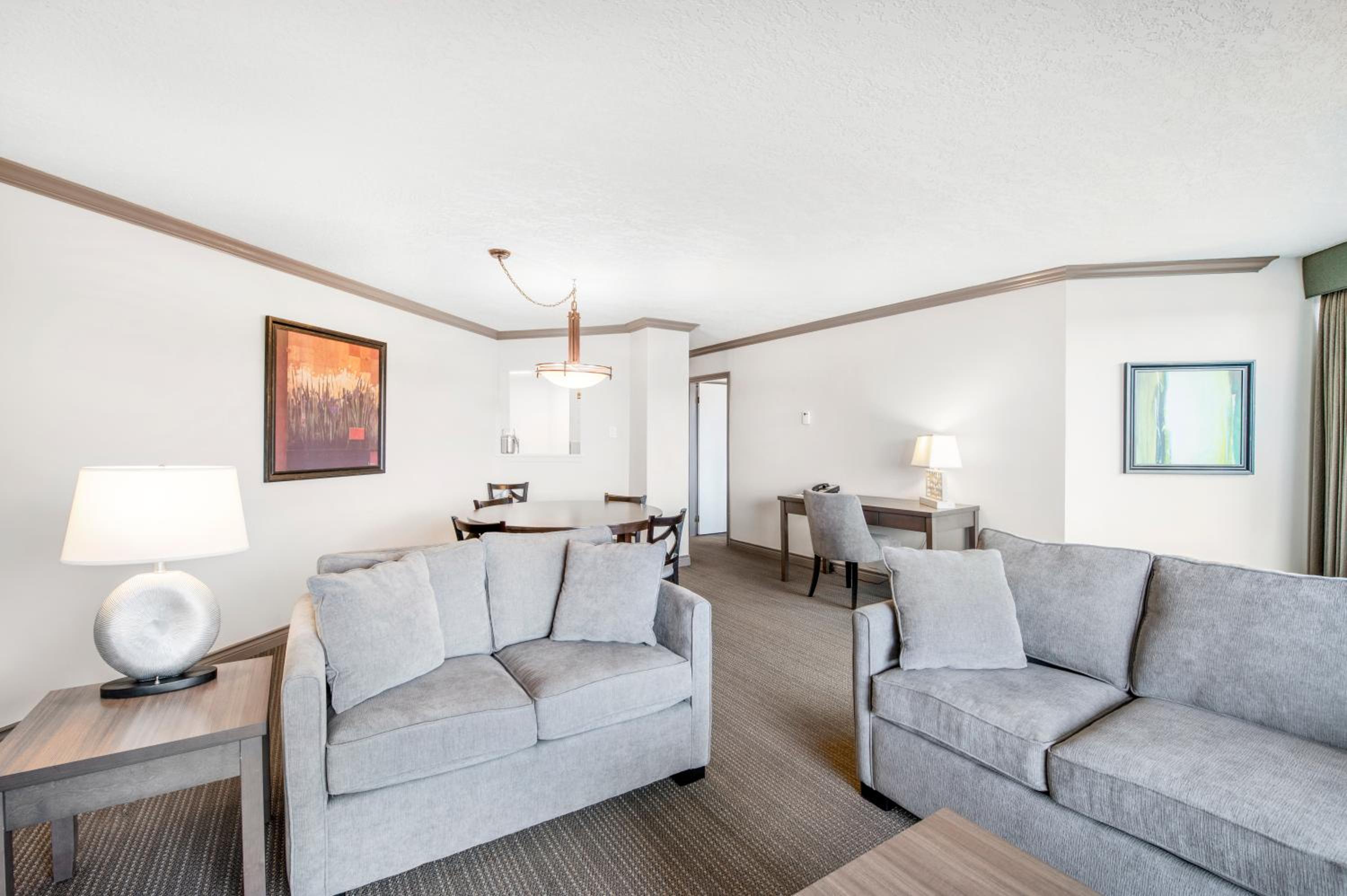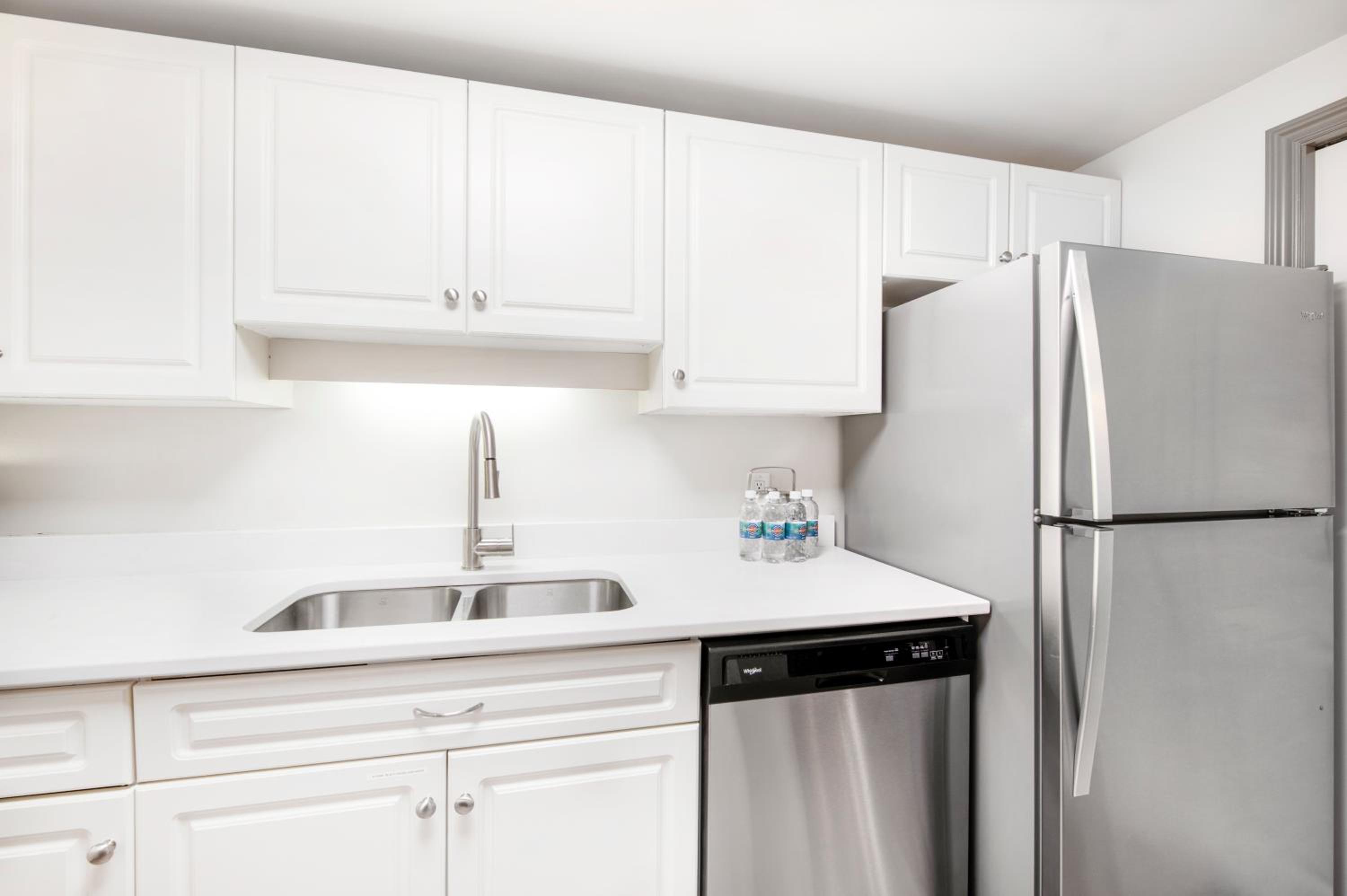 Each guest room is equipped with modern amenities including a flat-screen TV, mini refrigerator, and coffee maker. For added convenience, select rooms feature full kitchen facilities, providing a home-away-from-home experience.