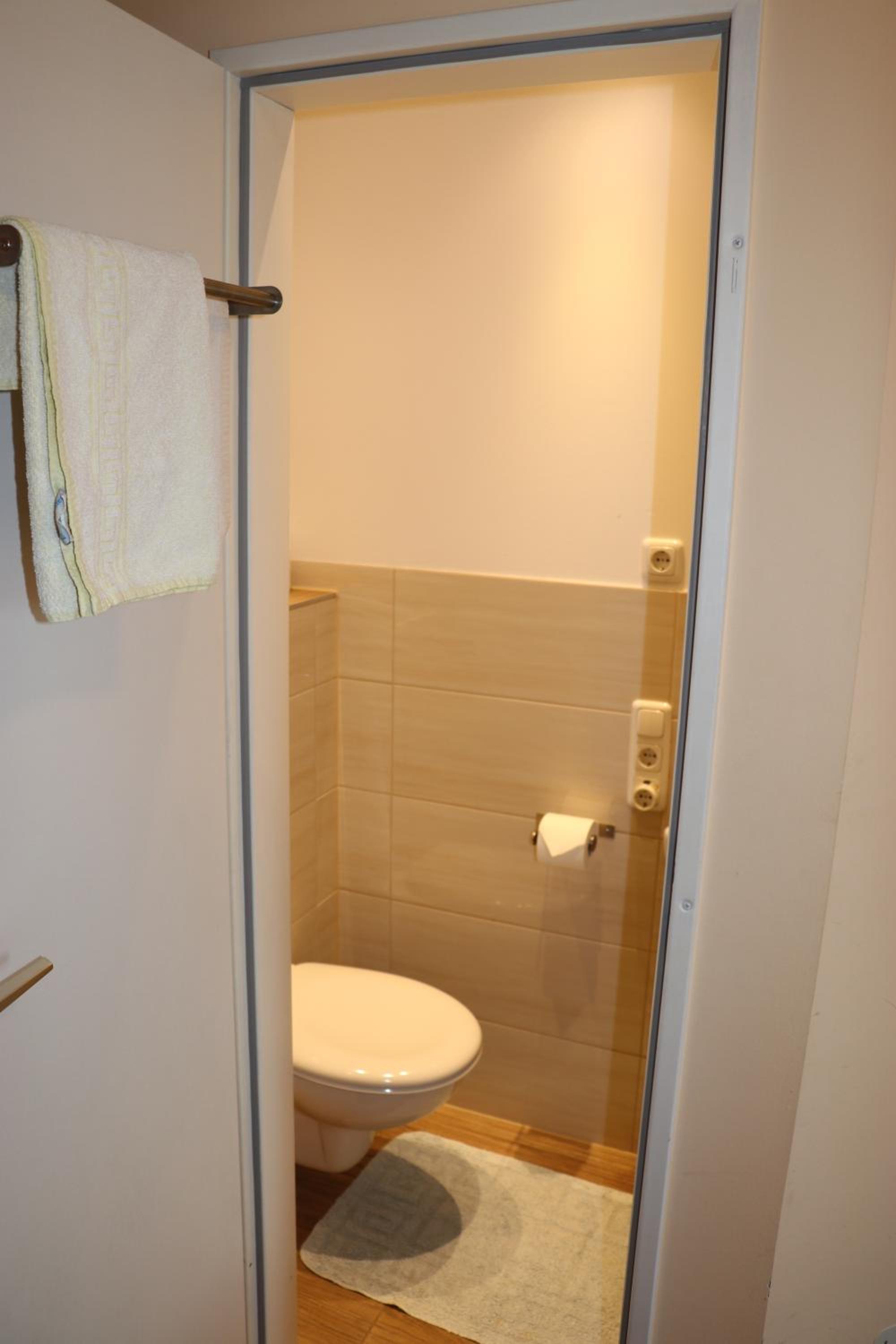 Das Bad allerdings ist wirklich mini-mini-klein. Waschbecken ist vor dem Bad im Zimmer, das ist an sich völlig okay, nur unpraktisch dass das helle Licht am Waschbecken mit angeht wenn man im Bad das Licht anmacht.