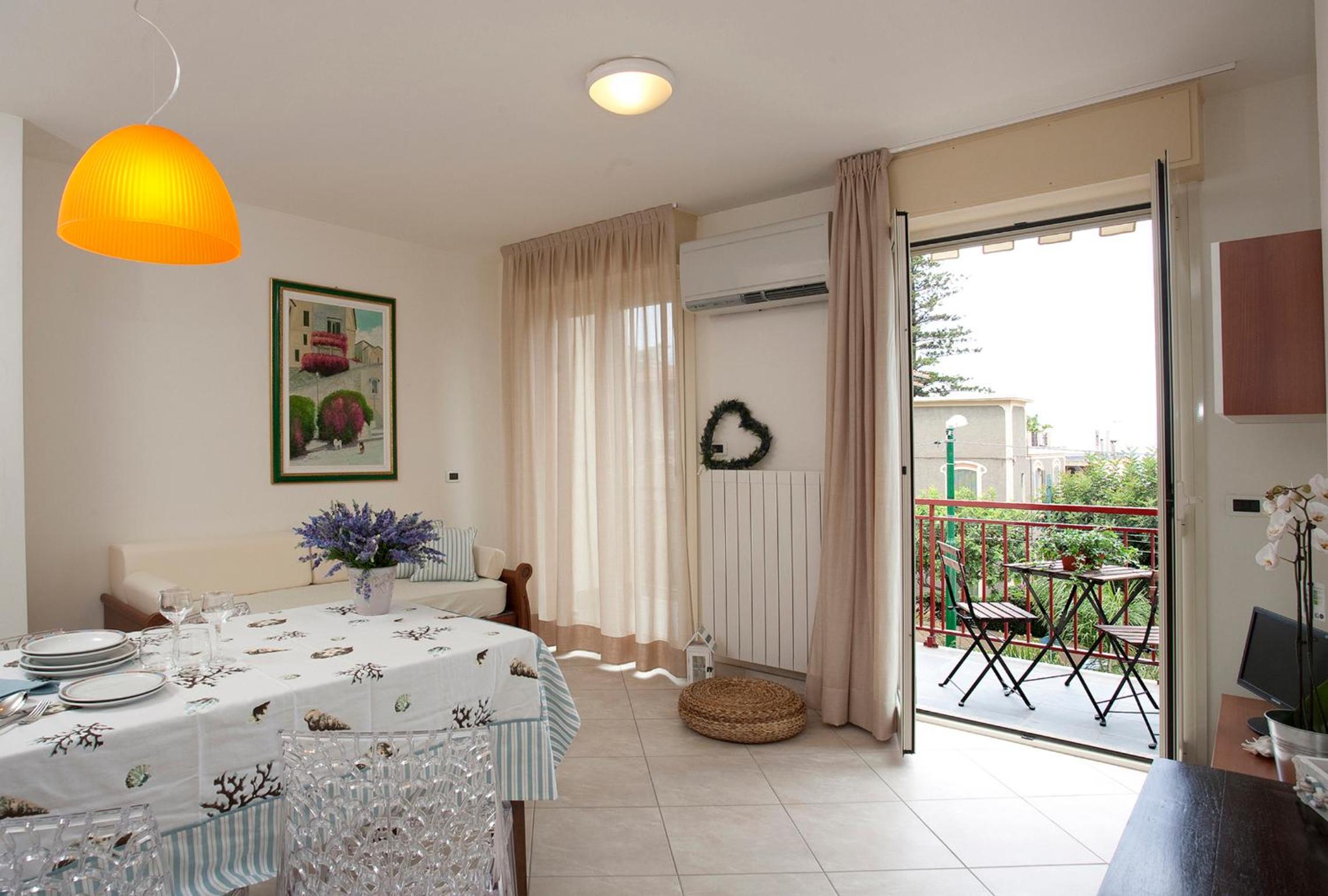 The air-conditioned apartments at Dell'Angelo feature stylish contemporary décor, cool tiled floors, and essential amenities such as an LCD satellite TV, balcony, and free WiFi. Each apartment also includes a convenient kitchenette equipped with a microwave for added comfort during your stay.