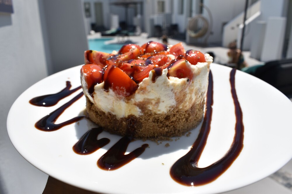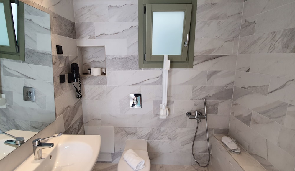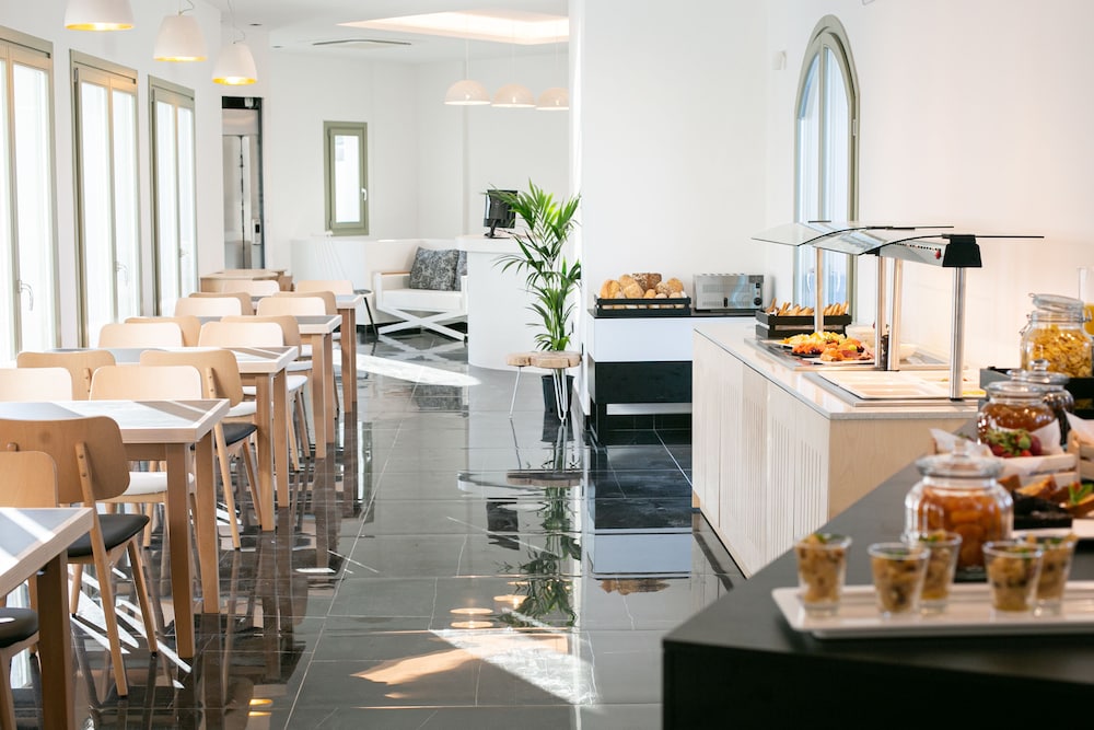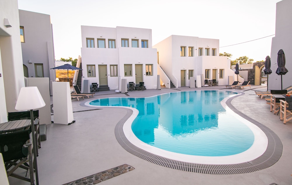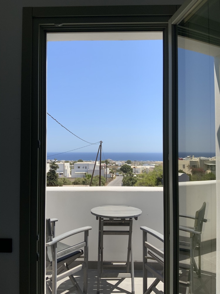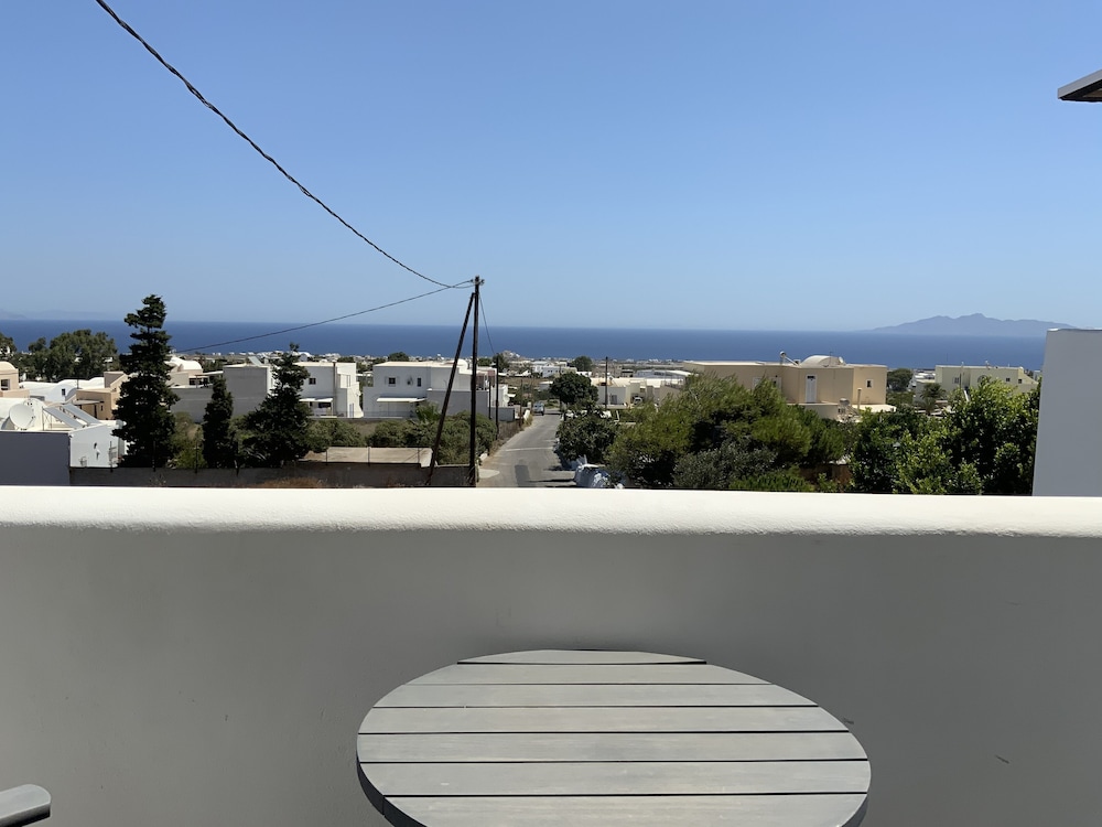 The staff were super welcoming and honored our request for a room with no steps (I think there is one with no steps and a few with 3 steps); this was perfect for my mom who has knee trouble. Everything here is brand new, the beds are comfortable, the pool is great. Getting to Fira by bus is really easy; the bus stops are just a block away. We used the hotel arranged transfer service to get there from the ferry. We used Uber as well. I’m glad I didn’t let the fact that this hotel is located in Mesaria keep us from staying here. We loved it!