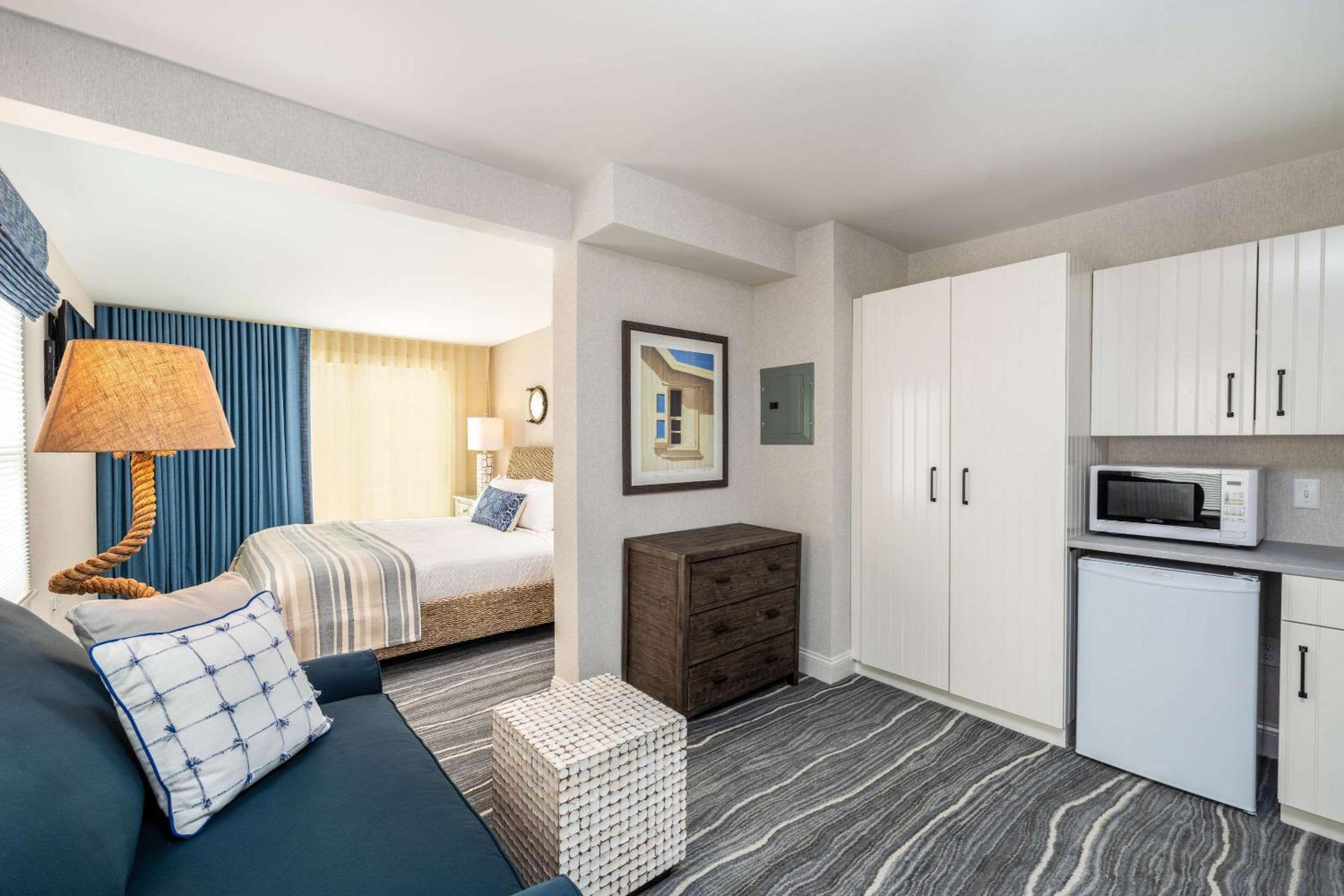 The room was big with a little couch, refrigerator and microwave. Right next to stop & shop. About a 15 min walk to downtown. Very clean, coffee in room. Coffee, Tea and water station in lobby.