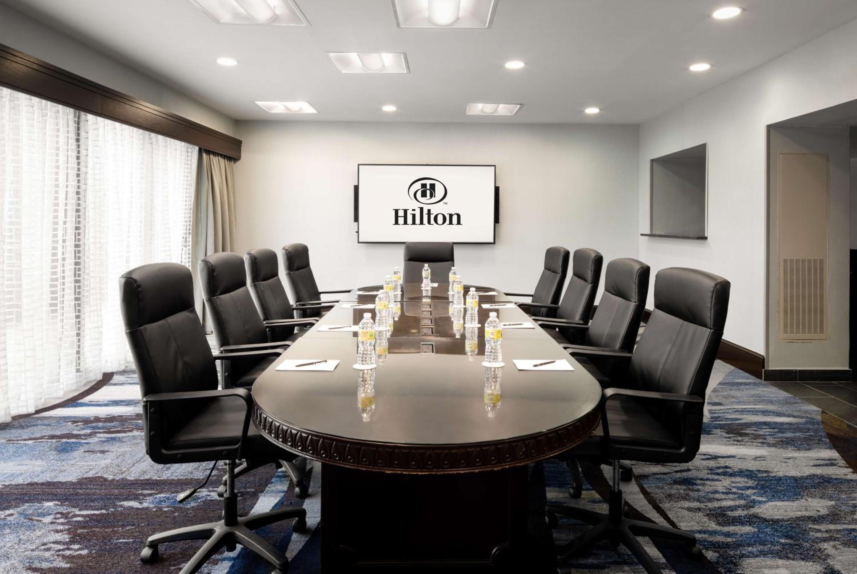 A good, large, clean, modern hotel, with open atrium with a bar and a good breakfast. A very nice Indian/Chinese restaurant is attached, so you can walk in without going outside. Food there is very, very good. But above all the front desk folks, especially Lou and Hicham (not absolutely sure I spelled his name correctly) were wonderful. We stayed at this Hilton during the historic blizzard this February, and we were made to feel so welcome. Lou, especially, was good-humored and super-helpful even in a tough time when many people needed attention. We will definitely be returning to this hotel.