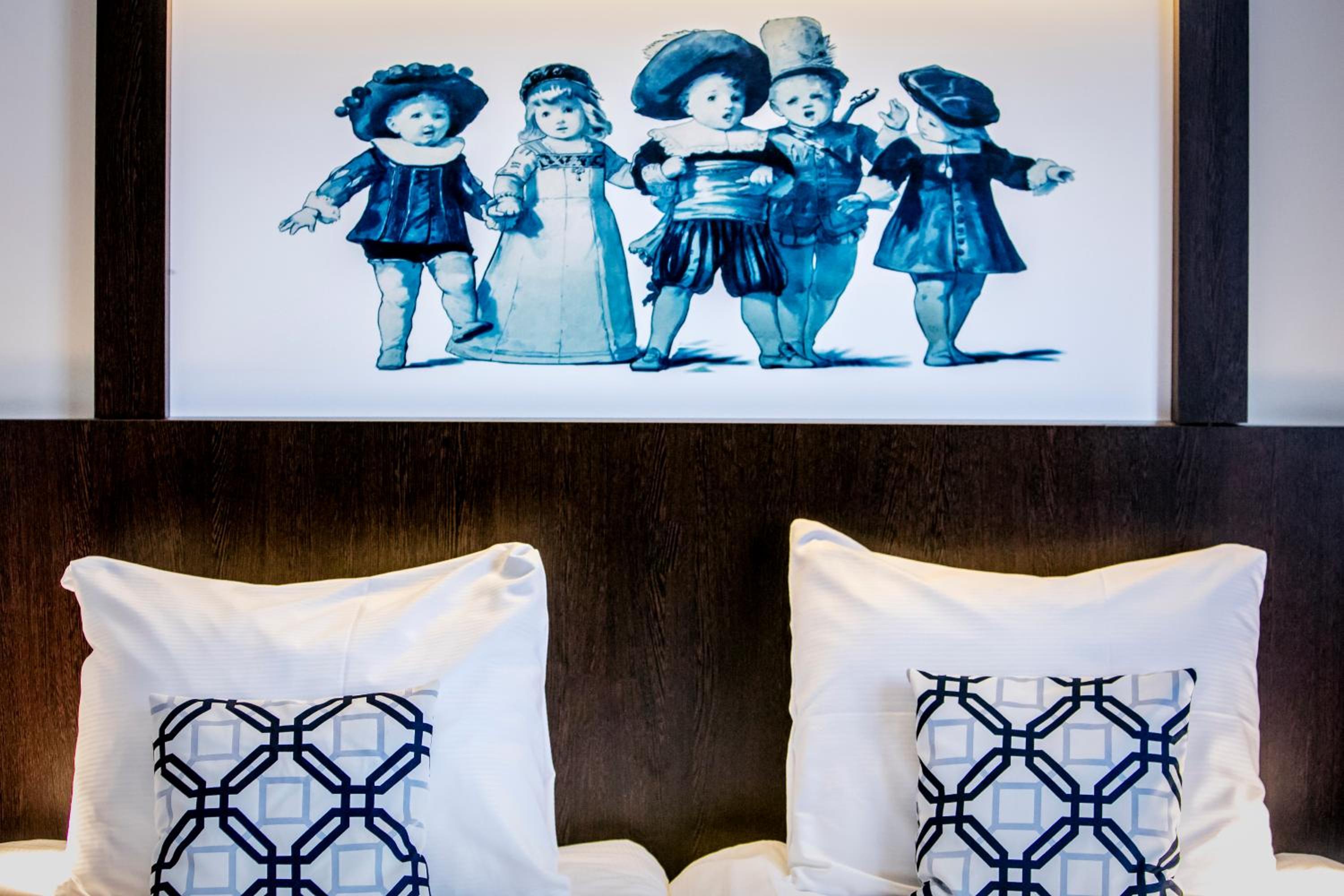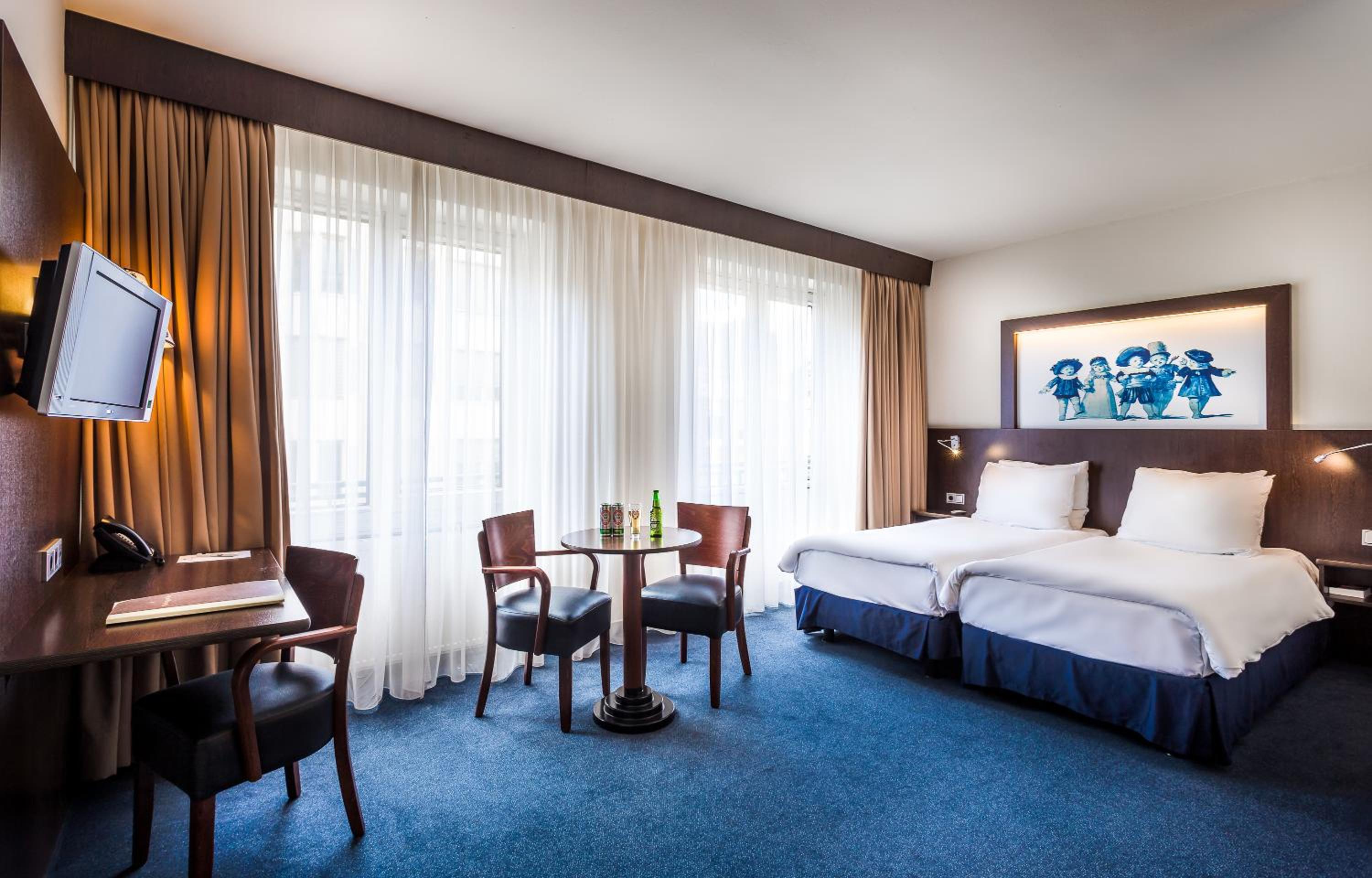 Hotel Die Port van Cleve offers a unique experience with its historic building and modern amenities. Each room is distinct in size and decor, featuring flat-screen TVs and free WiFi. The hotel's bar showcases a stunning Delft blue fresco from 1887, adding to its charm.