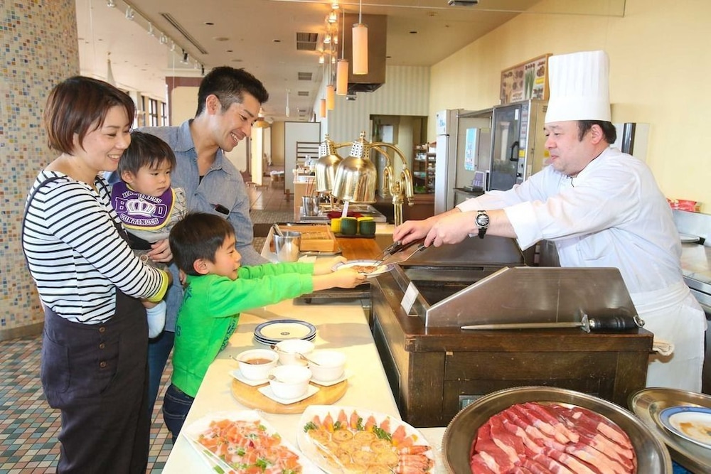しかし、平日だから?なのか、ホテル近郊のショップもレストランも、レジャー施設も、何も開いてませんでした。夜、少しだけ食事しようと思いましたが、レストランは、バイキングのみ!ルームサービスもなし、ホテルの中にあるお土産さやんにも、パン少し(メロンパン?)カップ麺とお土産程度しかなく、結局、自宅から作ってきたおにぎりをみんなで分けて食べました。(保冷剤を入れててよかった)4人(子供2人)で泊まったのですが、予約サイトには、ベッドでも和室に布団を敷いても良いと書いてあったのに、大人2人だからベッド(ツイン)のみ使用、布団を使いたいなら、シーツ一色1,100円支払ってくださいと言われました。朝食のバイキングはとても良かったのですが、お皿を片付けていたら、スタッフが「いいです」と言われたので、『このままでいいですか?すみません』というと、「ハイハイ」と返事。女性スタッフの愛想の悪さは天下一品でした。
