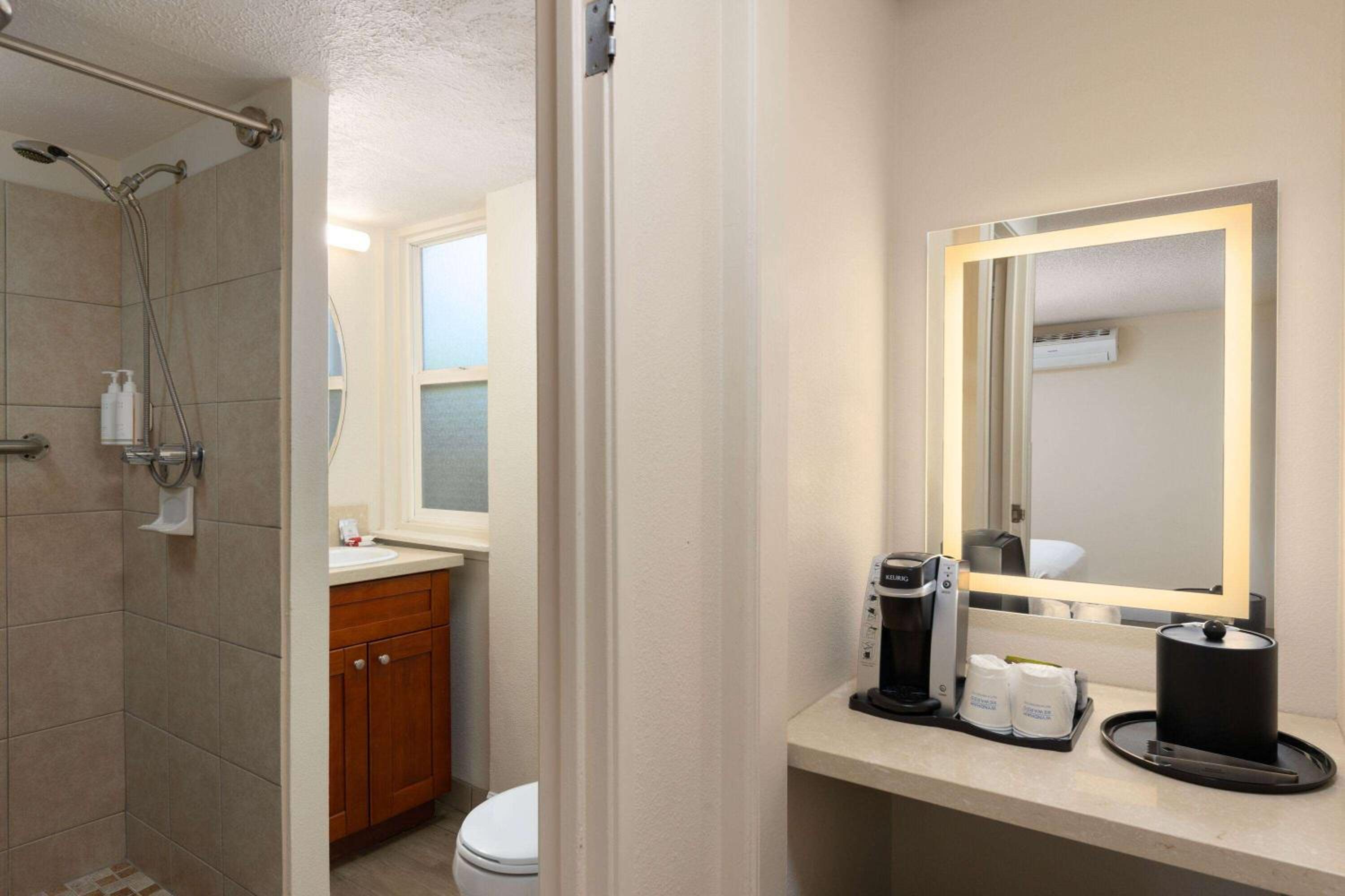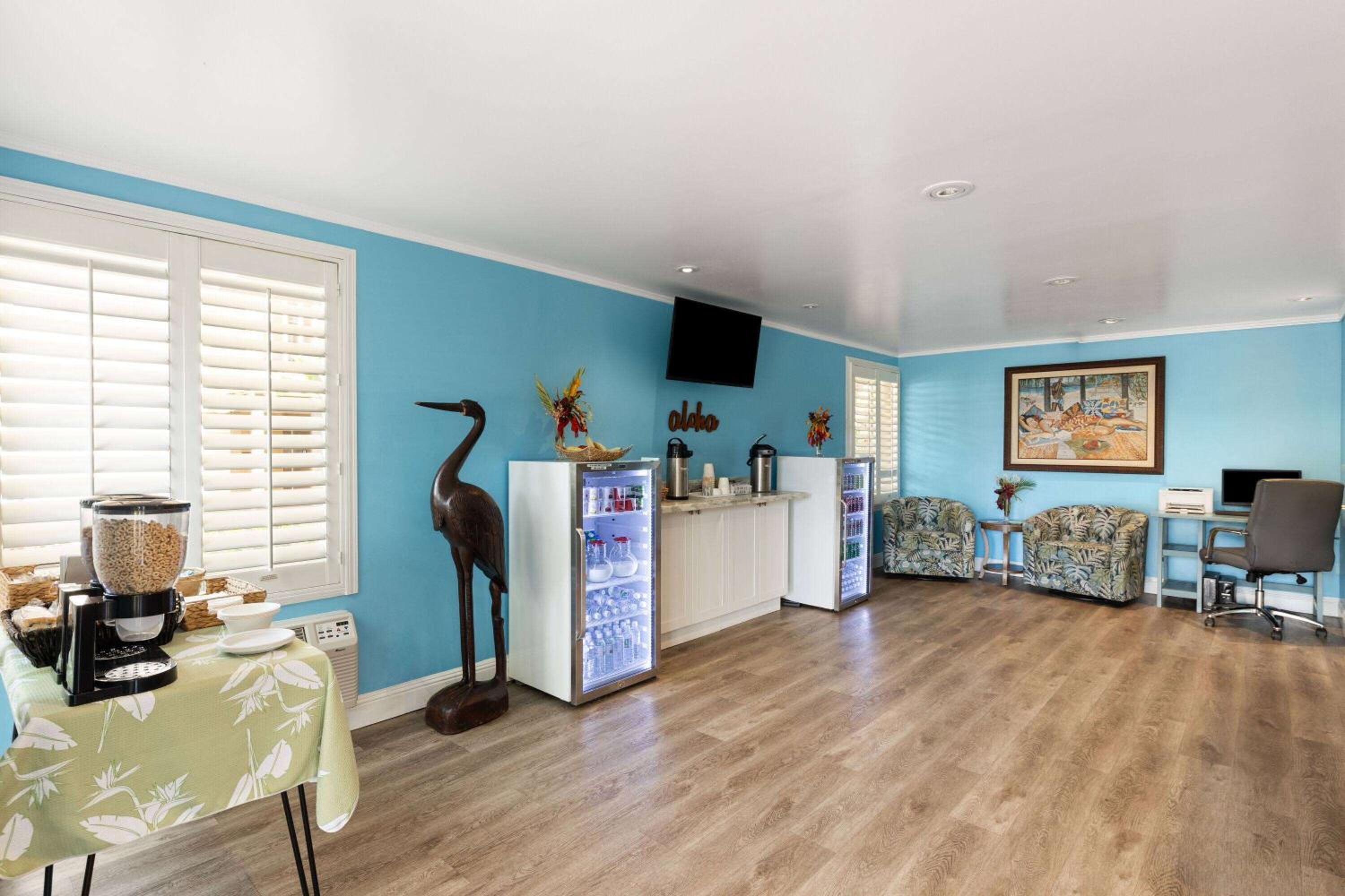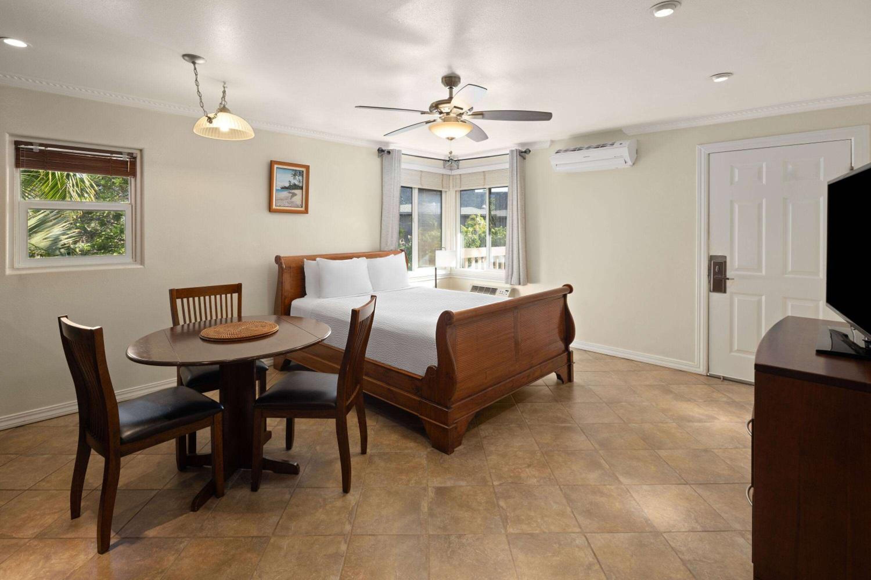 Chris was fabulous at the front desk. Fun to visit with and helpful when the Kona Storm pushed water into our doorway. Used multiple towels to stop up this big storm water. Room is a small basic hotel room. Would of been helpful to have drawers to unpack our suitcases.