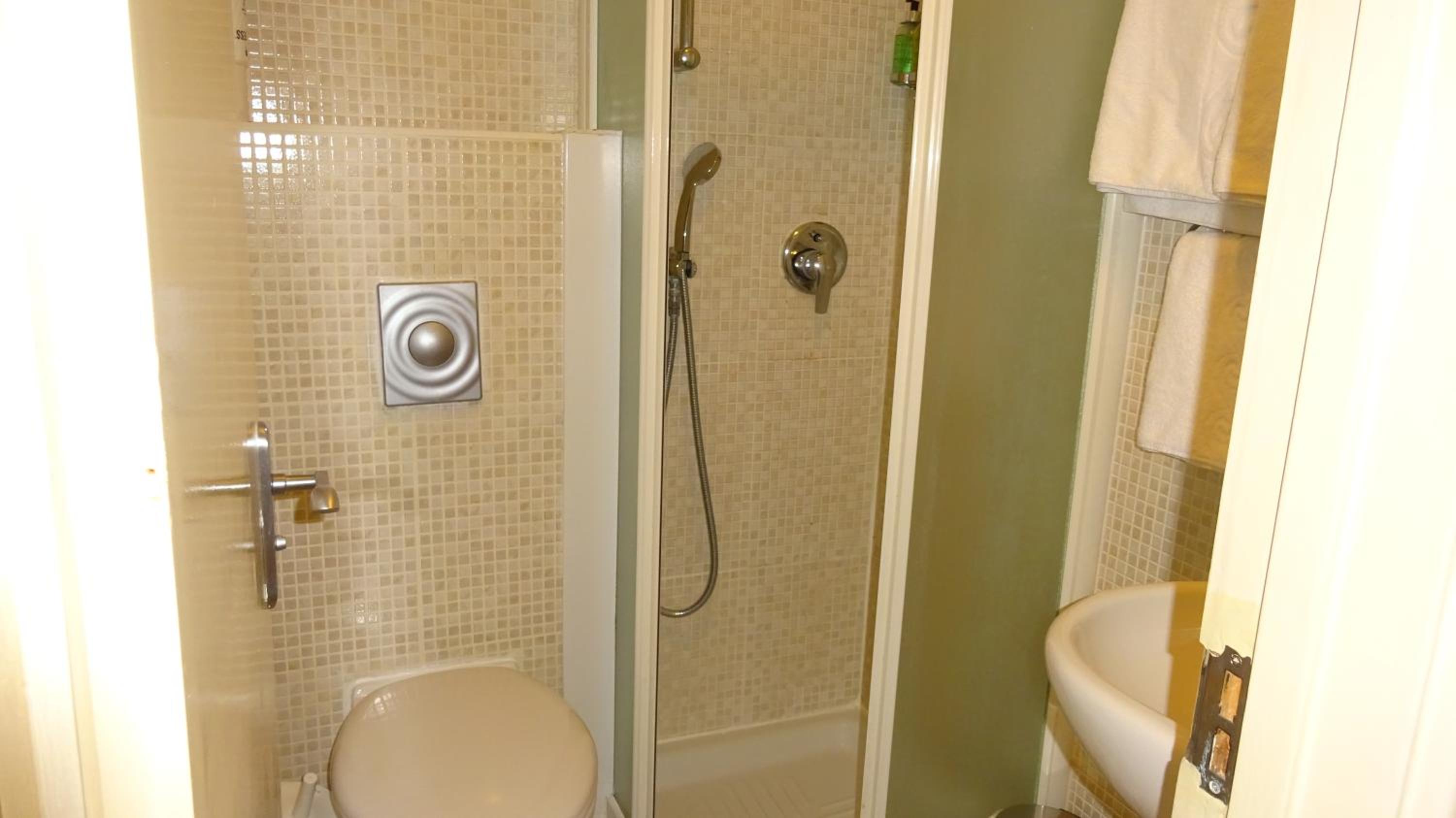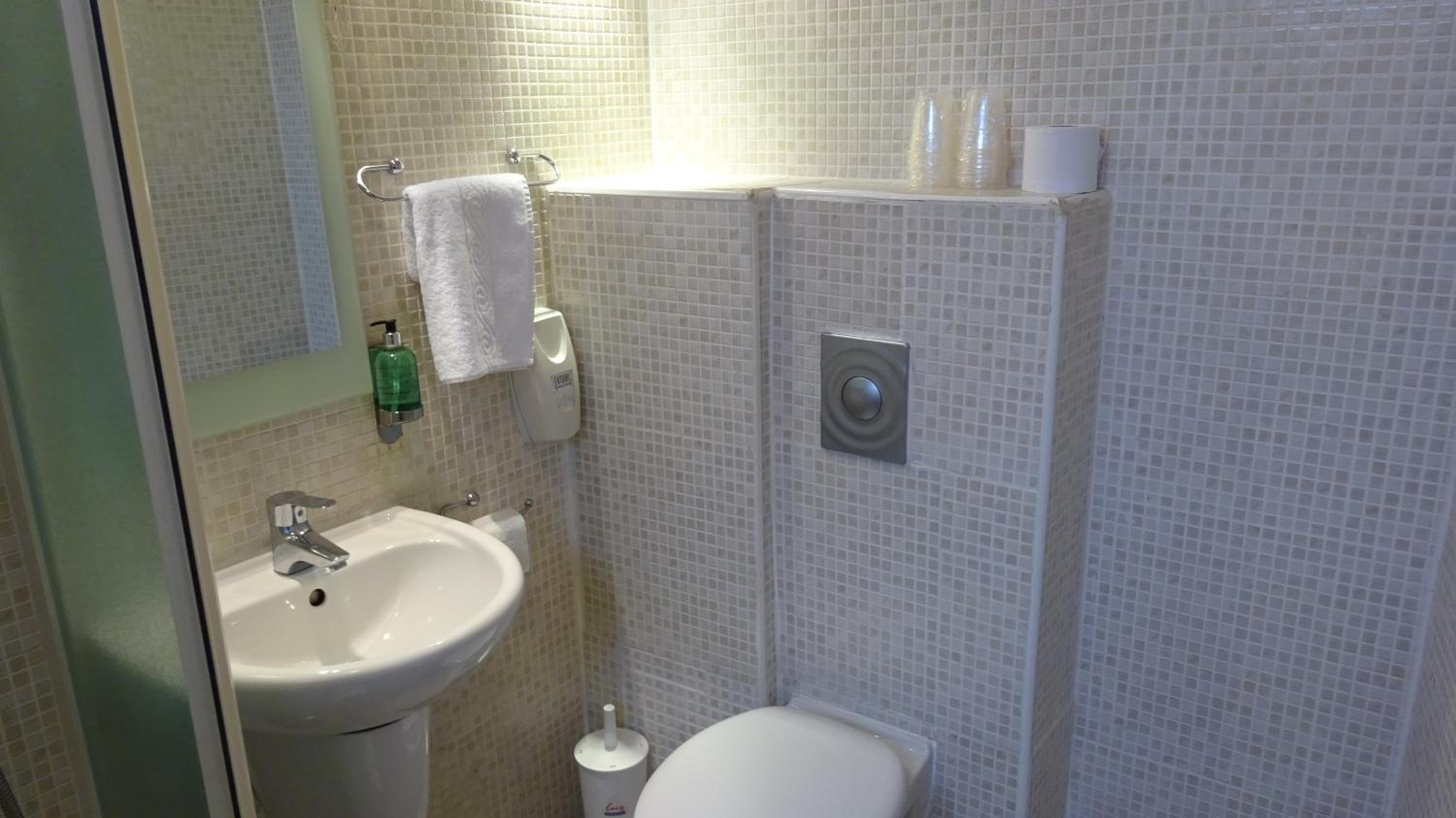 Habitación pequeña y con muebles viejos y sucios (la silla estaba llena de manchas). El baño era diminuto, viejo y lo más importante: estaba sucio, sobretodo las juntas de la ducha y las cortinas de la misma, algo que no entiendo es que aún existan hoteles que pongan cortinas en lugar de mamparas con lo antihigiénicas que son). Los vasos de la habitación estaban sucios también con restos de café.