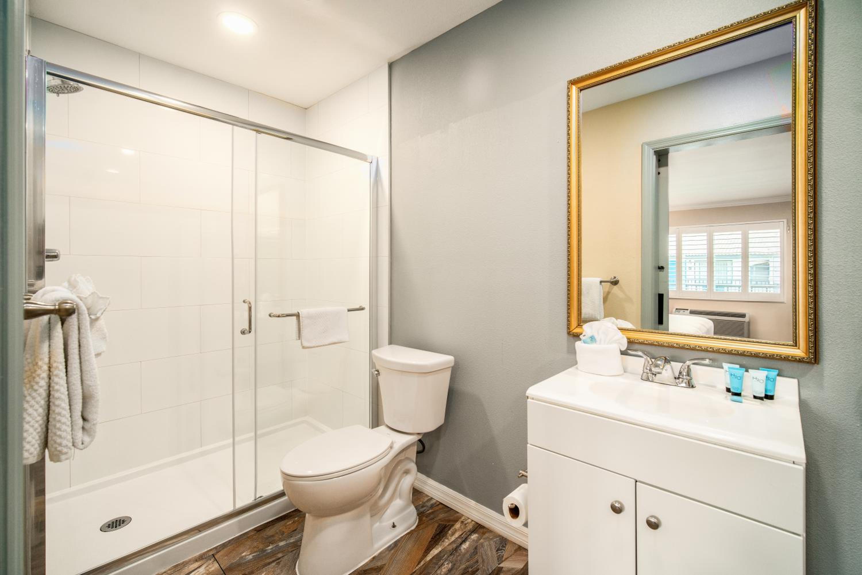 Could have been cleaner with very dim lighting in both rooms and no plastic shower curtains which made water spill all over the floor