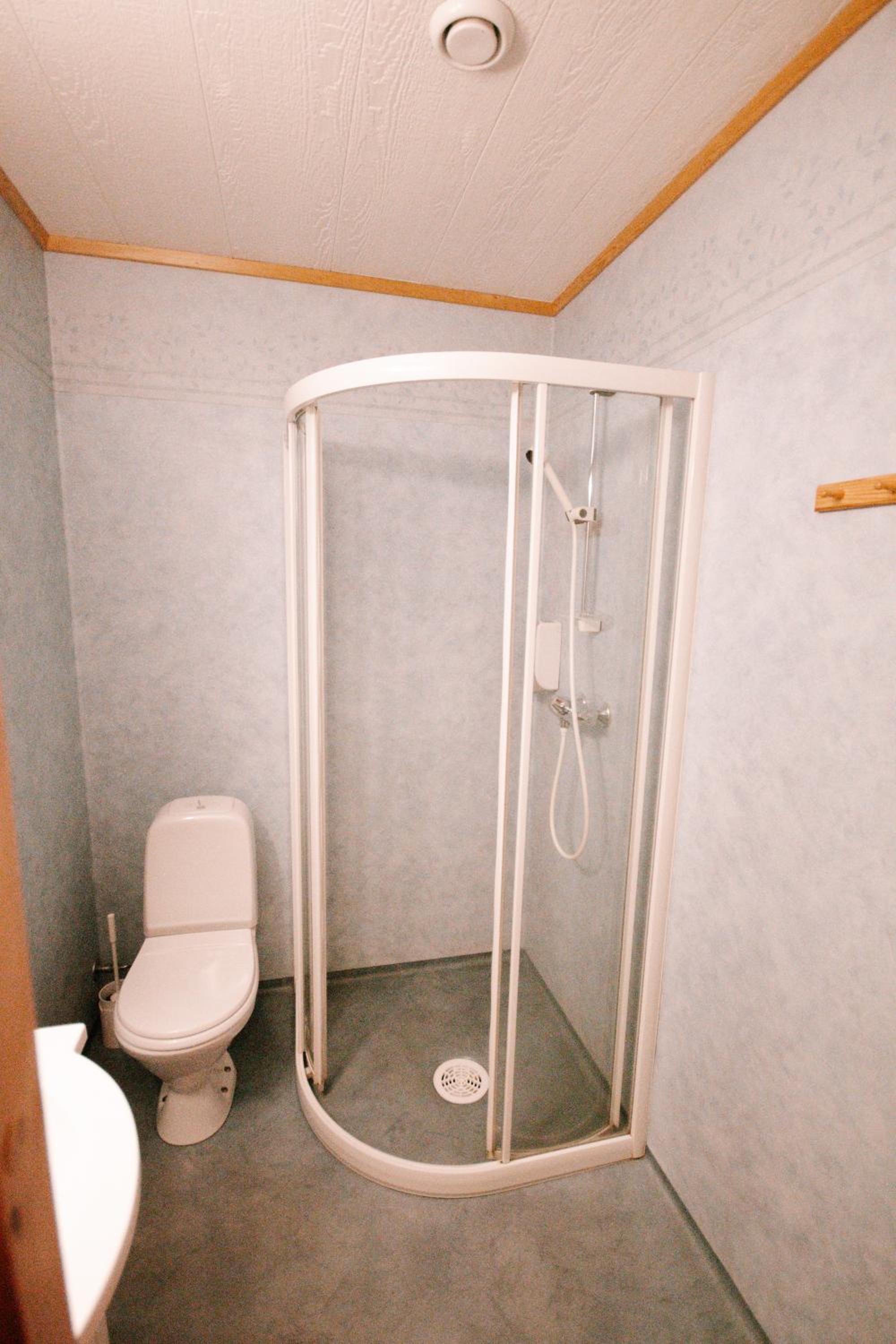 Salle de bain cabine seulement séparé des toilettes par un rideau.