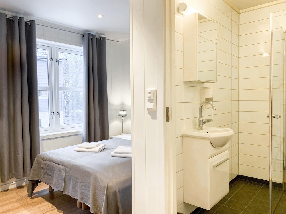 Stort rom med stort bad. Store vinduer med fin utsikt til havna.