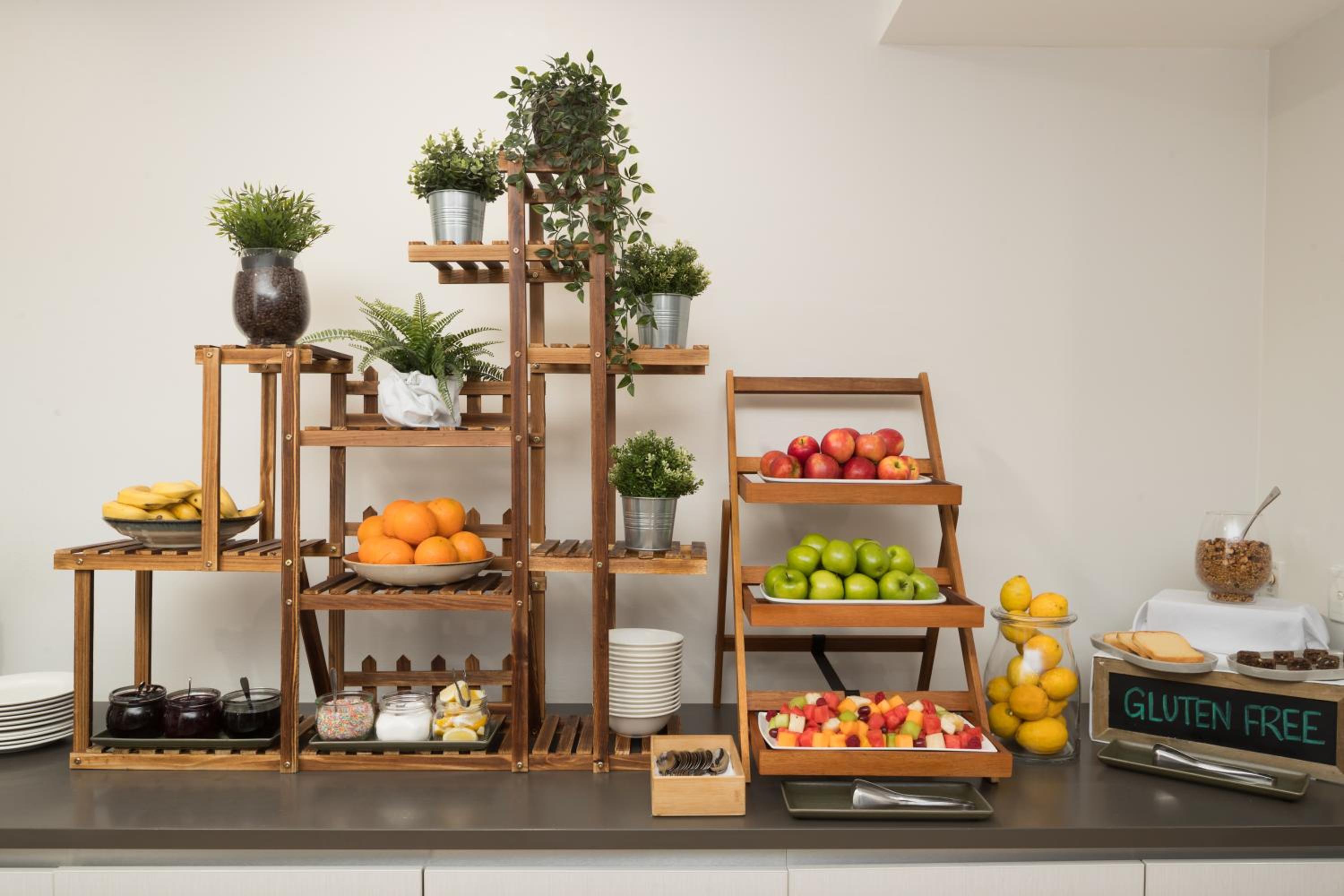 Perhaps a hanging sign or two about a metre above tables saying 'Cereal and Fruit and Hot food" - 'Breads' - 'Tea and Coffee' - 'Fruit Juice'. All too spread out for first timers. Signs would help to get an overview on entry.