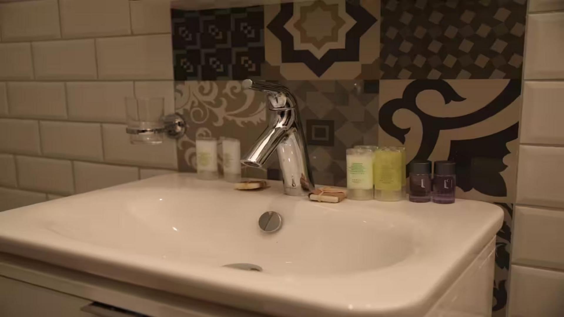 - Saying that this time the bathroom had the ceiling all yellow from humidity the paint was cracking, the base of the shower head was not screwed well which meant that we could not hang it on it but hang it on the tap.