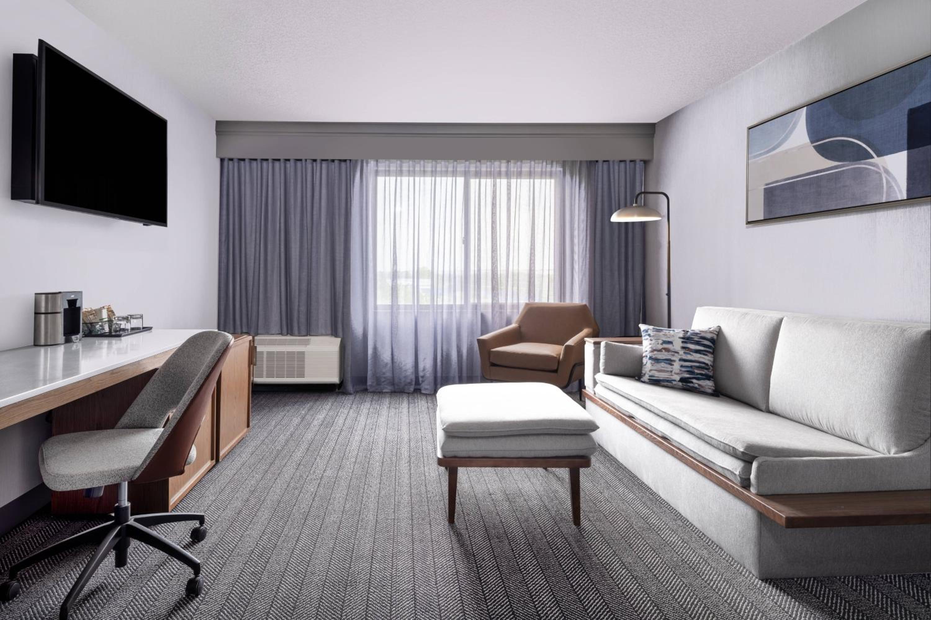 Guests can enjoy a range of amenities including a gym, lounge, free Wi-Fi, indoor pool, hot tub, and a full-service business center. The rooms are equipped with cable TV, pay-per-view movies, and a coffee maker for a comfortable stay.