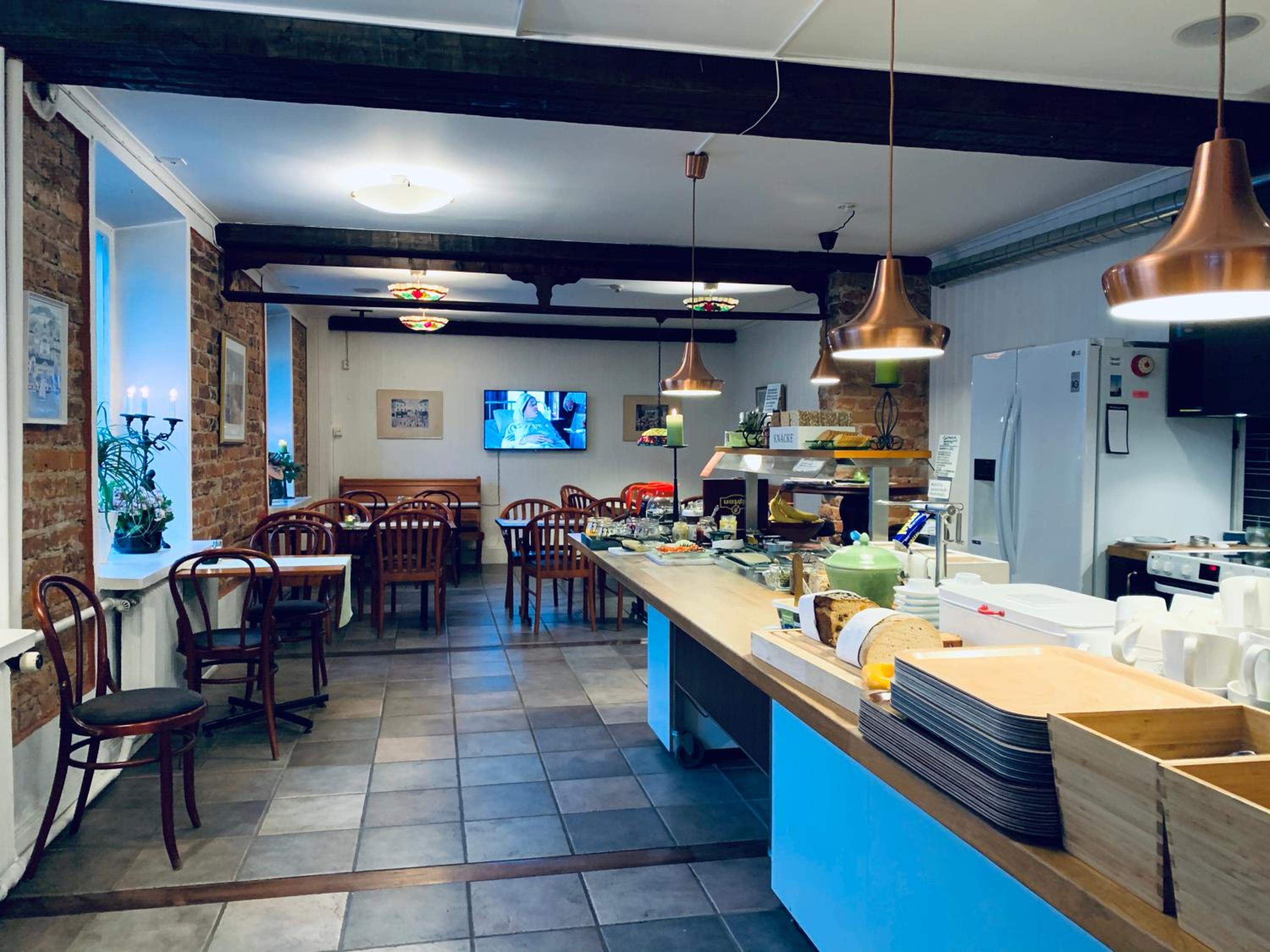 En halvtimme innan incheckning, fick jag veta att vi inte kunde få frukost på hotellet, p g a för få gäster, lite kort framförhållning. Nu löste det sig, då vi kunde gå till First Hotel och äta frukost där.