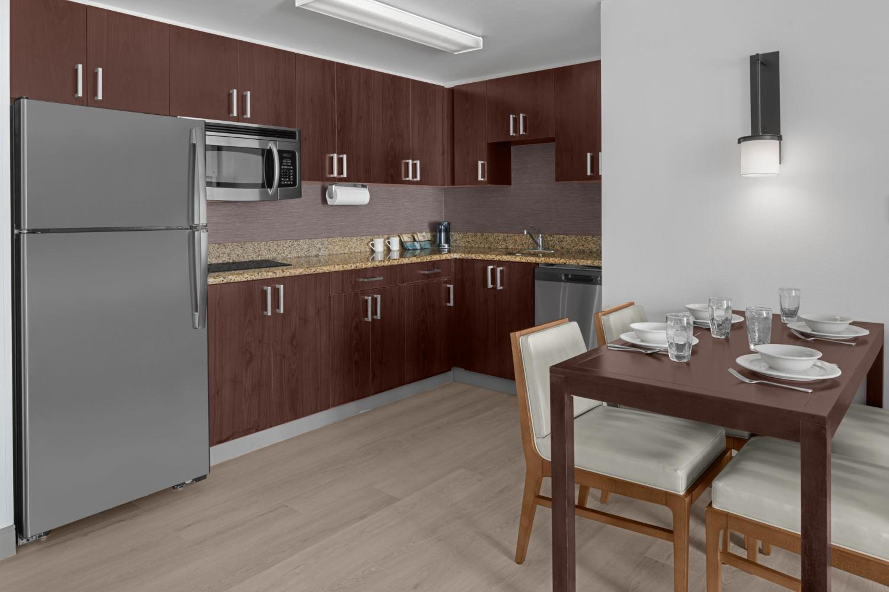 The guest suites at our hotel feature a flat-screen TV with HBO, free wired internet, sofa beds, and a fully equipped kitchen. Additionally, guests can enjoy dining areas, desks, and ironing facilities for their convenience.