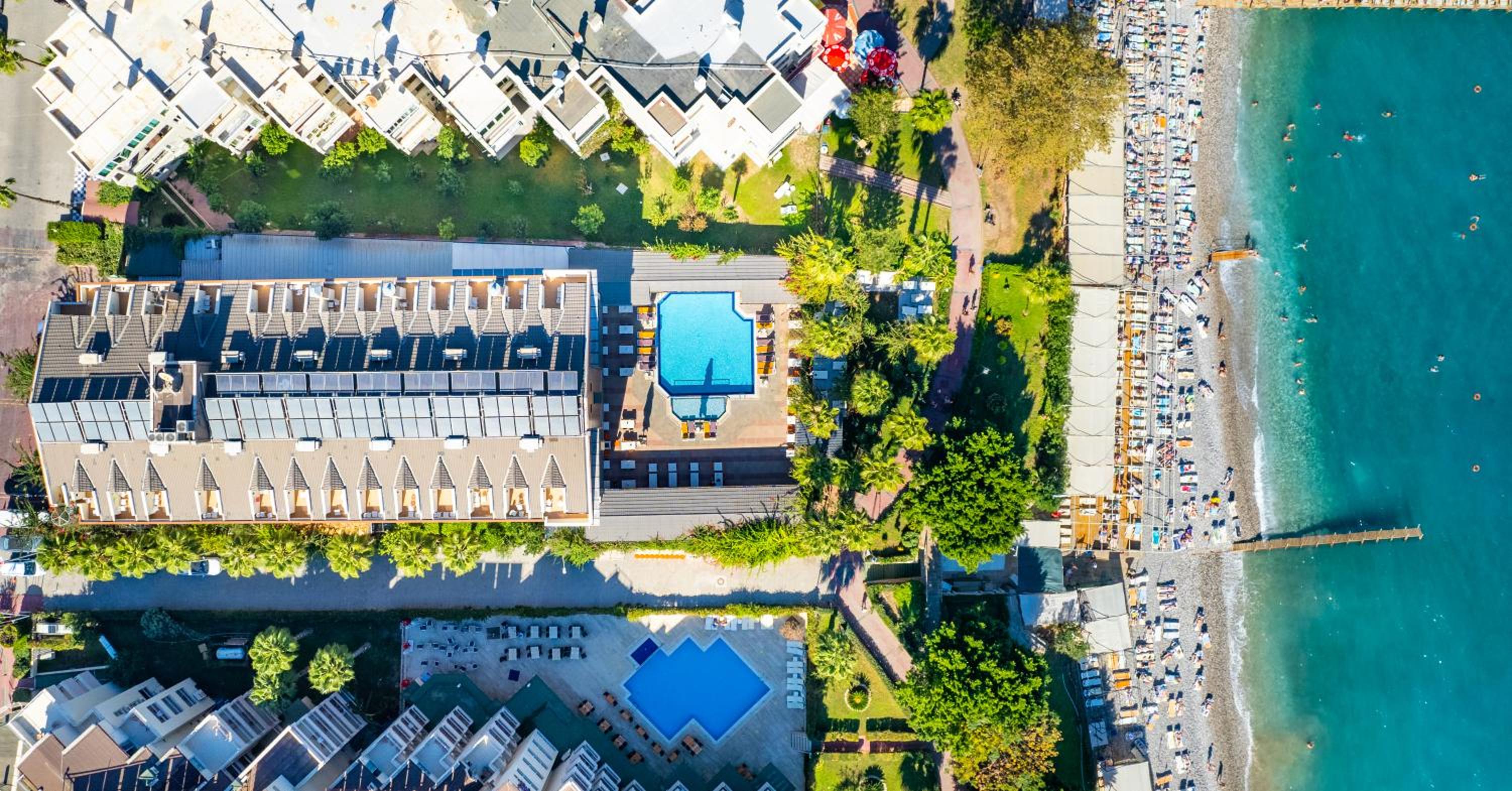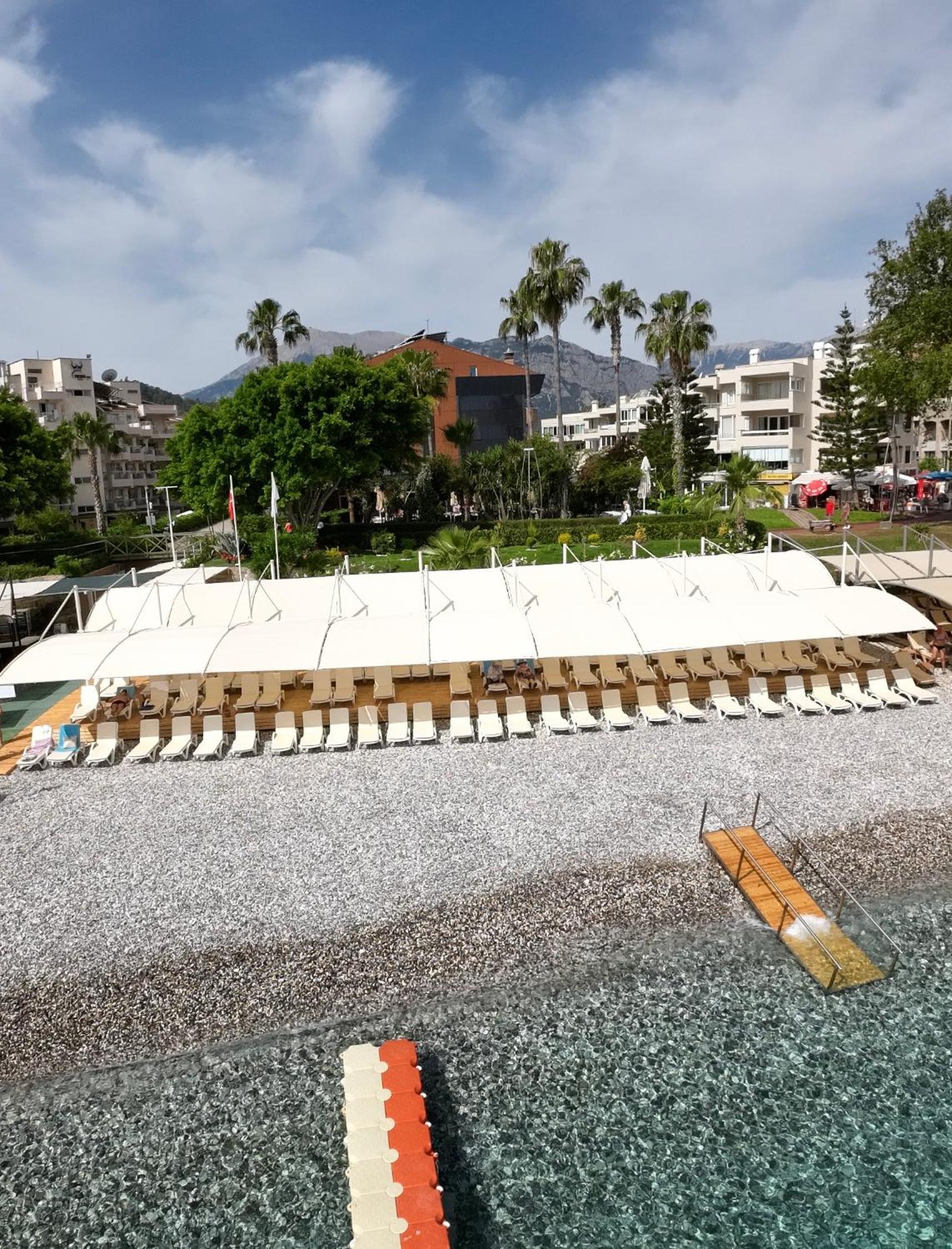 Had a bad experience checking in, took almost 2h to get our rooms. Front desk staff was very incompetent about checkin process and in general. We got rooms in a different hotel building then advertised (5-10min walking to main beach side hotel), this was not well clarified on website. You see main hotel’s photos during booking. The rooms in the adjunct building are brand new, quite and clean. But there are no elevators and it has 4 floors. It is on the land side, no seaview. Food is served in the main hotel and was good. Of note, main hotel lobby and restaurant have no ac, gotta take a dip in water or go back to hotel room to cool down. Kemer bay is calm and excellent for swimming. Beach is a pebble beach. Lounge chairs are too crowded and too close to each other, you cant even walk in between them. You have to pay a deposit for beach towels, a weird system instead of giving towel cards. Pool is small but sufficient for a quick dip. Main hotel’s location is nice, right next to beach and there is a nice pedestrian path to walk/jog. Overall, i dont think i ll stay here again. There are other nicer(but more expensive) alternatives right next to this hotel.