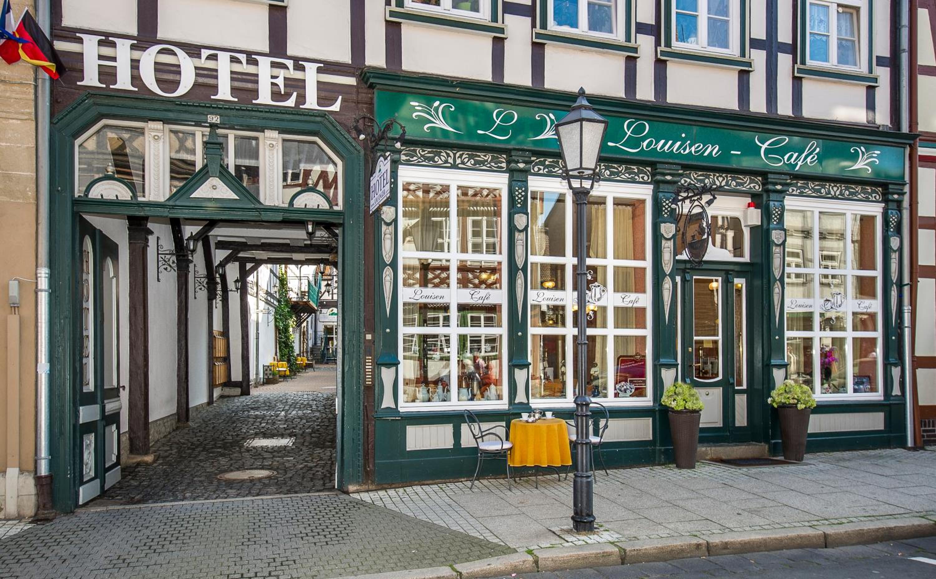 Das Hotel ist sehr zentral gelegen. Es ist interessant gestaltet, da es sich über mehrere Häuser zieht. Das angegliederte Café hat einen sehr schönen Charme.