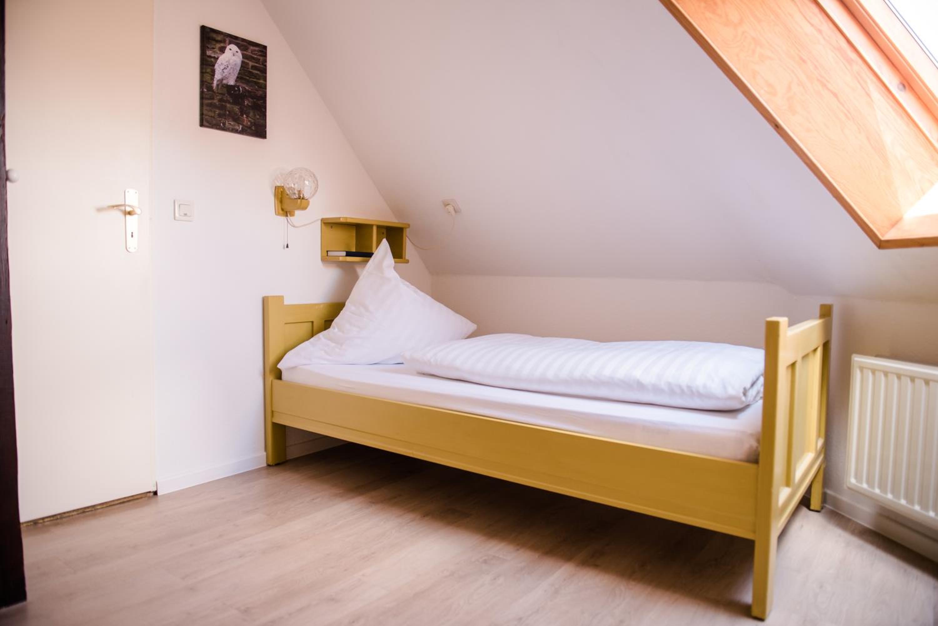 Hård senge gulve der knirkede meget lydt ind til naboen meget højt op til badet bjælker hvor man nemt ku støde ind i.