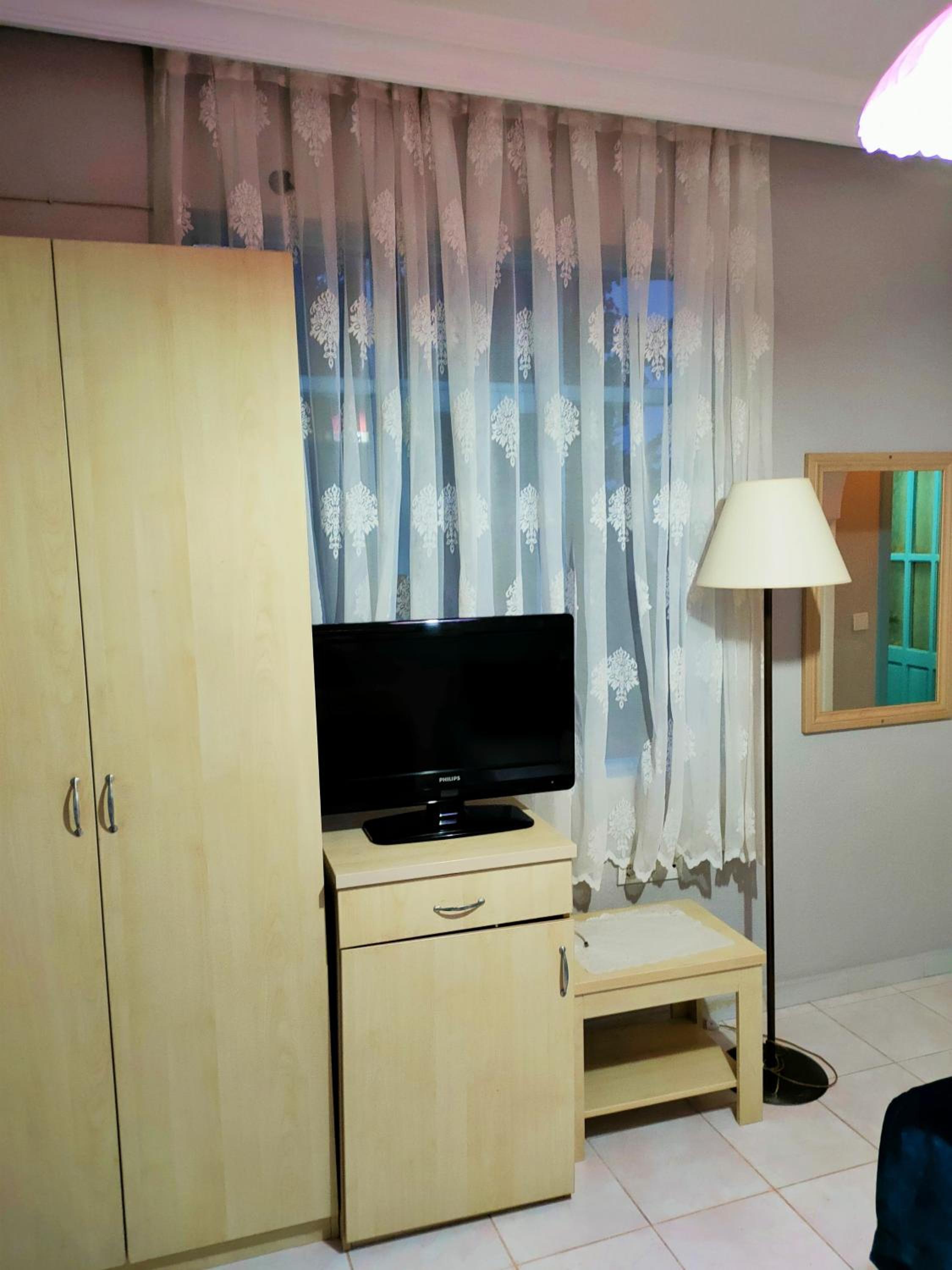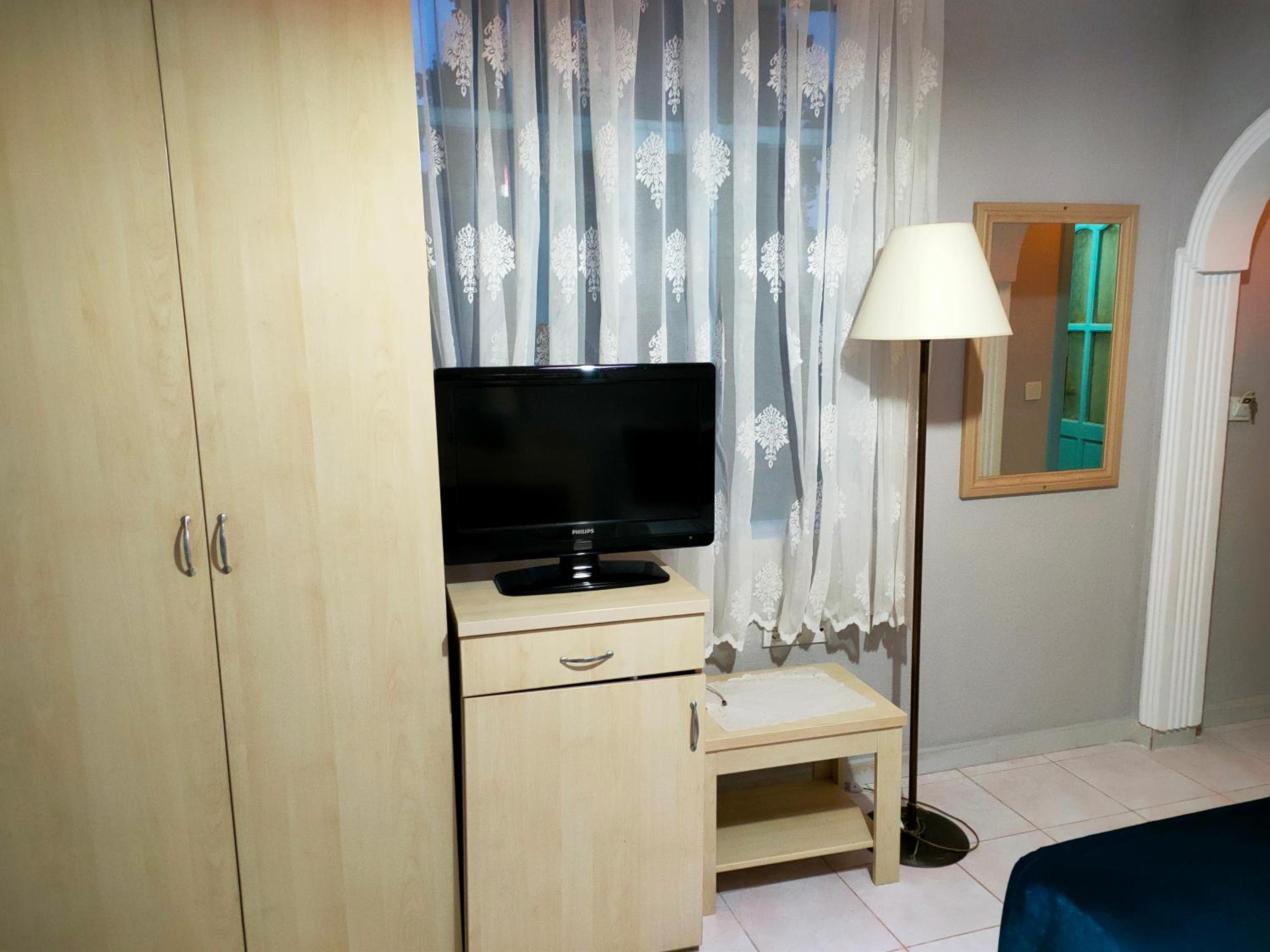 Unfortunately, many things were disappointing. The Wi-Fi didn’t work in the room at all, and on the balcony only the free network showed up—the one we got a password for didn’t reach past reception. The room itself was old, just freshly painted, with only two working lights that gave very little brightness. There was a noticeable mold smell masked by strong essences. The TV was very outdated, the mini fridge barely worked, and the lamp was rusty. The beds had sand on them, one cover had holes, and another was stained. The bathroom was generally clean, but the sliding doors were dirty and moldy, and the shower pipe was cut, causing water to spray everywhere. The hairdryer would only work for about five minutes before shutting off, then needed time to cool down. The wardrobe was too small for a triple room.