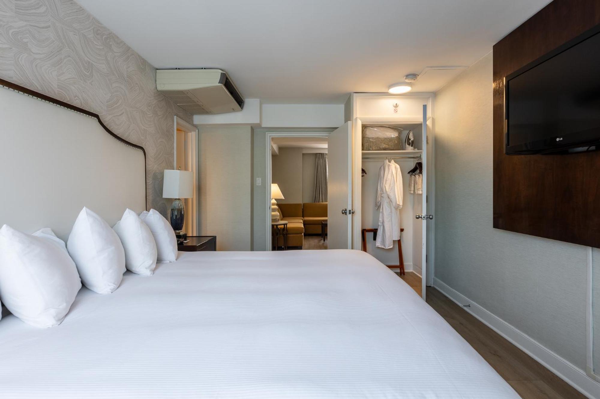 Indulge in comfort with guestroom features including plush carpeting, elegant wallpaper, and modern bathrooms with stand-up glass showers. Enjoy entertainment on a 40-inch TV with cable channels, and unwind in cozy robes provided in each room.
