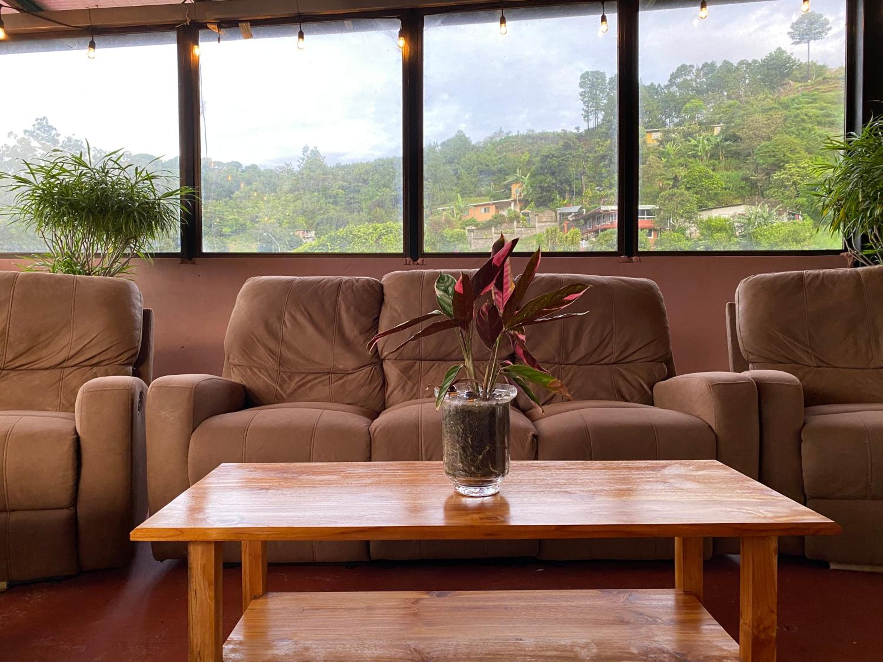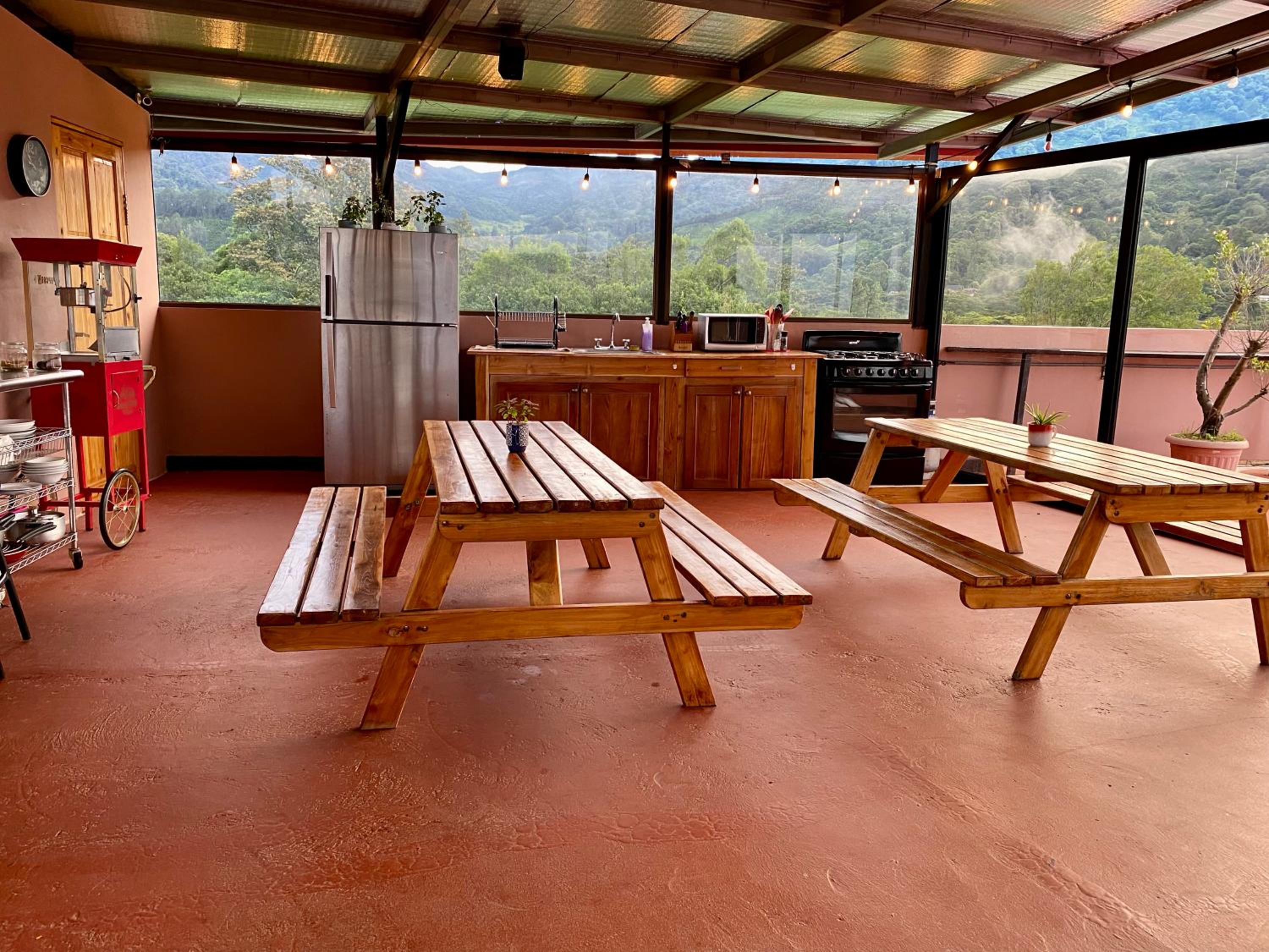 The only rooftop patio in downtown Boquete, spanning over 200 square meters, provides a 360-degree panoramic view. Enjoy the partially covered space with reclining sofas, picnic tables, and a projector for entertainment.