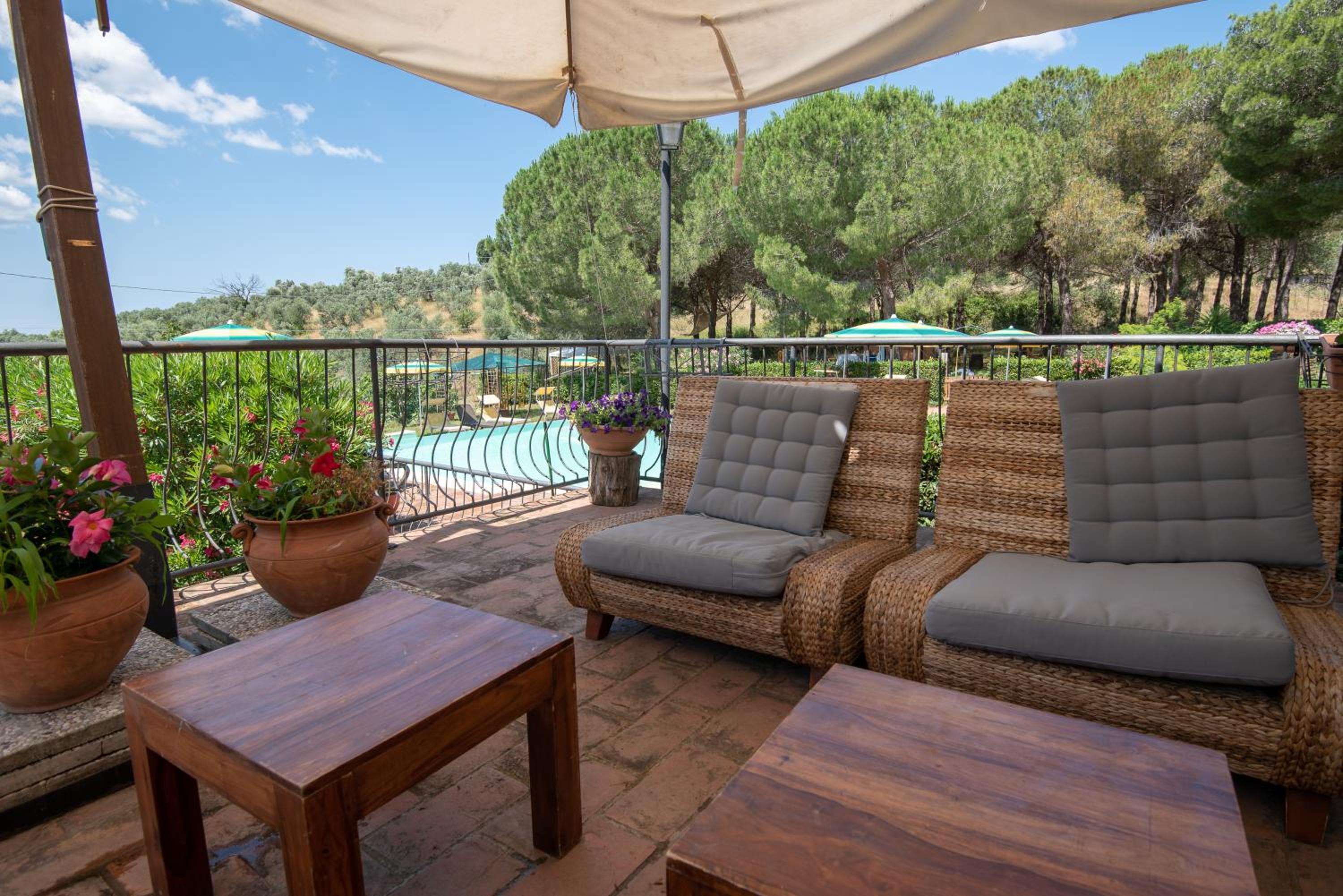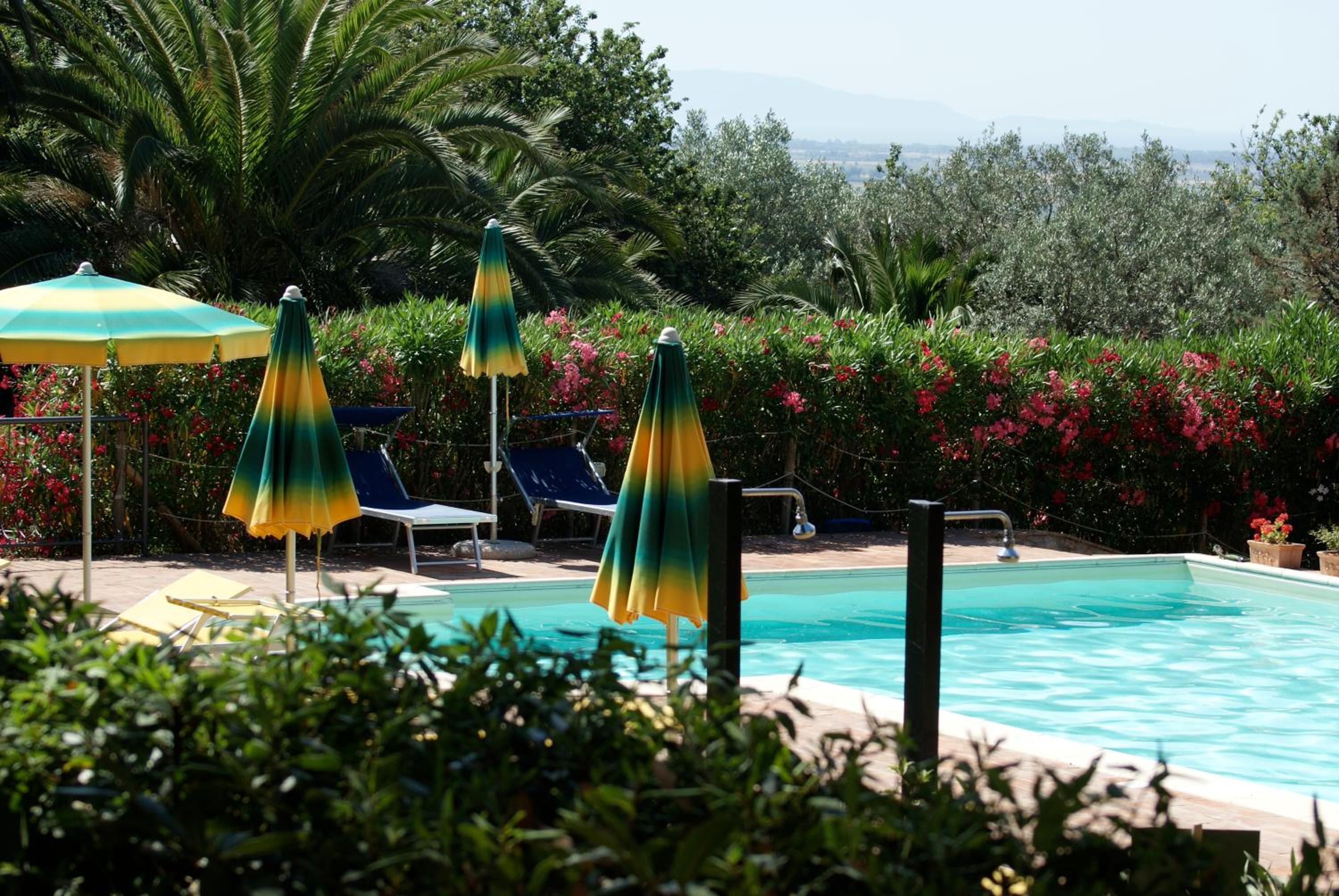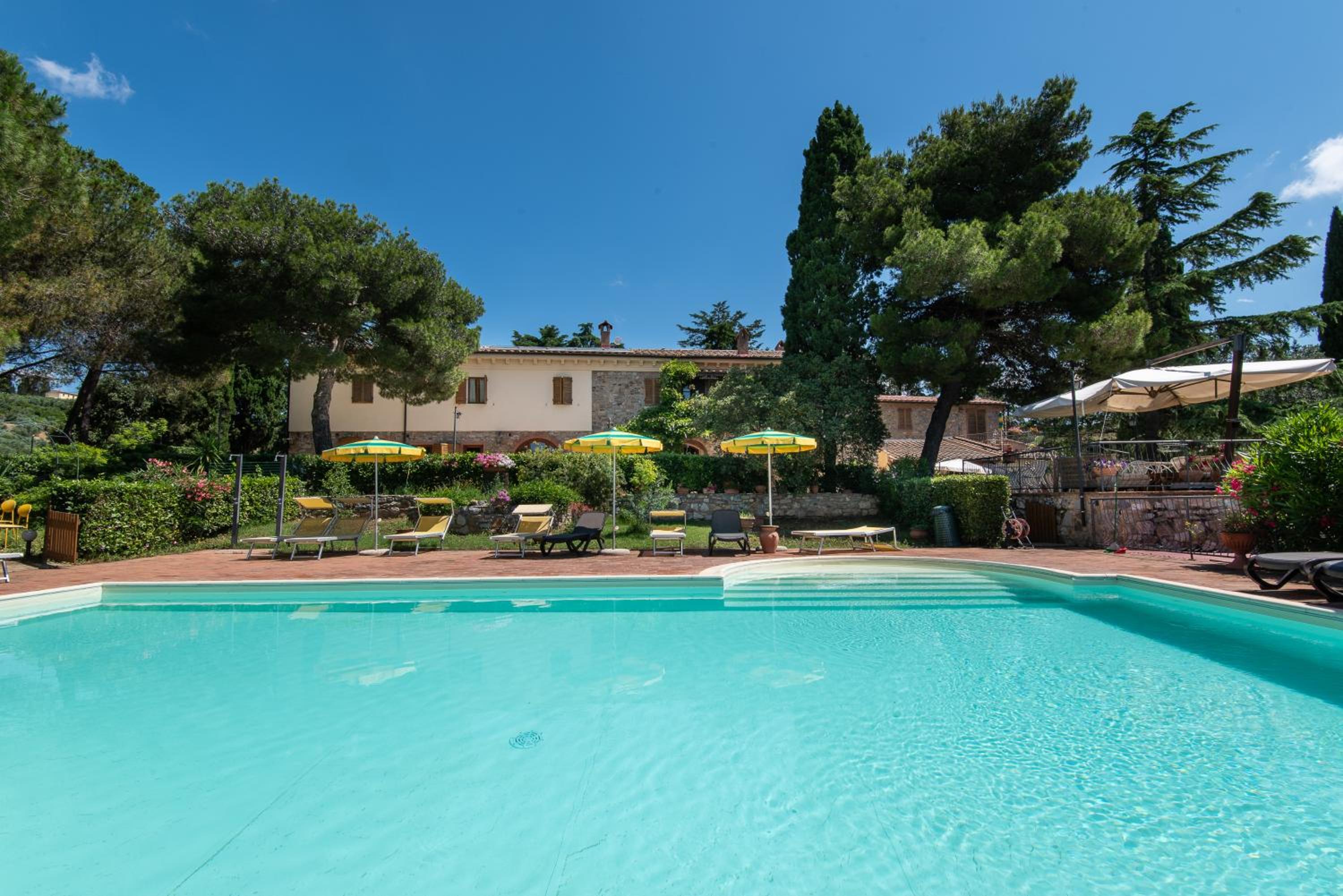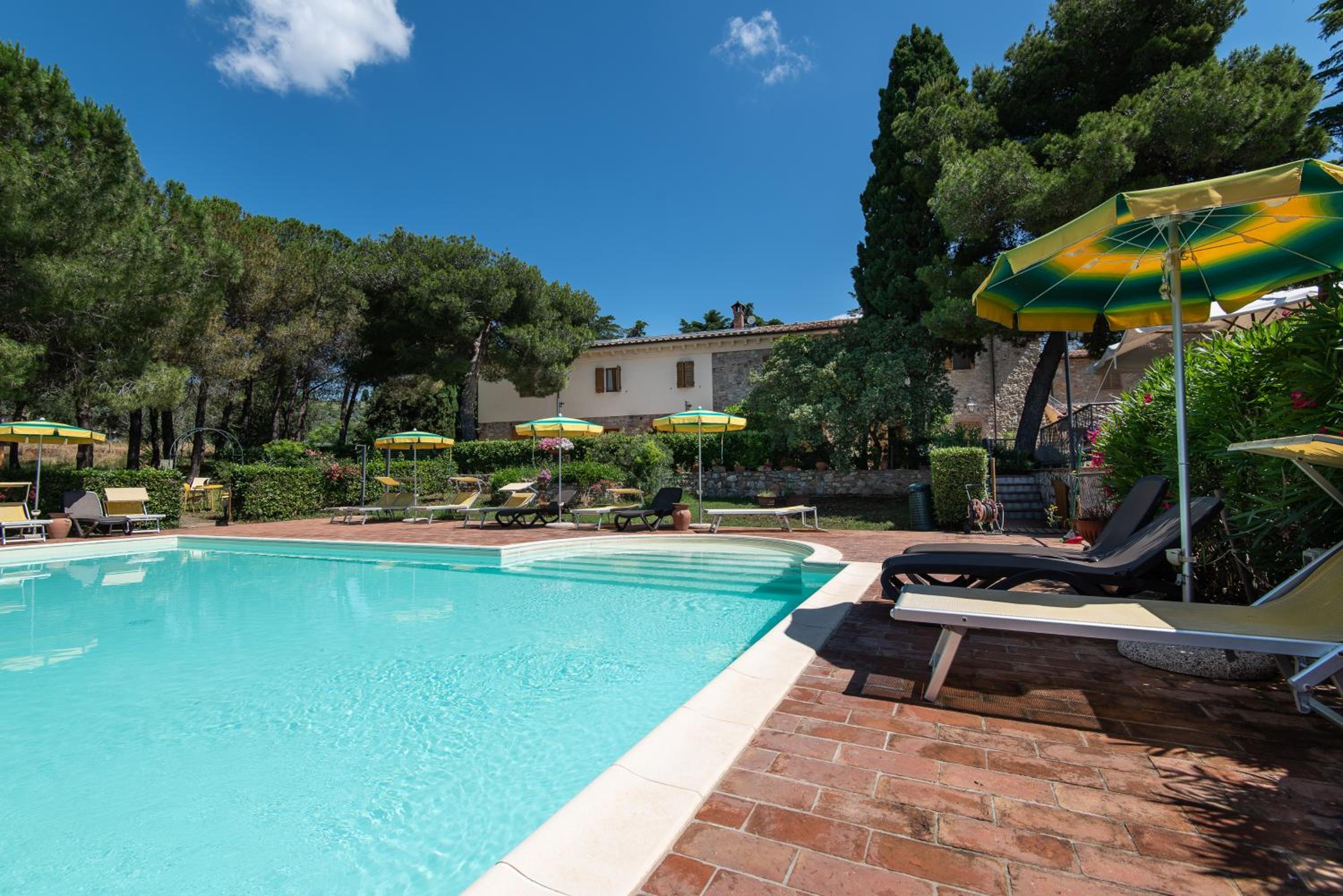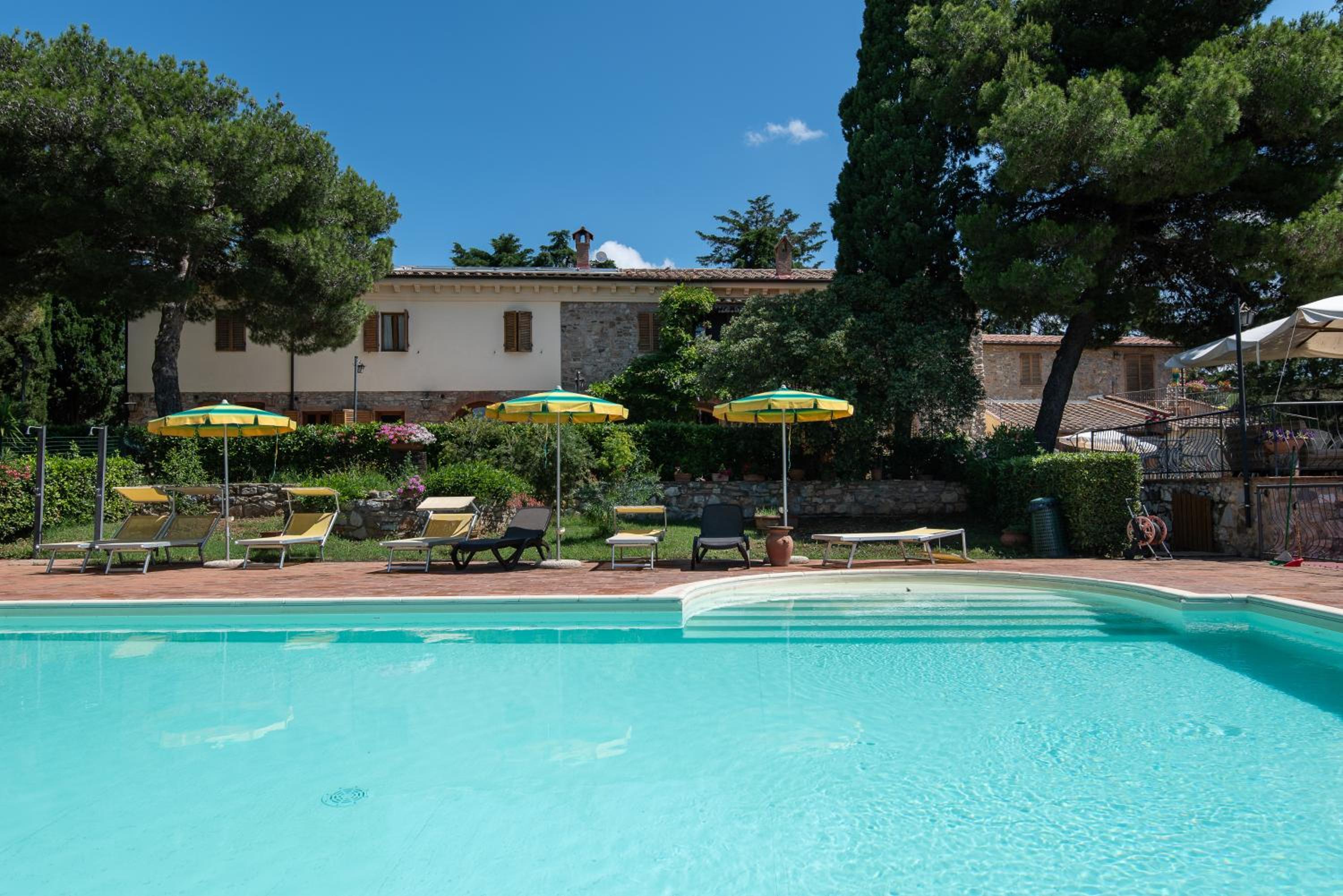 Unwind by the inviting swimming pool surrounded by lush greenery, complete with parasols and sun loungers for ultimate relaxation. The peaceful atmosphere is perfect for a leisurely day under the Tuscan sun.