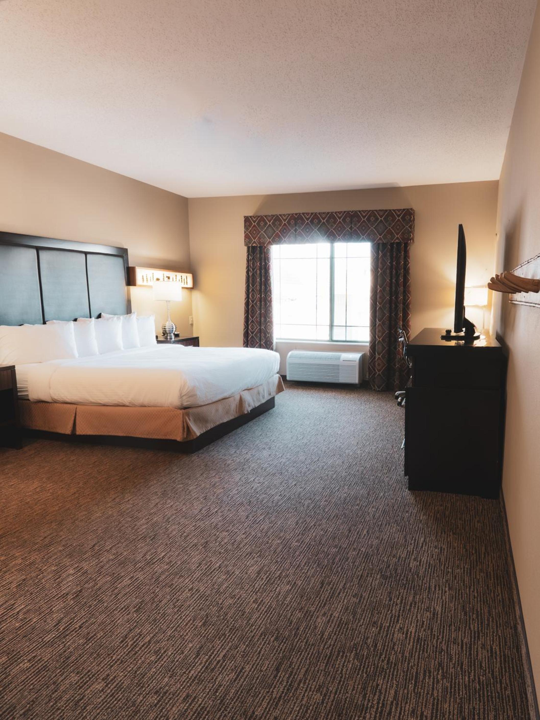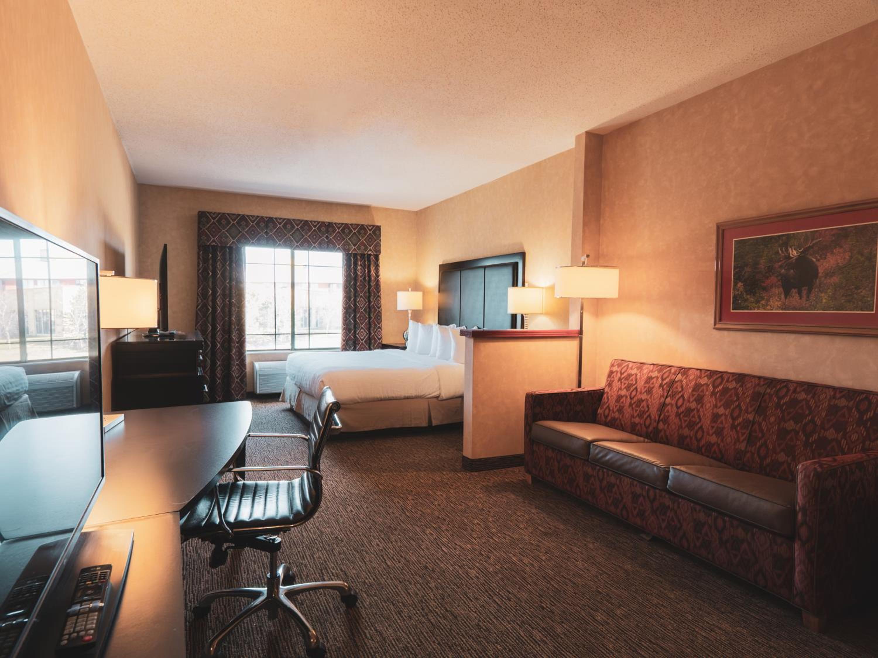 Luxurious Amenities: Dive into relaxation with our indoor pool and hot tub, perfect for unwinding after a long day of travel. Enjoy modern comforts in our wilderness themed rooms, each equipped with a flat-screen TV, refrigerator, and desk.