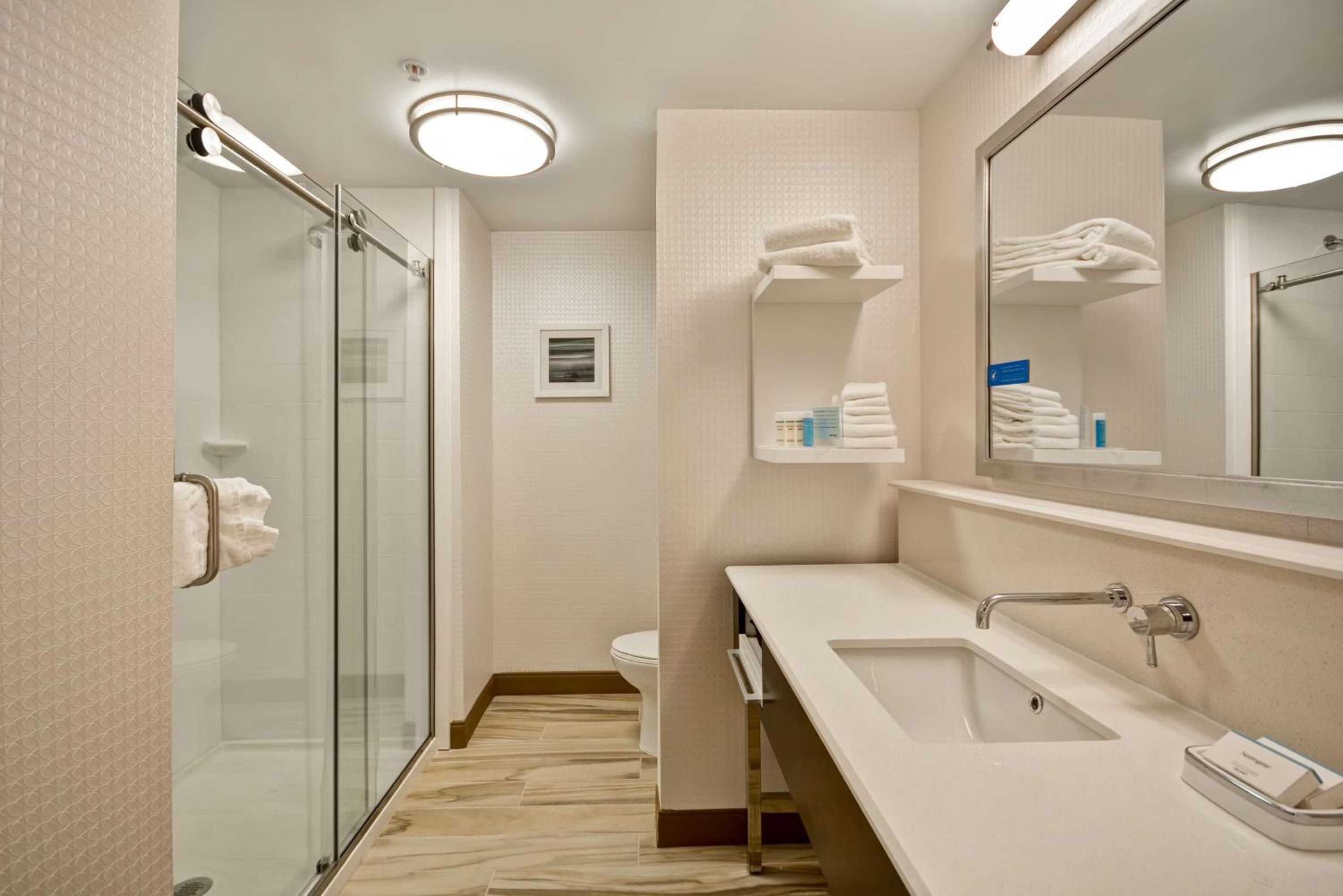 Room design. Large Bathroom with a stand up shower. Ample room space.